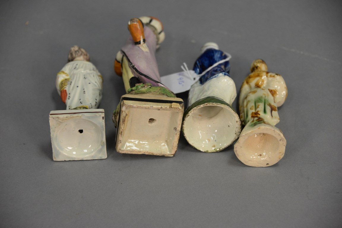 Lot 282: Four Staffordshire classical figures to include one pearlware or creamware of a girl holding a bird, a gentleman with a blue coat on…
