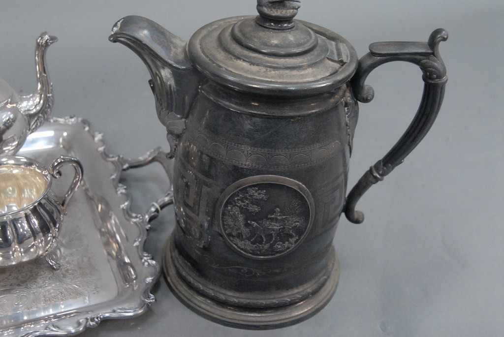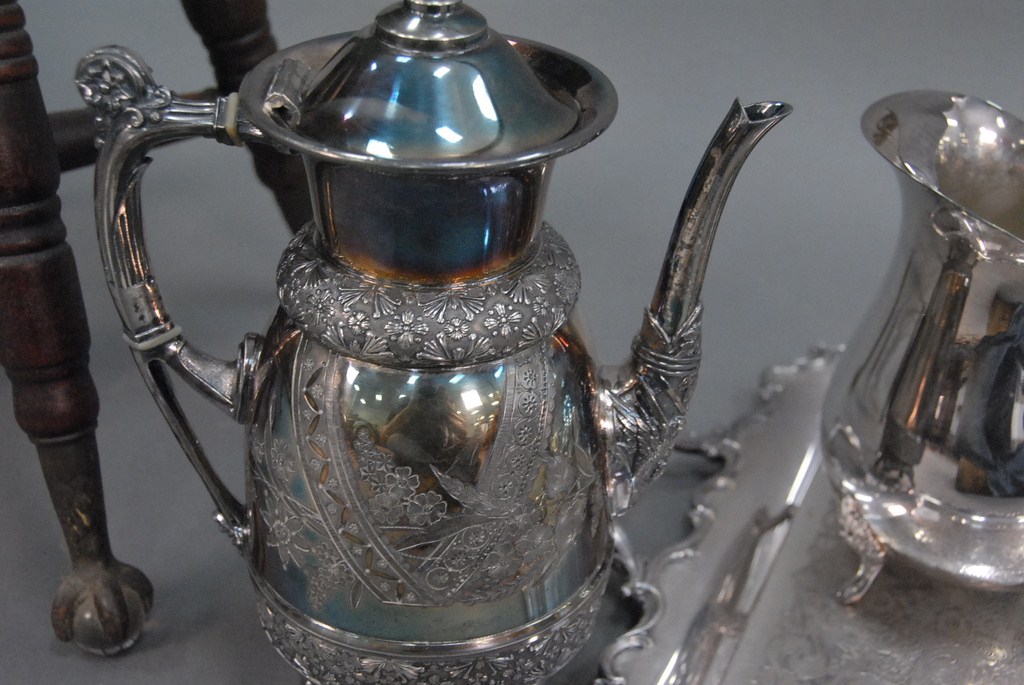 Group lot of silverplate teapot, water pitcher, tray, coffee pot, and hot water pot.