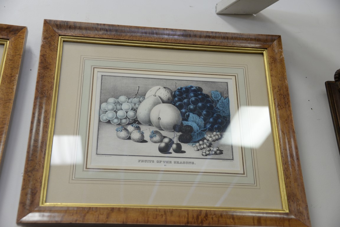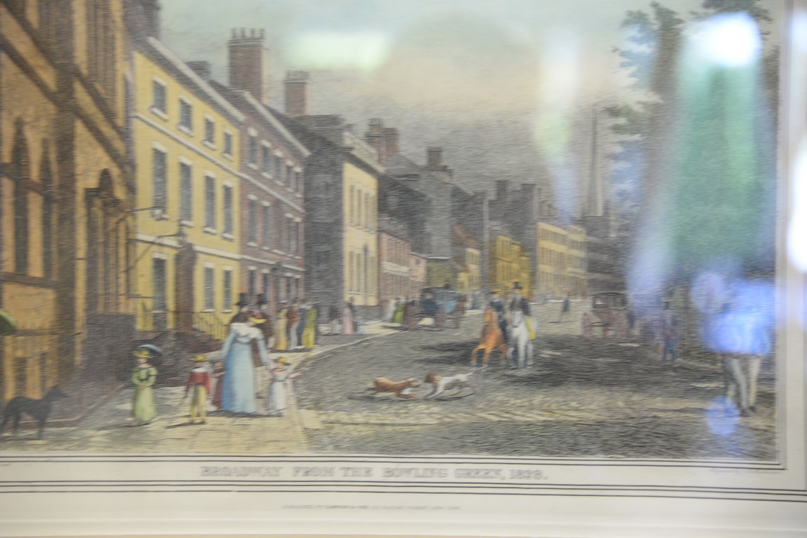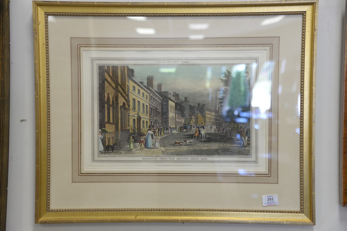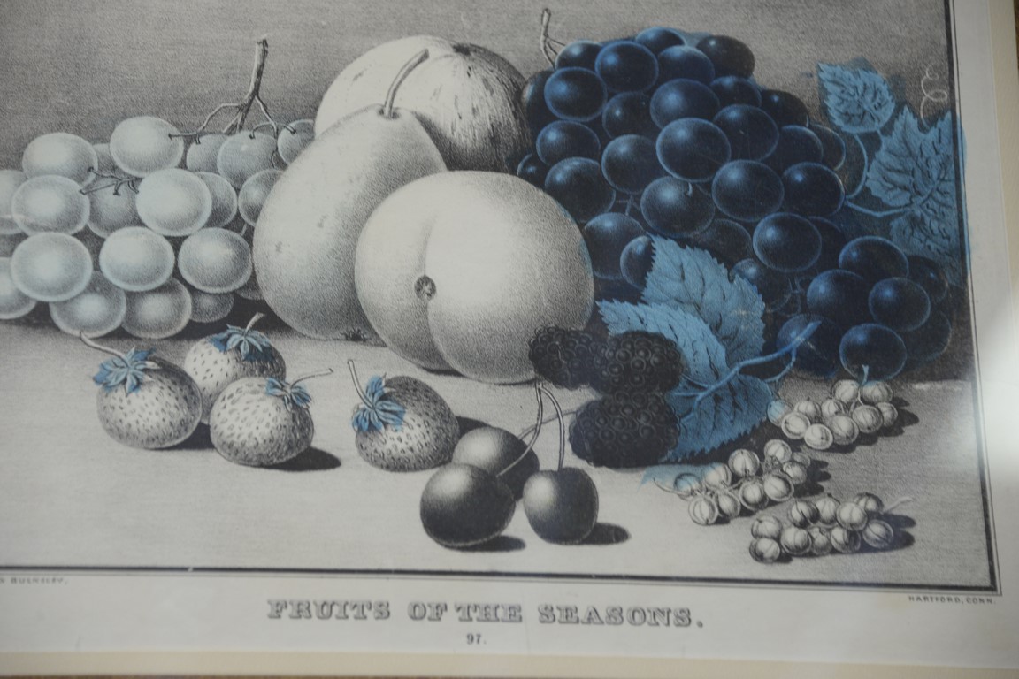 Group of four hand colored lithographs including The Farmer’s Pets Kelloggs & Comstock, Caldwell, Lake George Kelloggs & Thayer, Broadway from the Bowling Green, 1828 after J. Bennett engraved by Hutchinson and published by Currier & Ives, and Fruits of the seasons Kellogg. ss 9 1/2 x 12 1/2 to 11 3/4 x 17 3/4 Provenance: Property from Credit Suisse’s Americana Collection