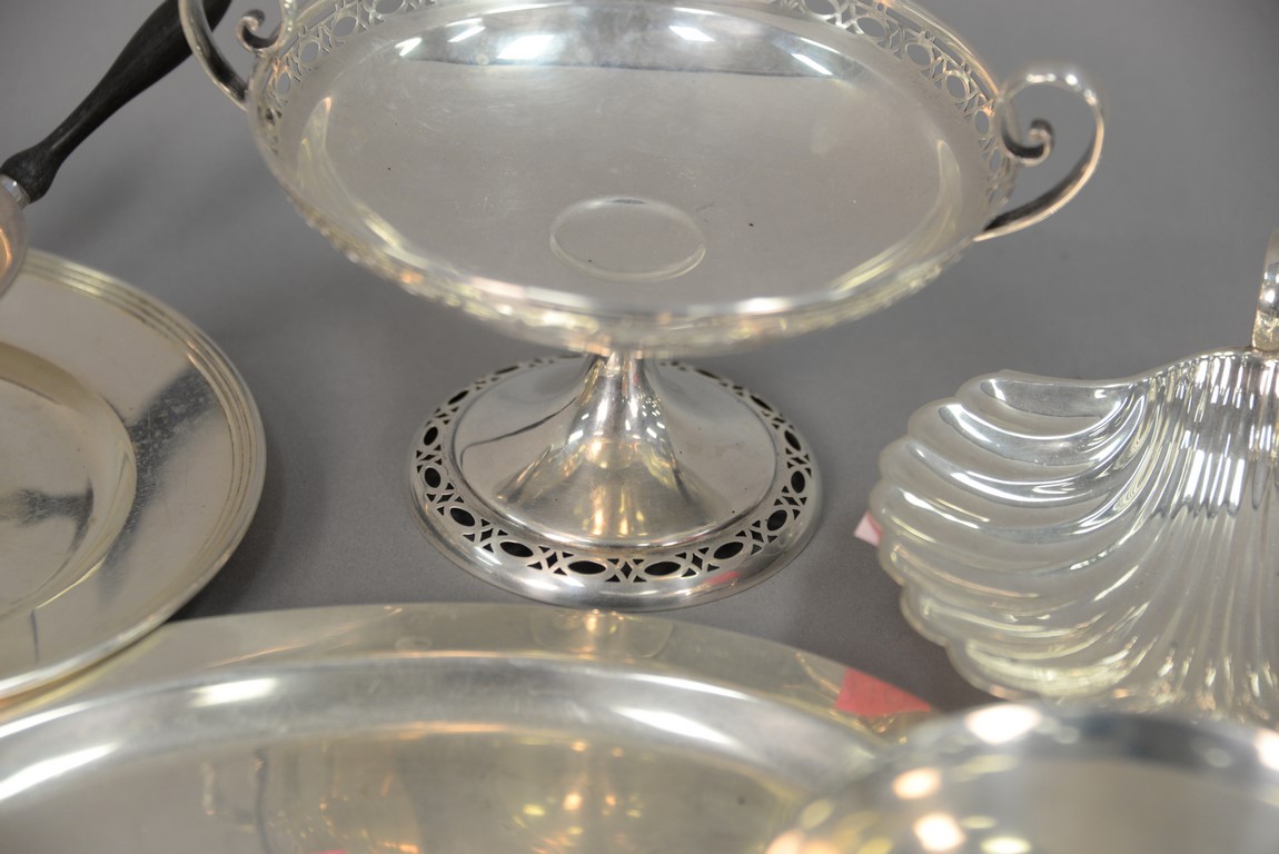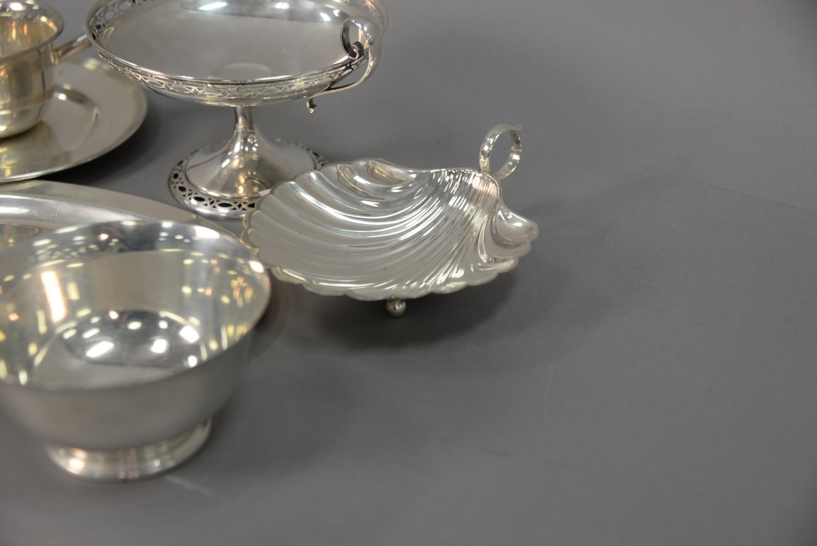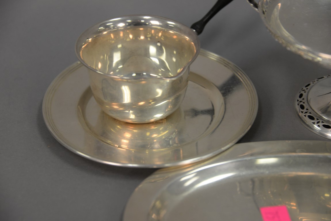 Lot 282: Group of sterling silver to include an oval tray, Revere style bowl, compote, shell dish, two saucers, and a pot with wood handle. 2…
