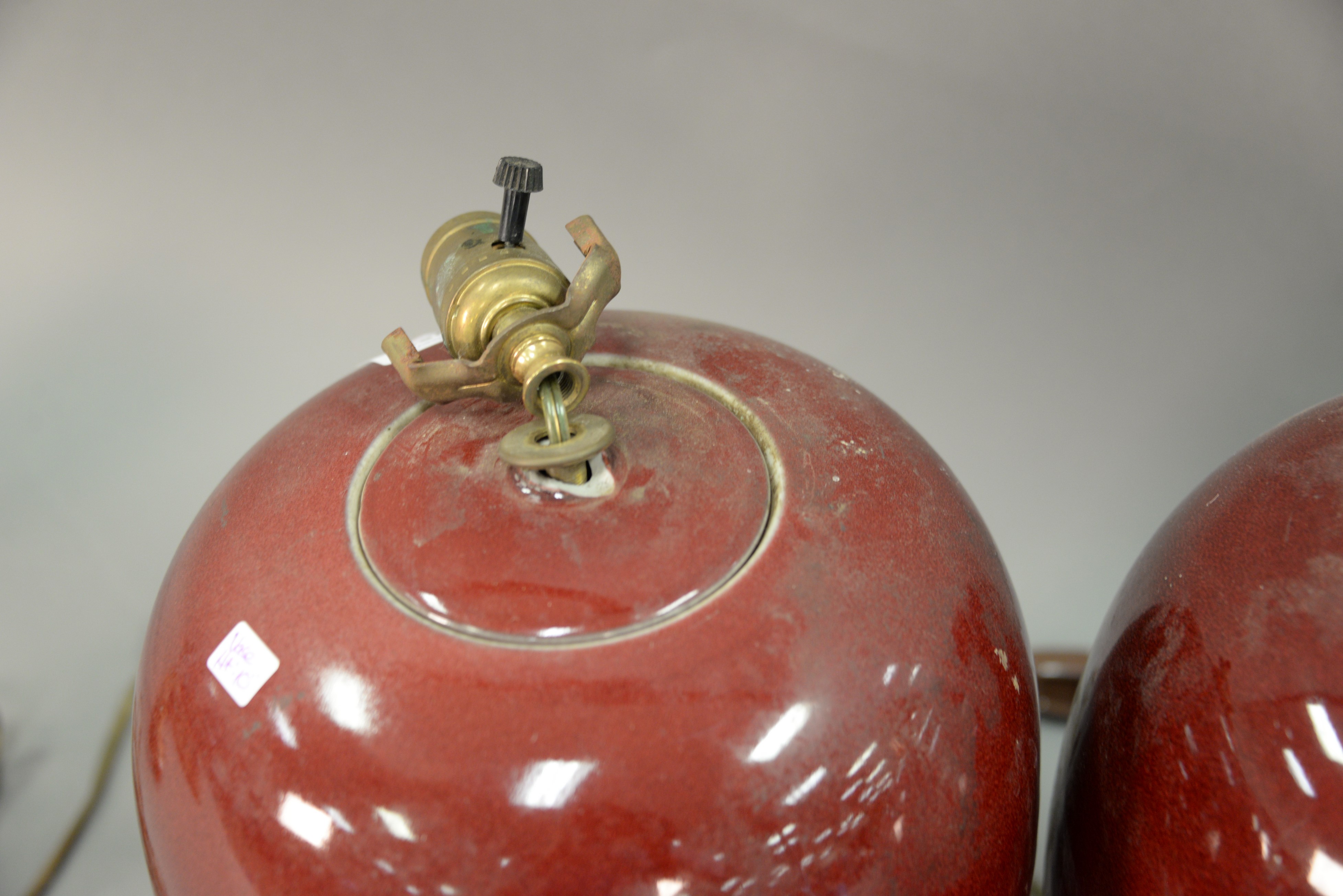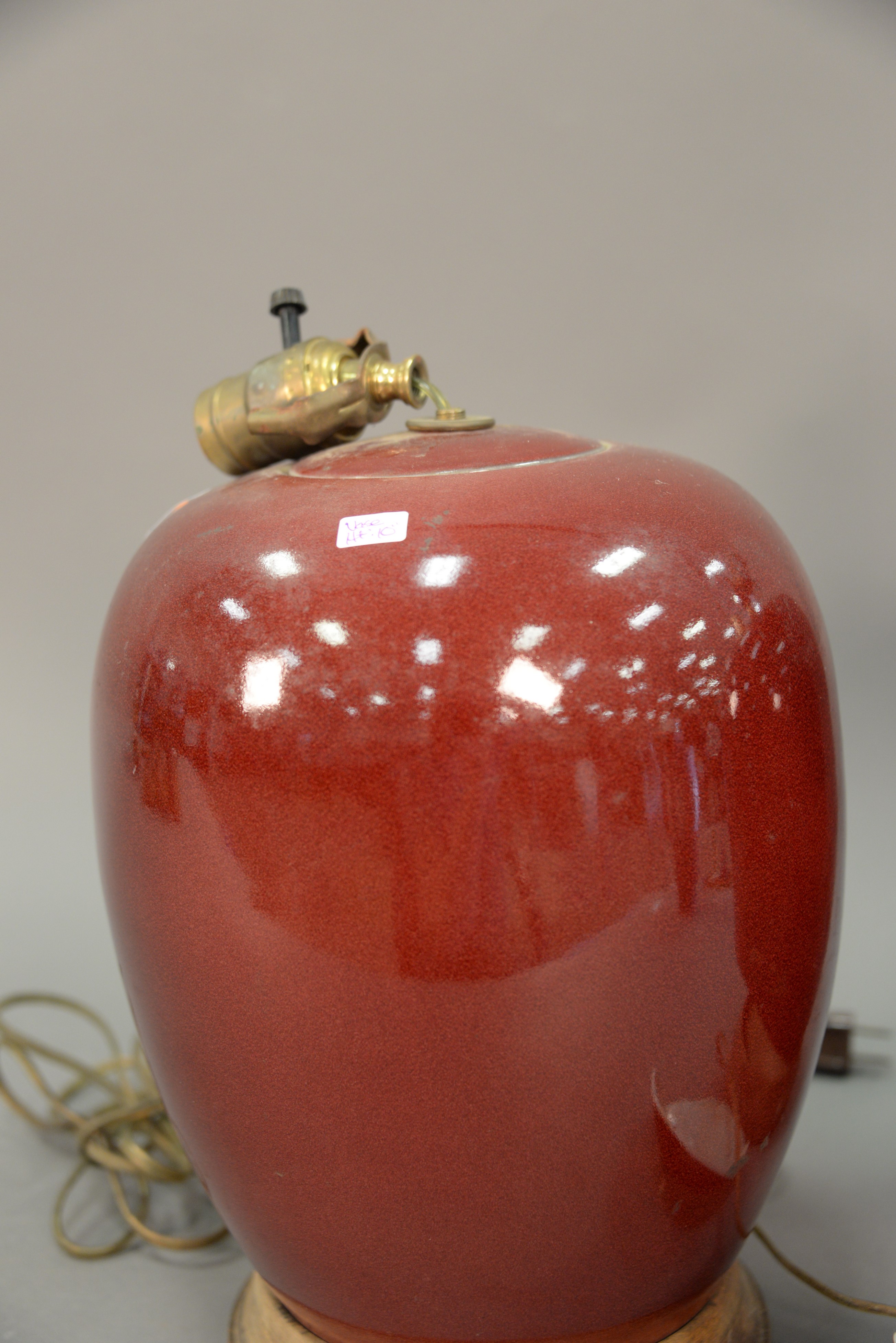 Lot 282: Group of three Chinese porcelain vases/jars made into table lamps including a pair of large Sang de Boeuf oxblood glazed jars dril…