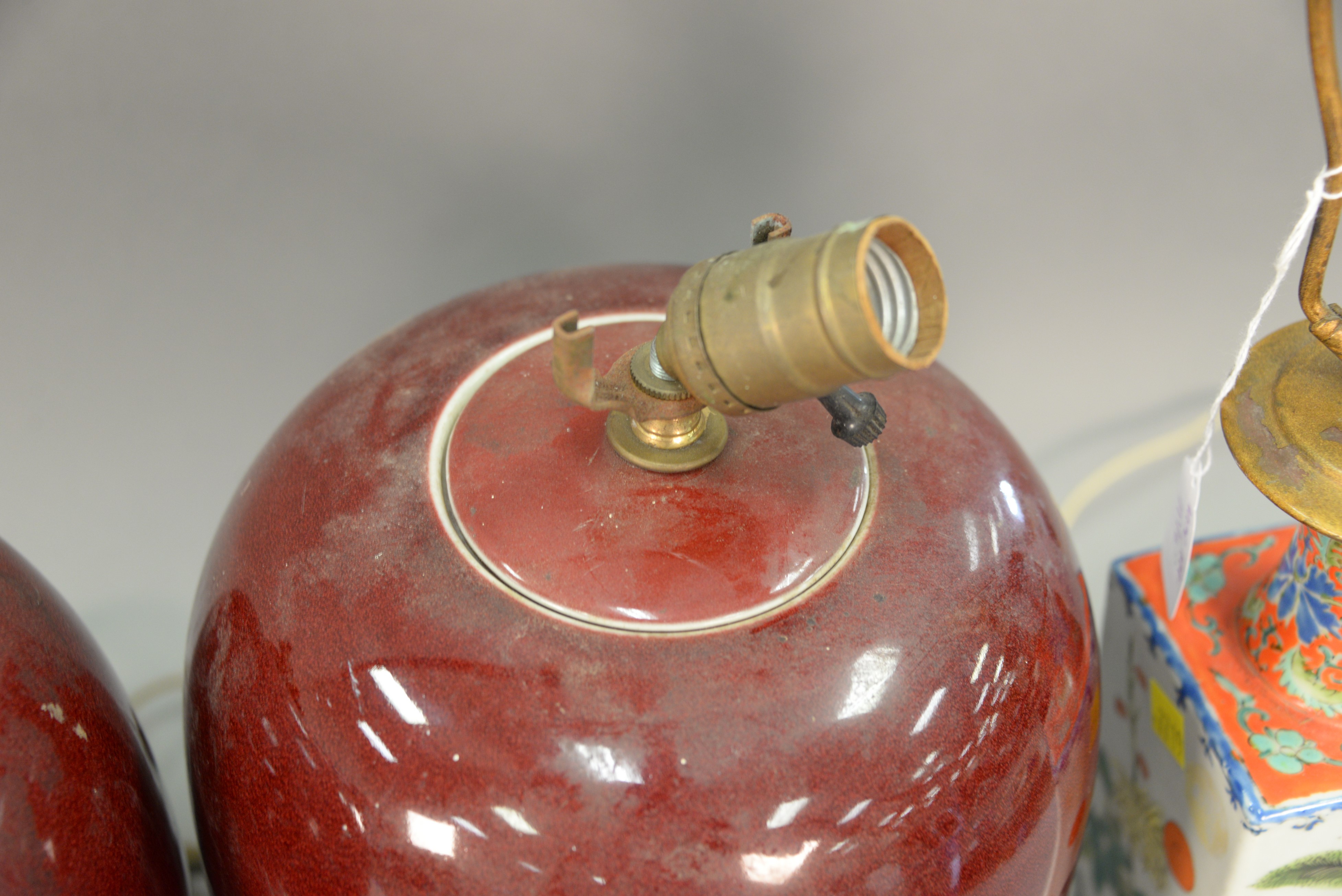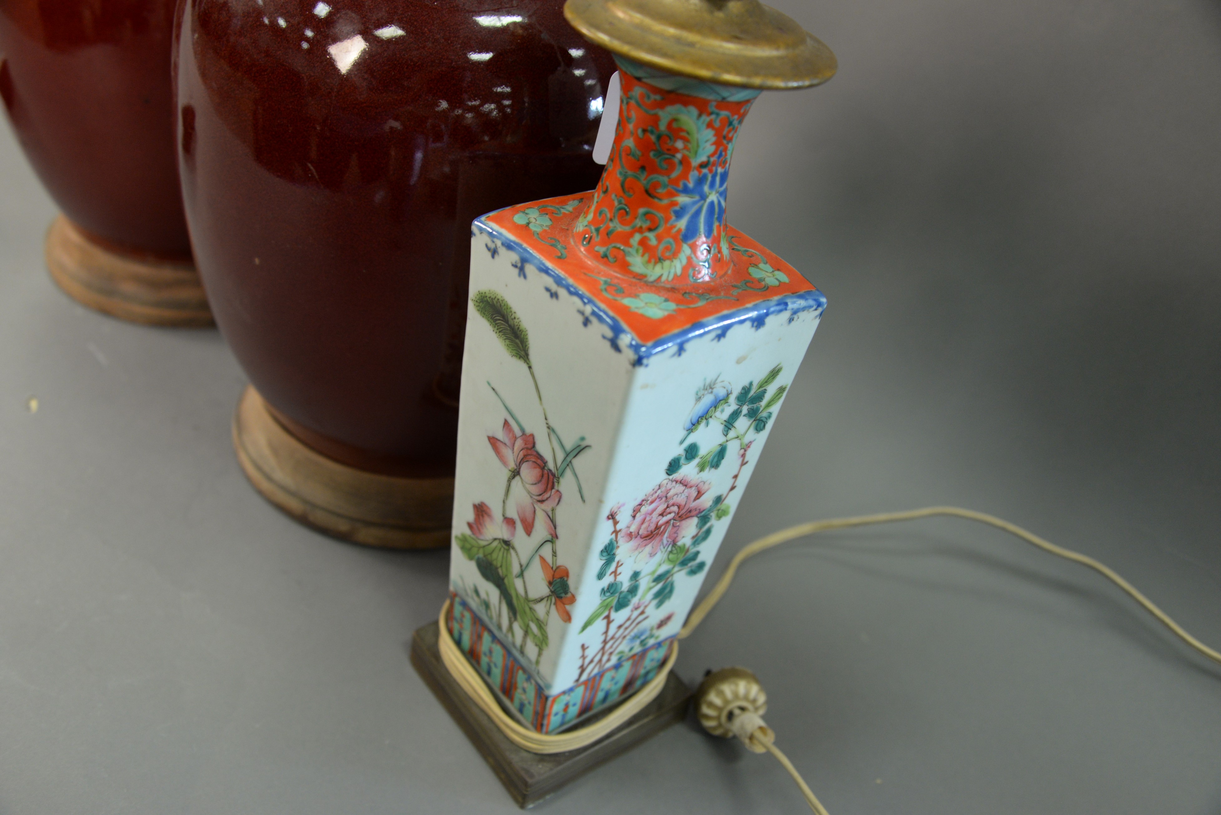 Group of three Chinese porcelain vases/jars made into table lamps including a pair of large Sang de Boeuf oxblood glazed jars drilled one cracked in half and a Famille Rose square vase drilled. vase hts. 10 in. & 11 1/2 in.