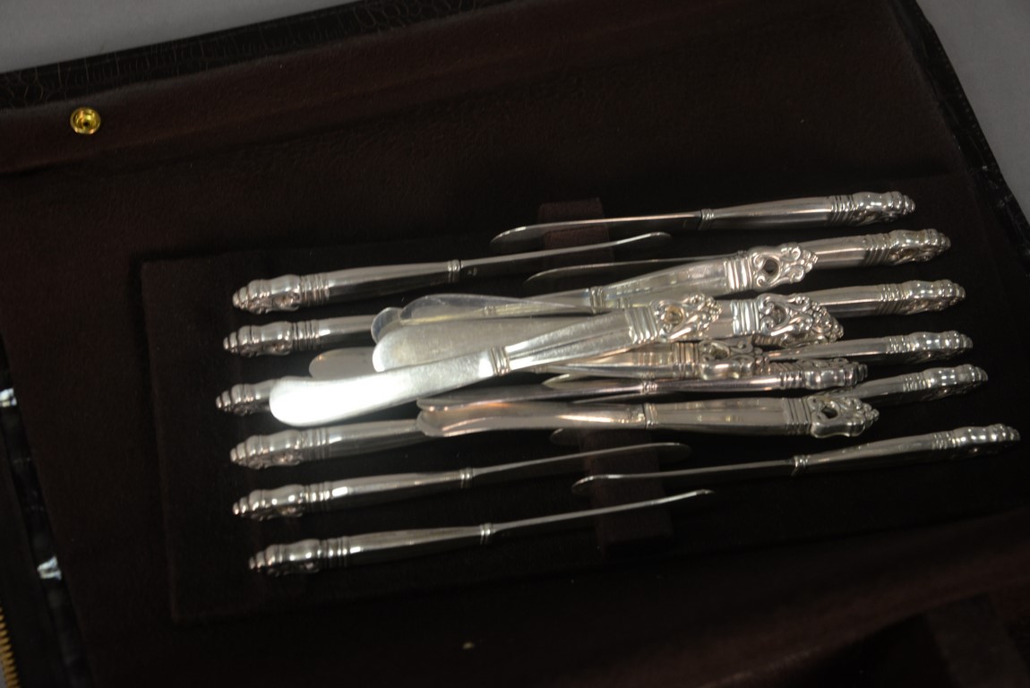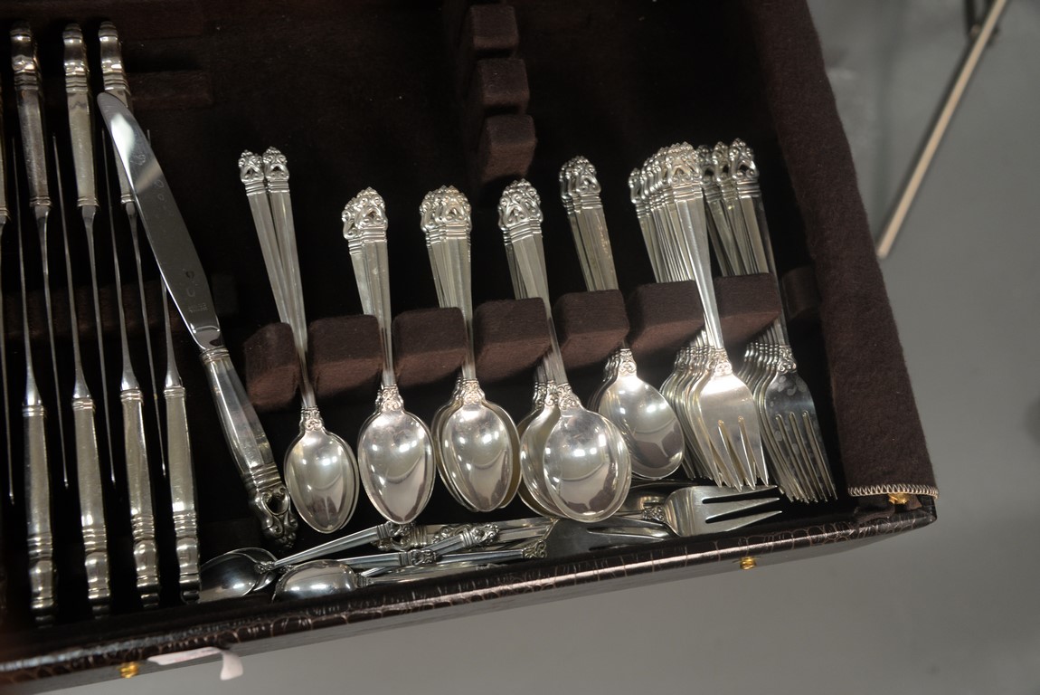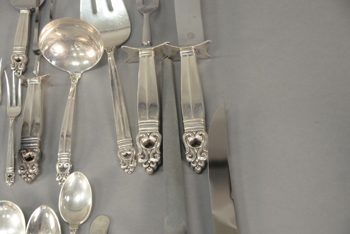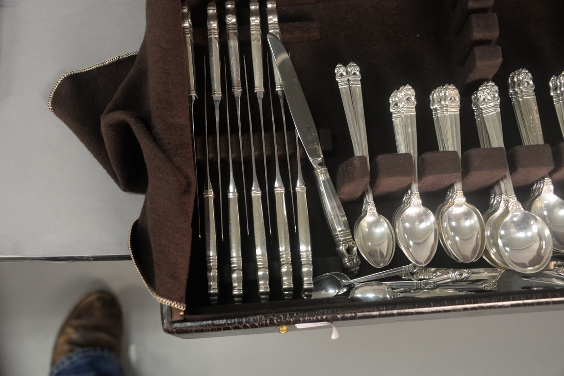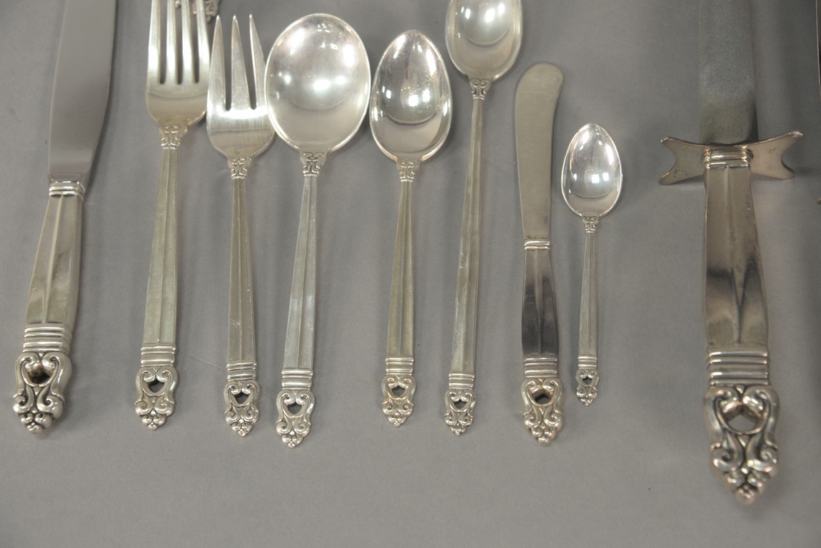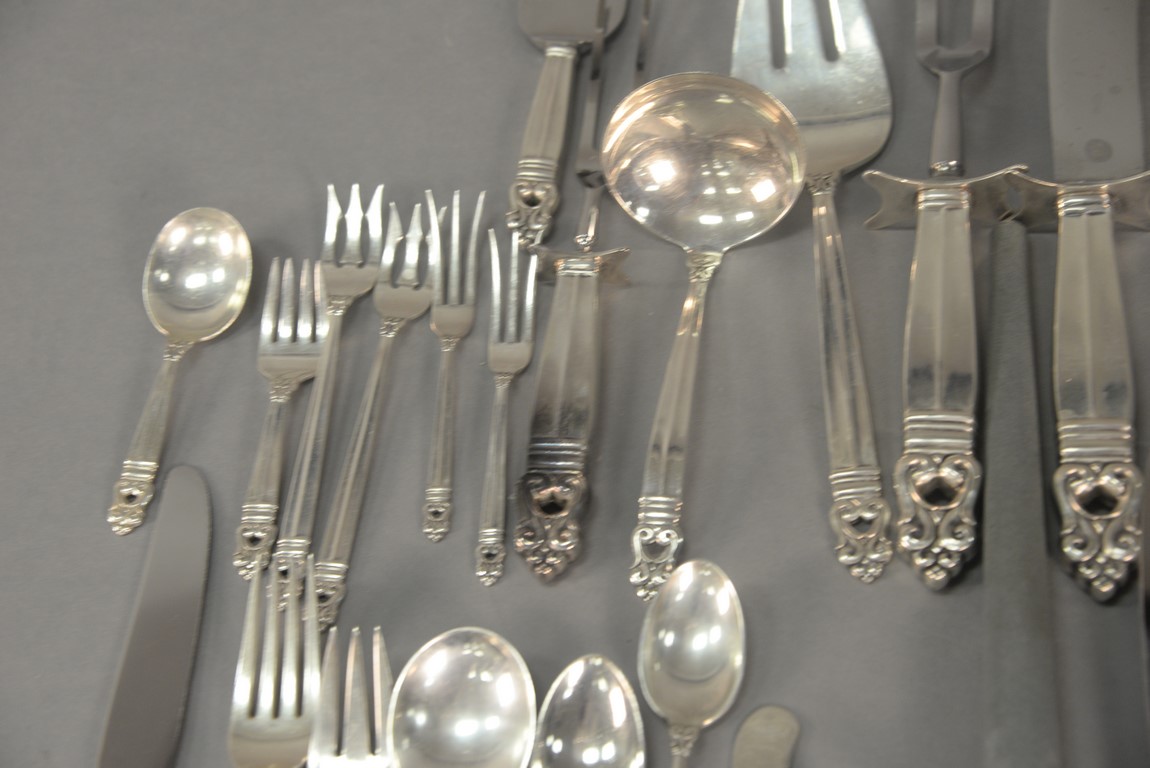 Lot 282: International Royal Danish sterling silver flatware set, 143 pieces to include 12 lunch forks, 22 salad forks, 20 soup spoons, 28 te…