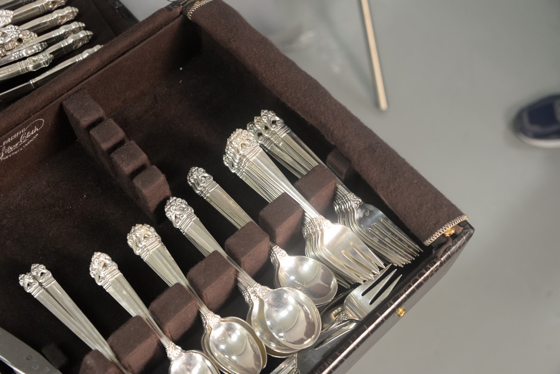 International Royal Danish sterling silver flatware set, 143 pieces to include 12 lunch forks, 22 salad forks, 20 soup spoons, 28 teaspoons, 8 iced teaspoons, 12 knives, 20 butter knives, 8 demitasse spoons, 2 piece baby set, 4 hors d’oeuvres forks, 1 large serving fork, 1 ladle, and five piece cutlery set. total weight 160 t oz. plus 17 handles