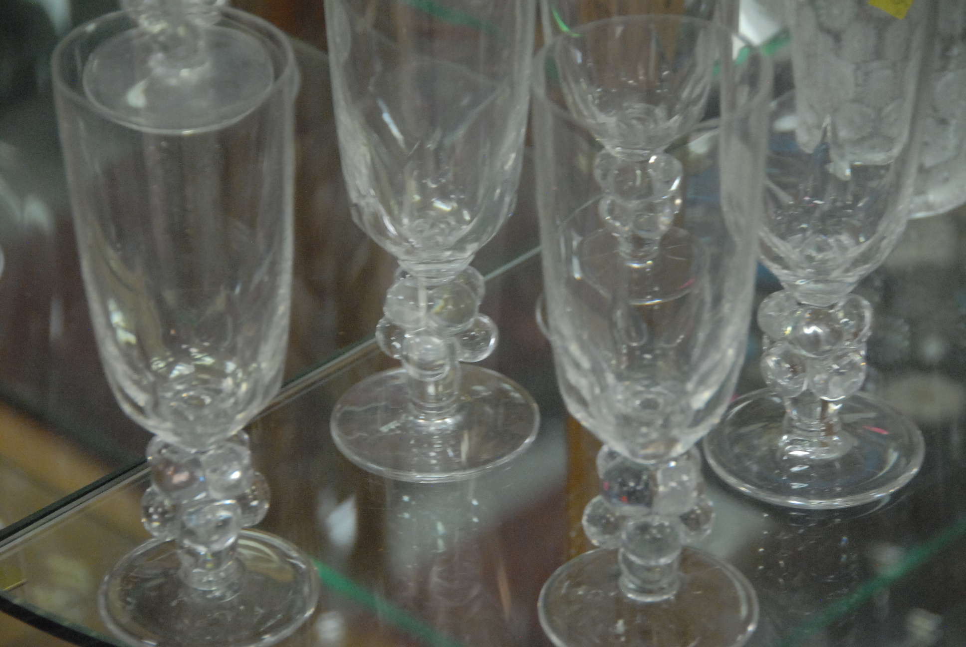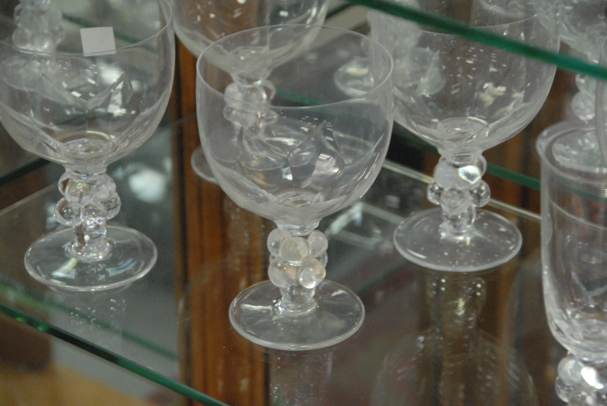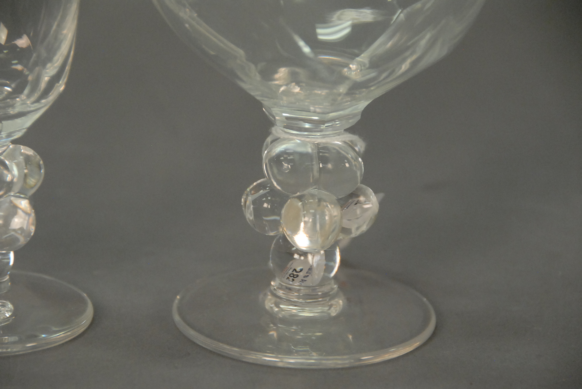 Lot 282: Lalique part stemware service including 7 flutes and 6 goblets, late 20th century. goblets: ht. 6 1/4in. flutes: ht. 6 5/8in.
