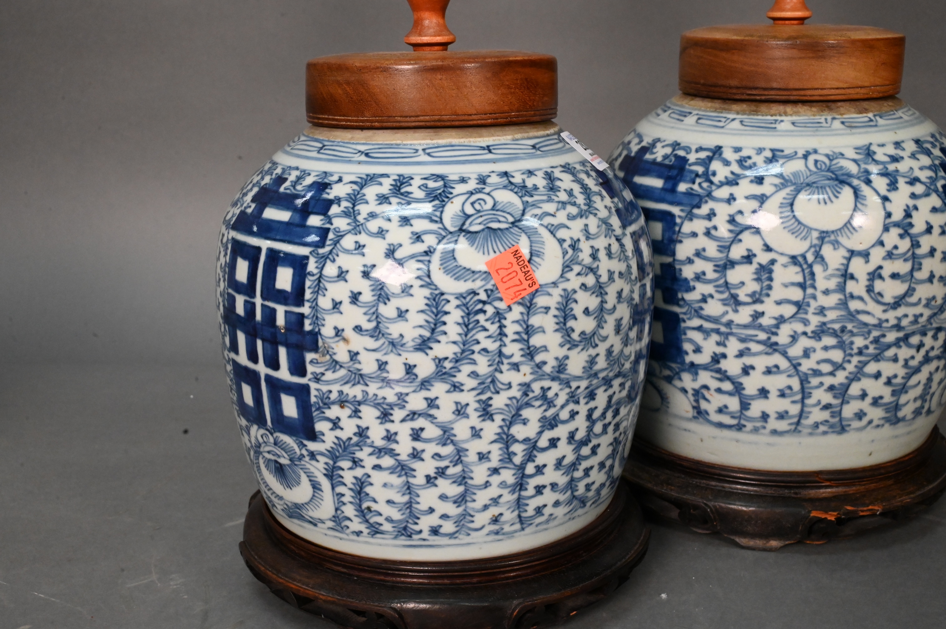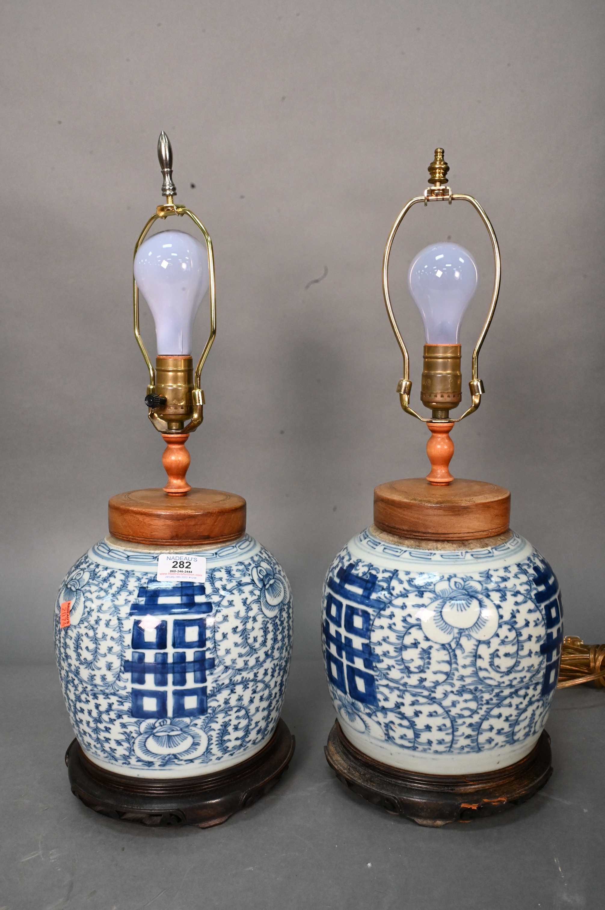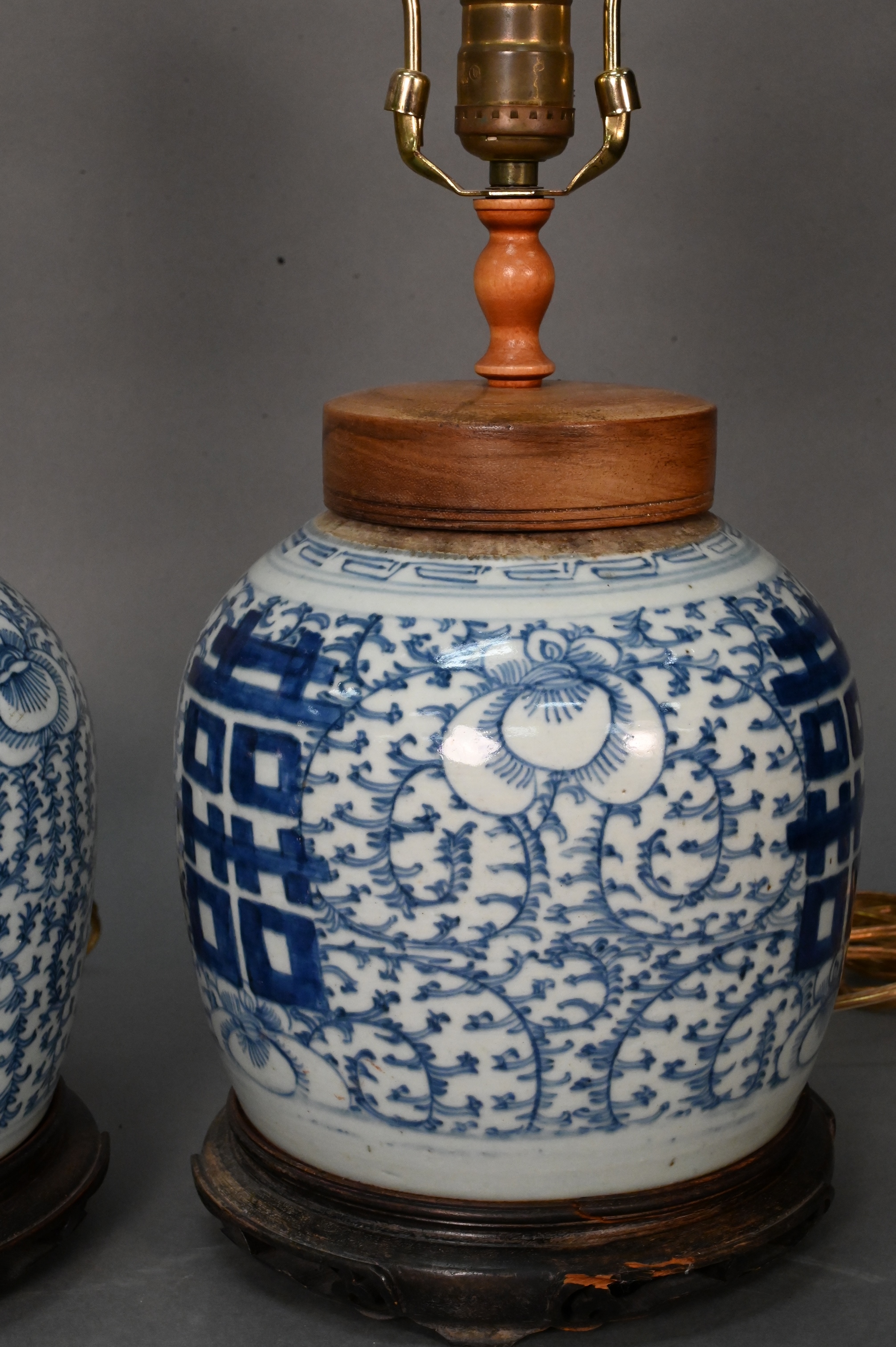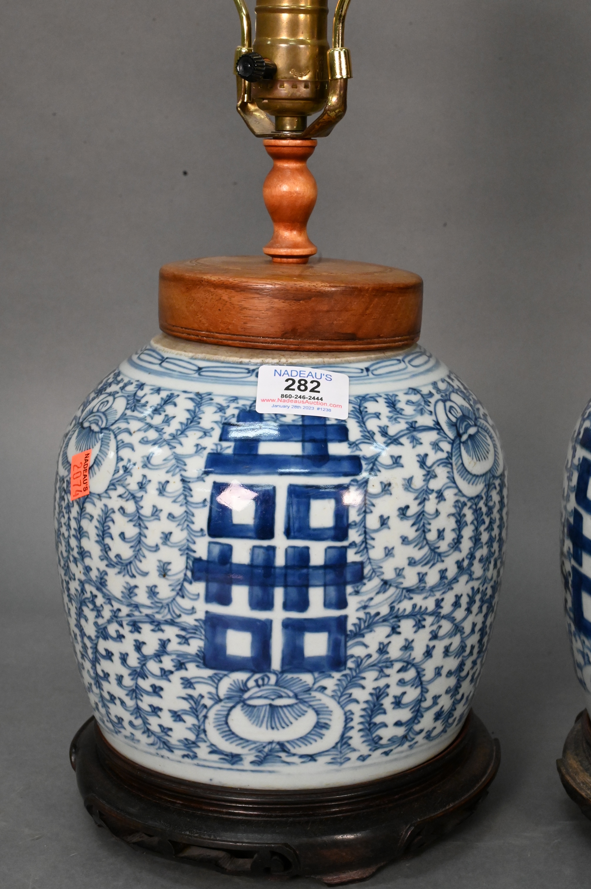 Pair of Blue and White Asian Vases, turned into table lamps, vase height 7 inches, total height 23 inches.