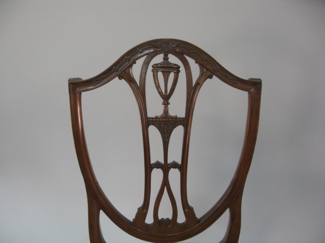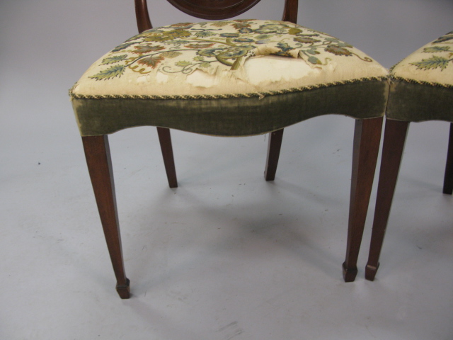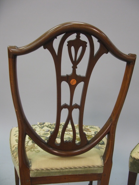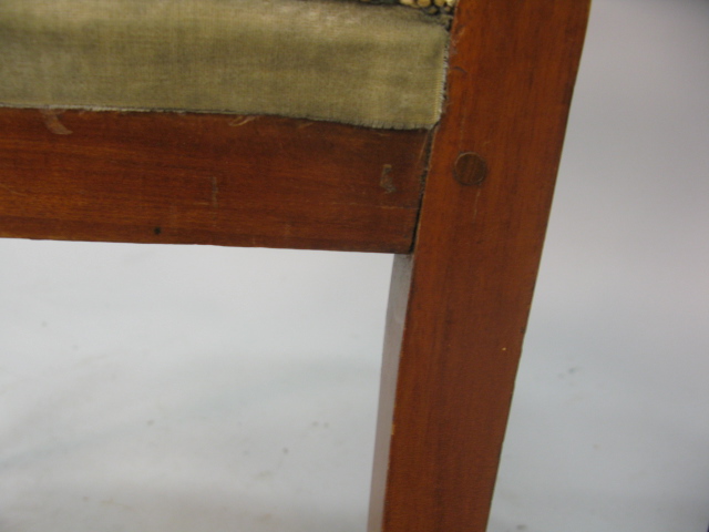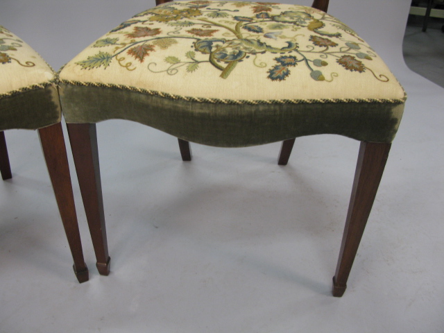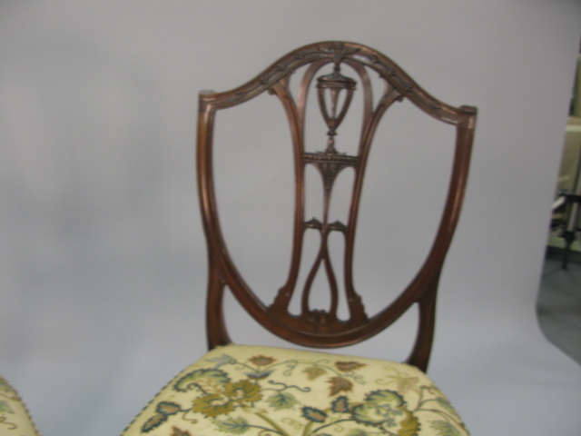 Pair of Federal style mahogany side chairs with pierce urn carved backs shaped fully upholstered seats on square tapered legs ending in spade feet seats in old crewel work.