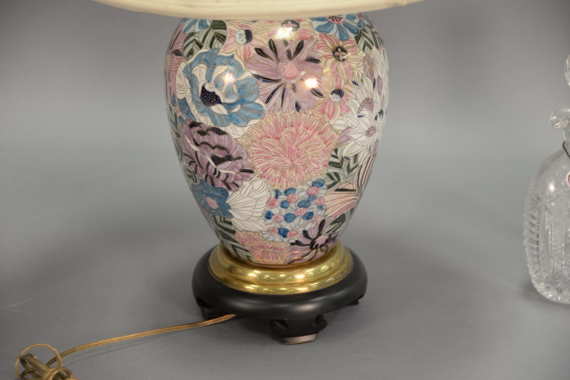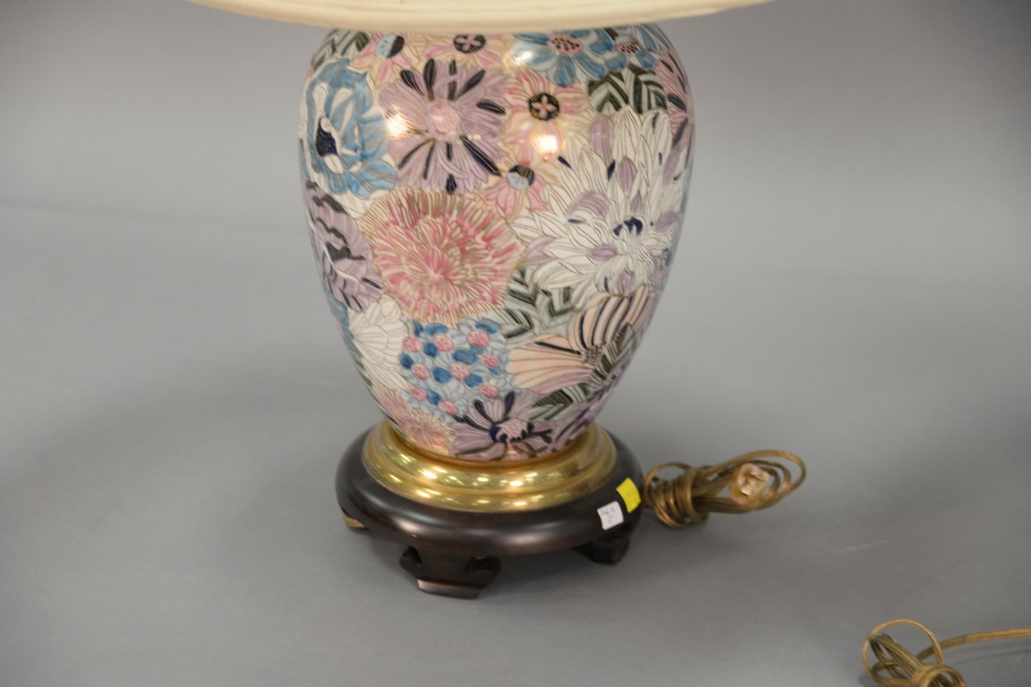 Pair of Oriental style porcelain lamps with custom shades, signed Cooper Lamps. ht. 29 in.
