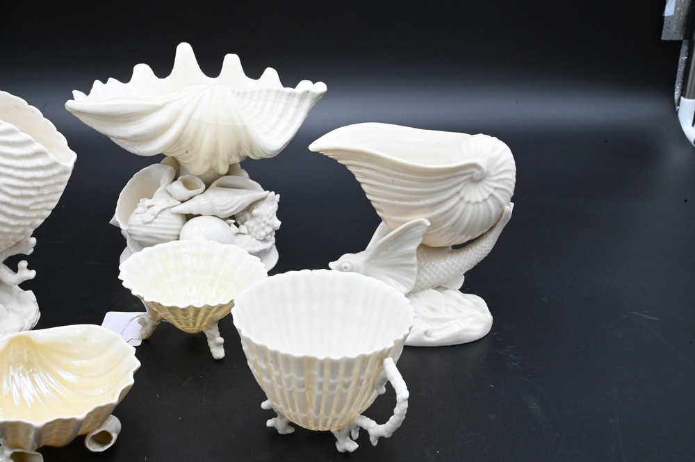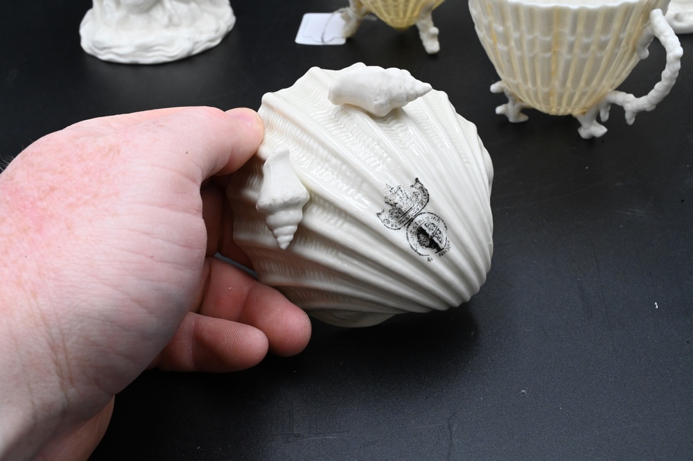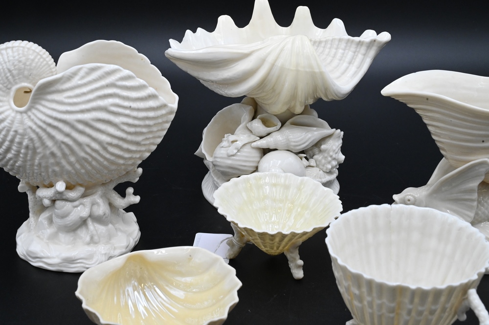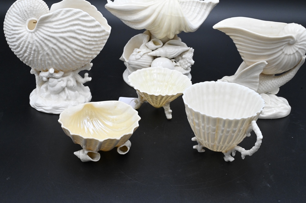 Six Belleek Shell Form Pieces, to include three compotes on shell and fish bases, along with three small shell dishes; all with black or blue marks; tallest vase 5 1/4 inches. Provenance: Collections of Norma Reilly, New Jersey.
