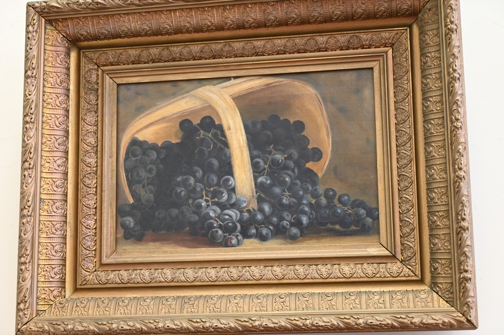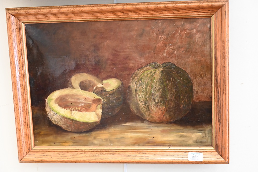 Lot 282: Three Piece Framed Group, to include a Train Station scene, oil on canvas, signed indistinctly lower right “Leopold…..Paris”; still life with melon, oil on canvas, signed on the reverse “L.E. Luitwieler”; along with basket of grapes, 19th century, oil on canvas, unsigned, largest 23 3/4″ x 19 3/4″.