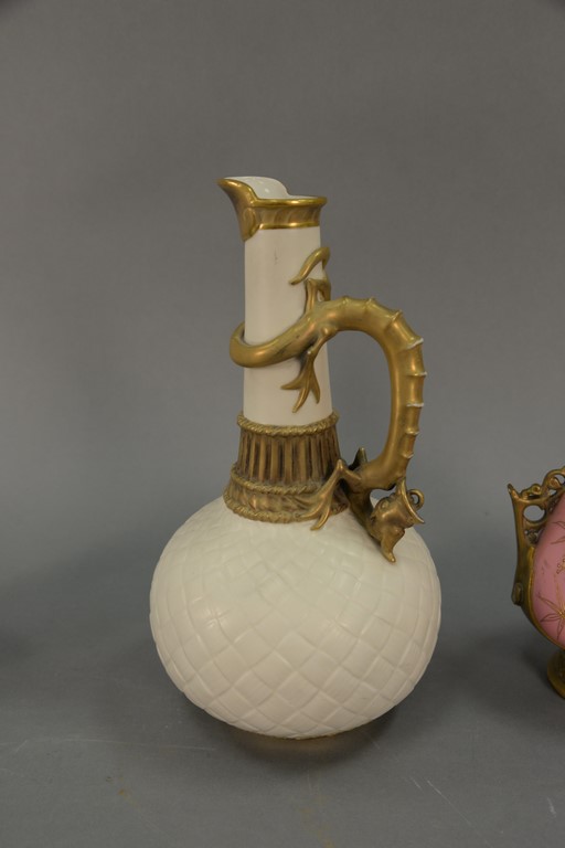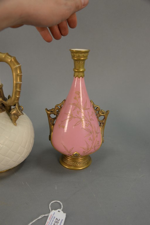 Two Royal Worcester porcelain vases including large white porcelain urn with gilt dragon and two handled pink vases with gilt decoration as is. ht. 12in. & 10in.