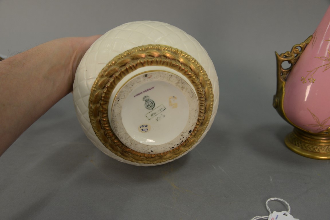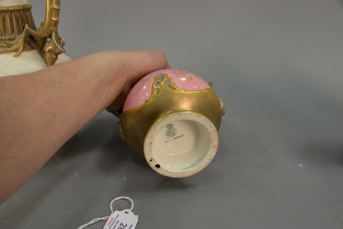 Lot 282: Two Royal Worcester porcelain vases including large white porcelain urn with gilt dragon and two handled pink vases with gilt decora…