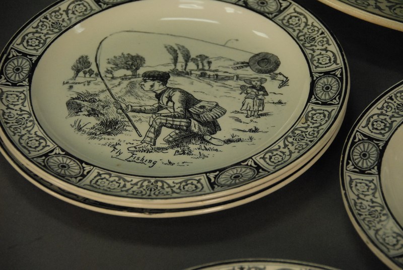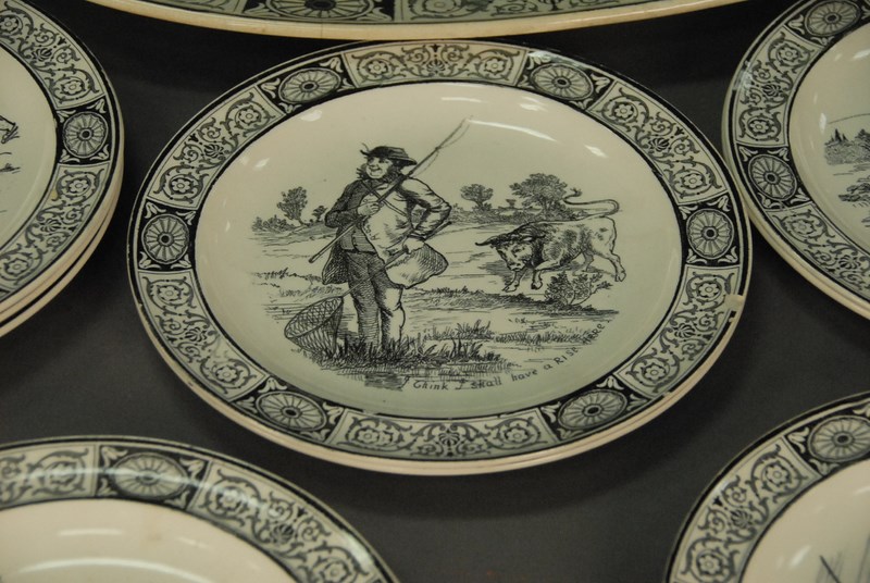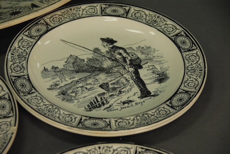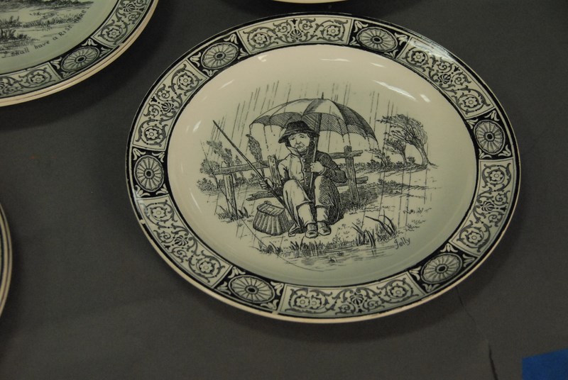 Wedgwood eleven piece fish set, each plate with comical fishing scenes small chips.