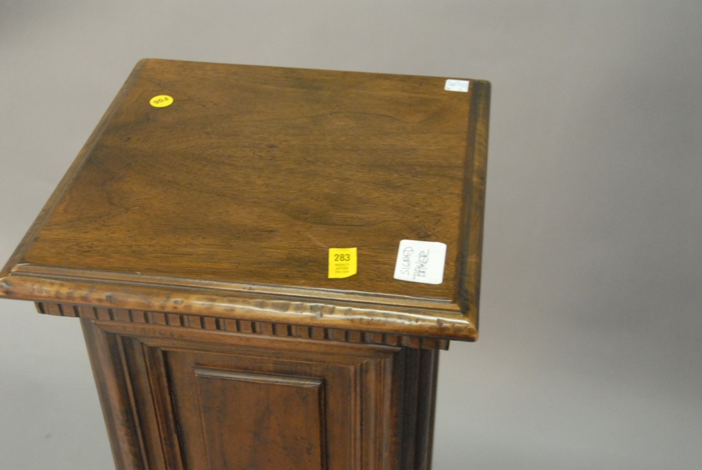Baker mahogany pedestal, ht. 42, top: 13 square, signed Baker.