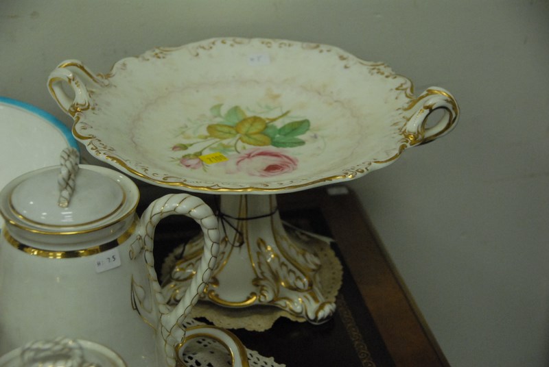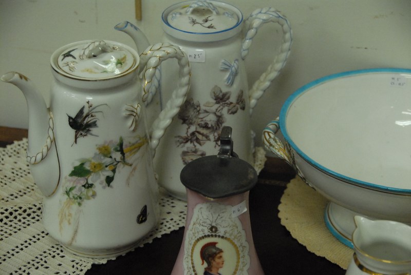 Group of nine porcelain items to include two Haviland Limoges tea pots, four piece set with coffee pot, creamer, sugar, and underplate, syrup, large blue rimmed footed bowl, and a large footed compote.