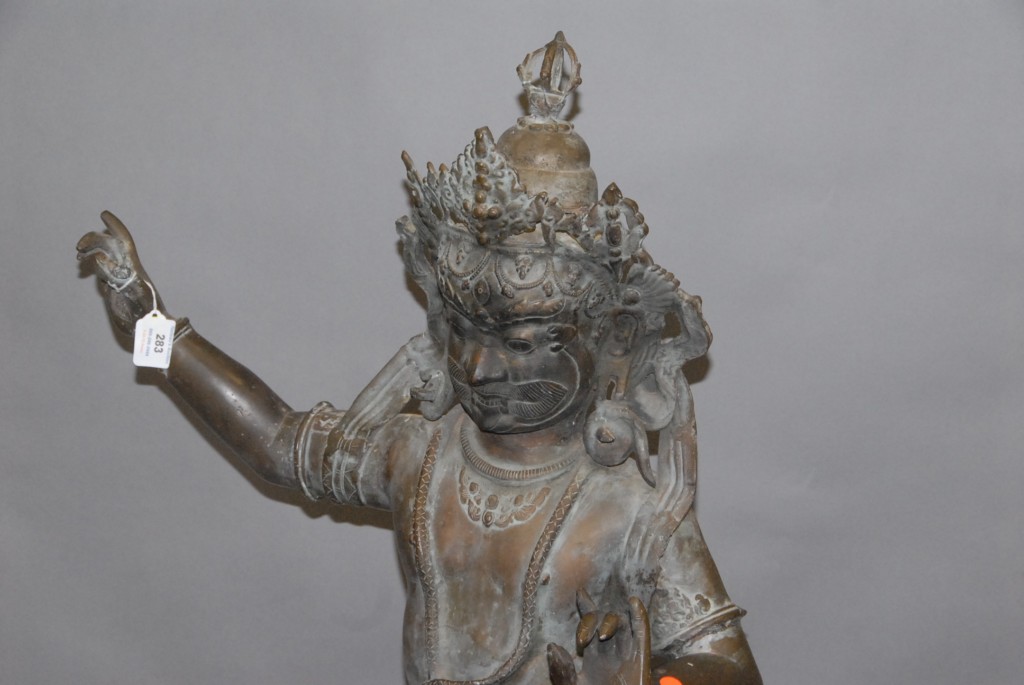 Lot 283: Large bronze Southeast Asian figure of Buddha standing on lotus base, probably Thai or Tibetan, ht. 37, wd. 28.