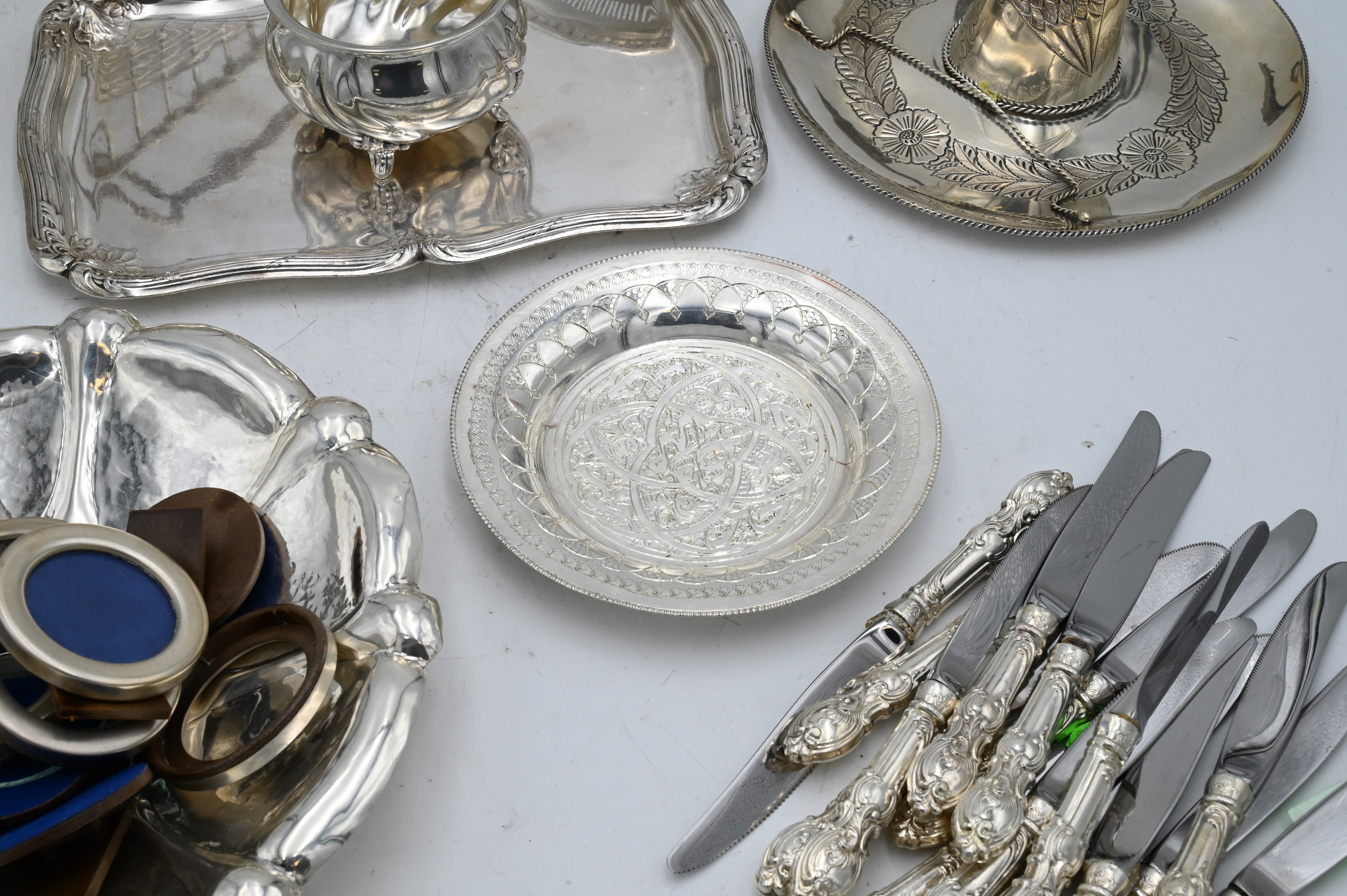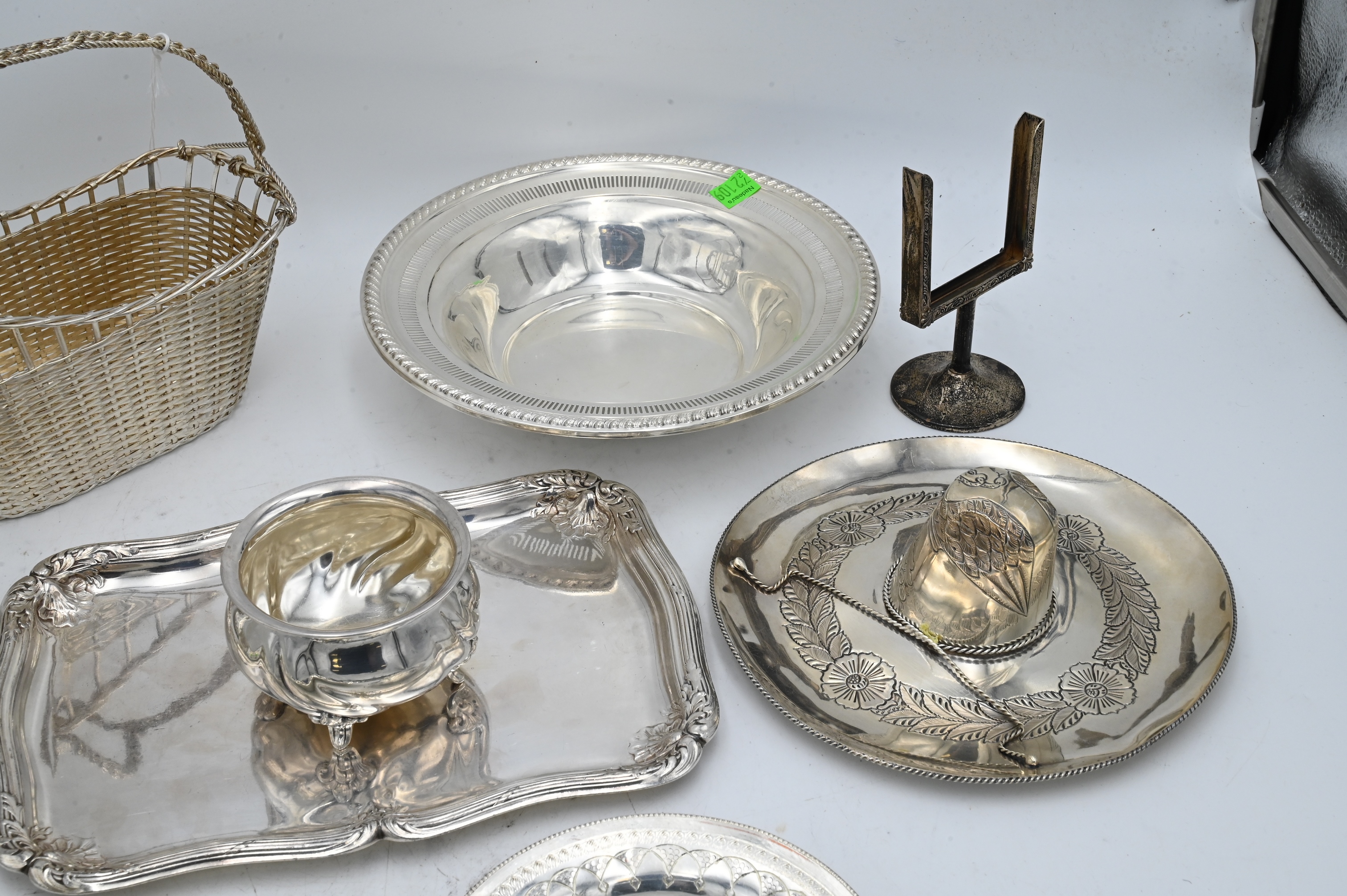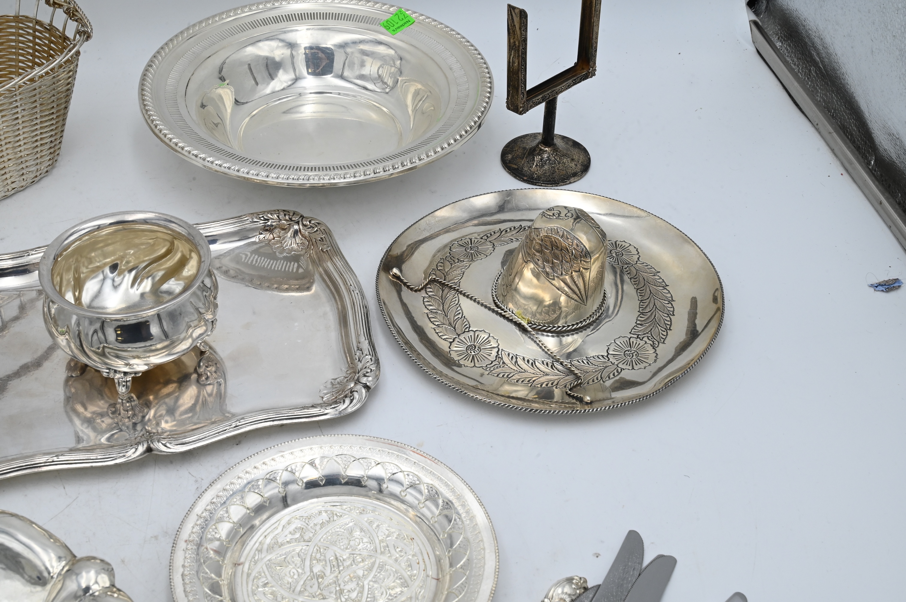 to include bowls, Mexican silver hat, 14 weighted knives, Christofle basket or wine caddy, etc