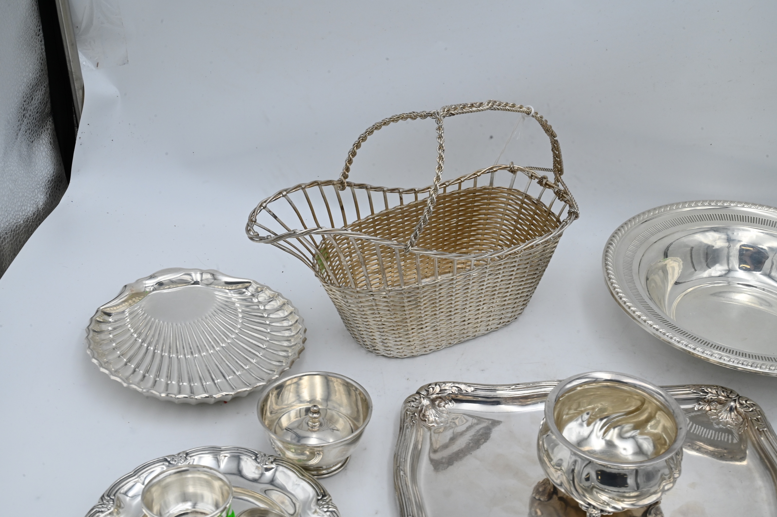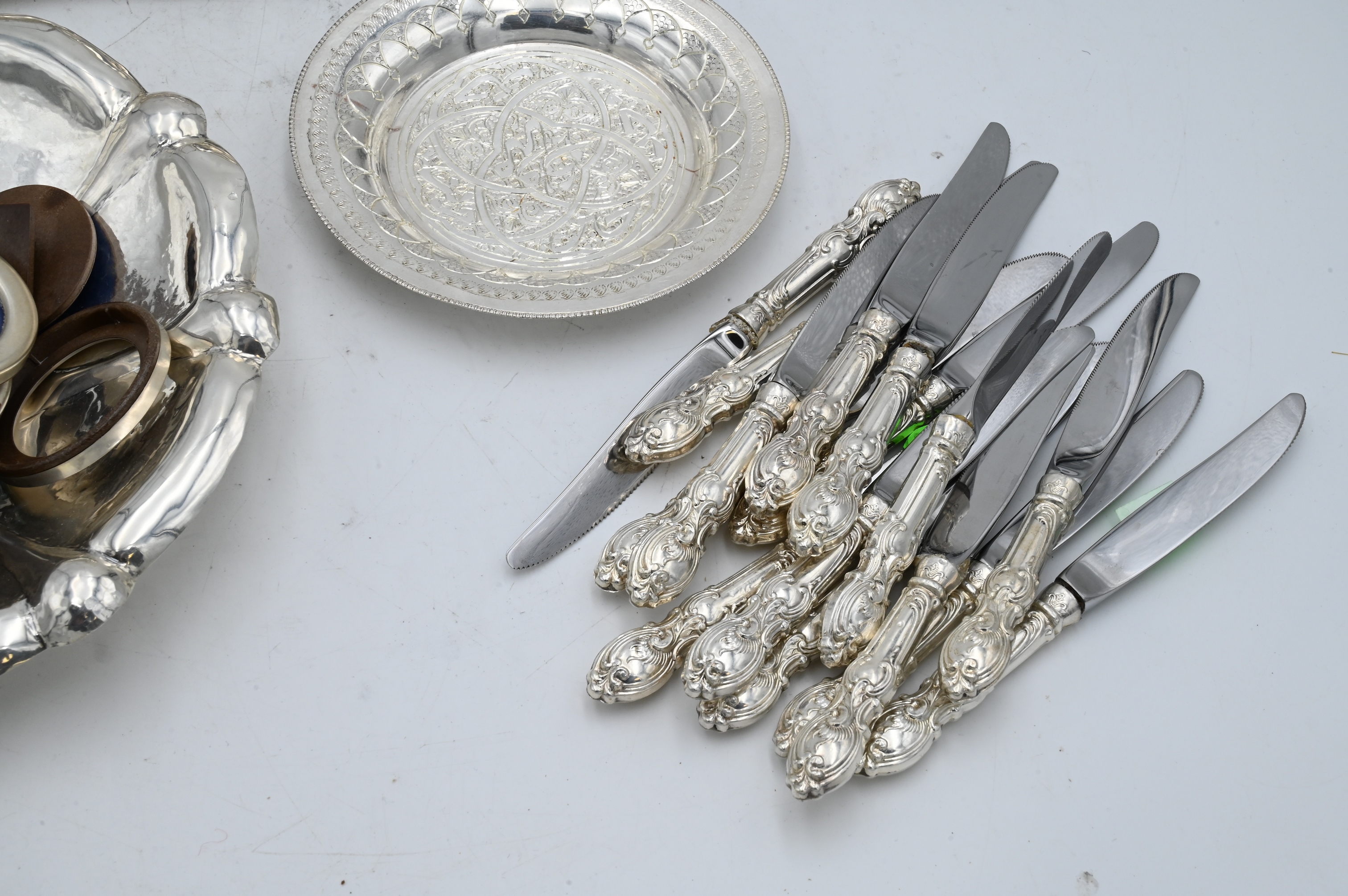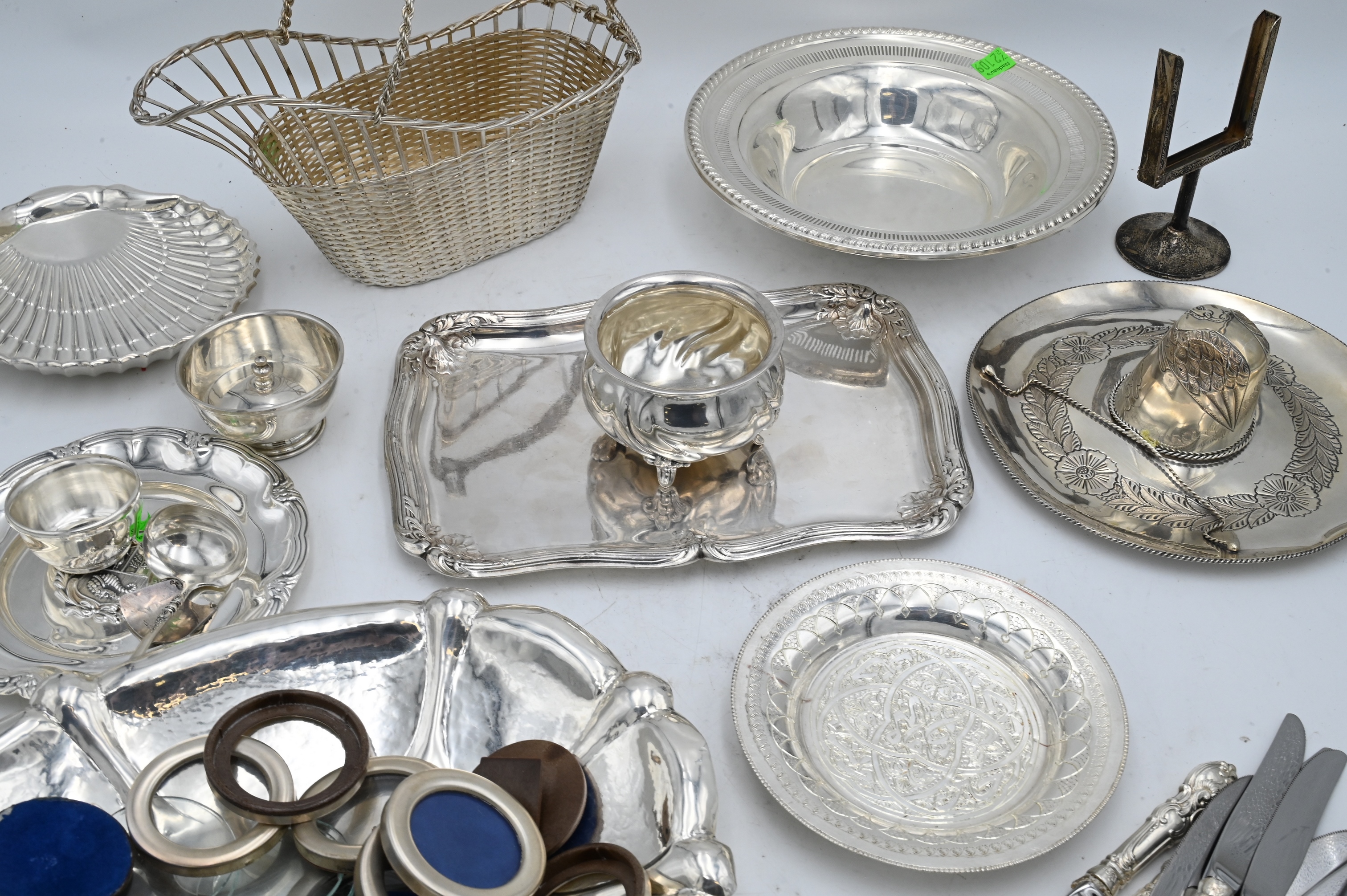 to include bowls, Mexican silver hat, 14 weighted knives, Christofle basket or wine caddy, etc