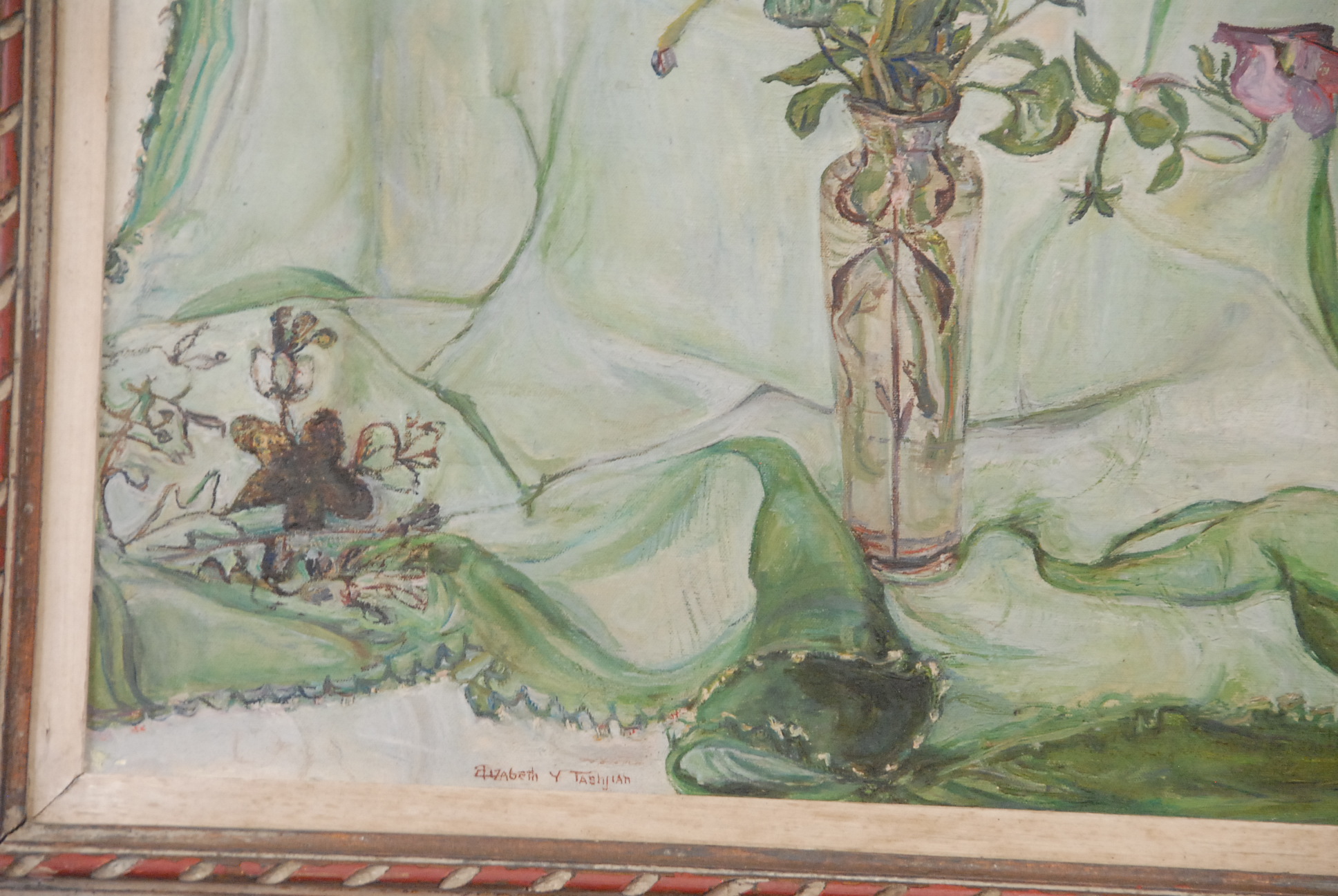 Oil on canvas, still life of flowers, signed lower left Elizabeth Y. Tashjian