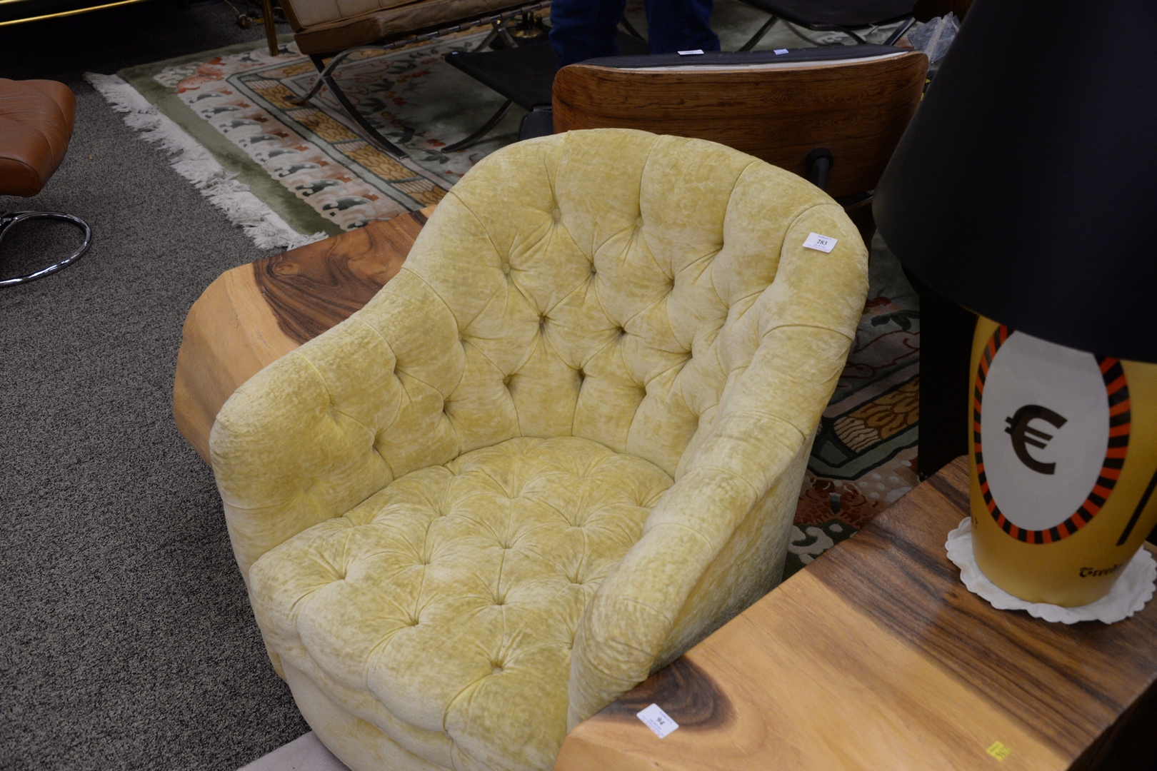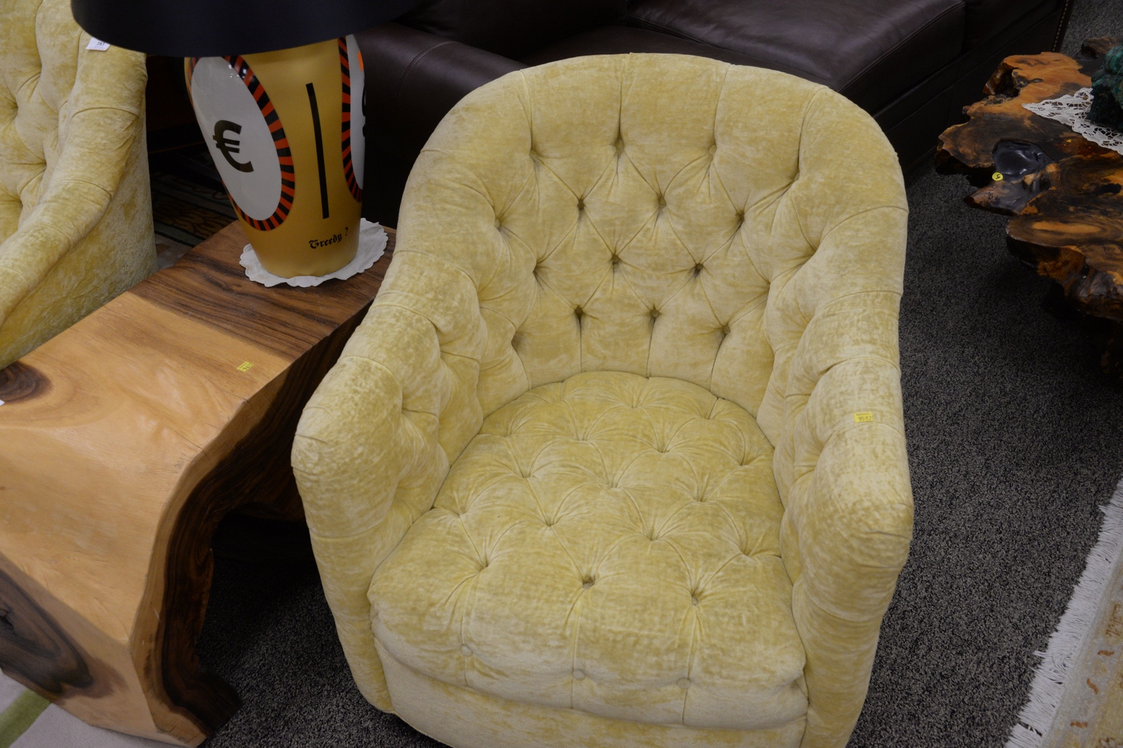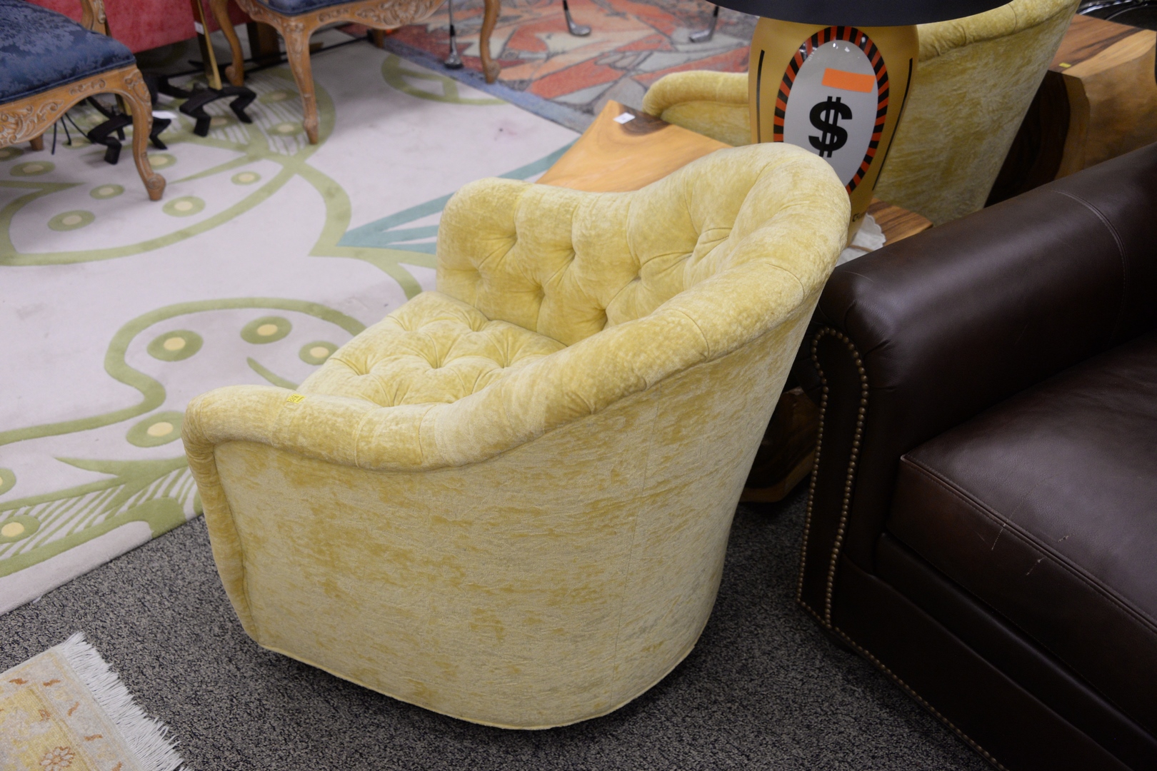 Lot 283: Pair of Ward Bennett Lounge Chairs for Brickel Associates, with tufted yellow upholstery, on casters, height 33 inches, width 31 inches, depth 31 inches.