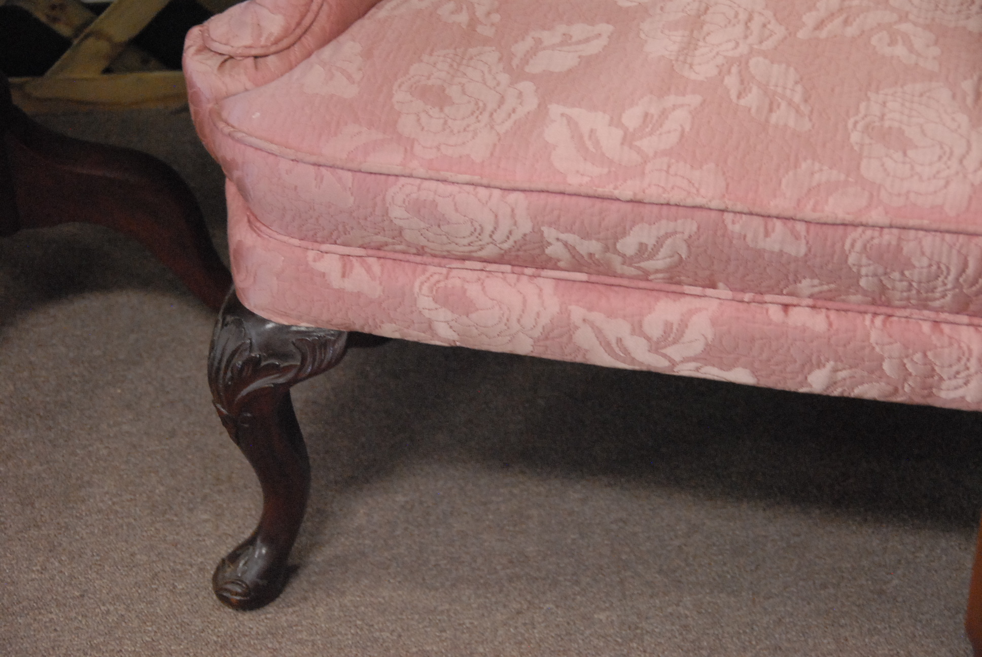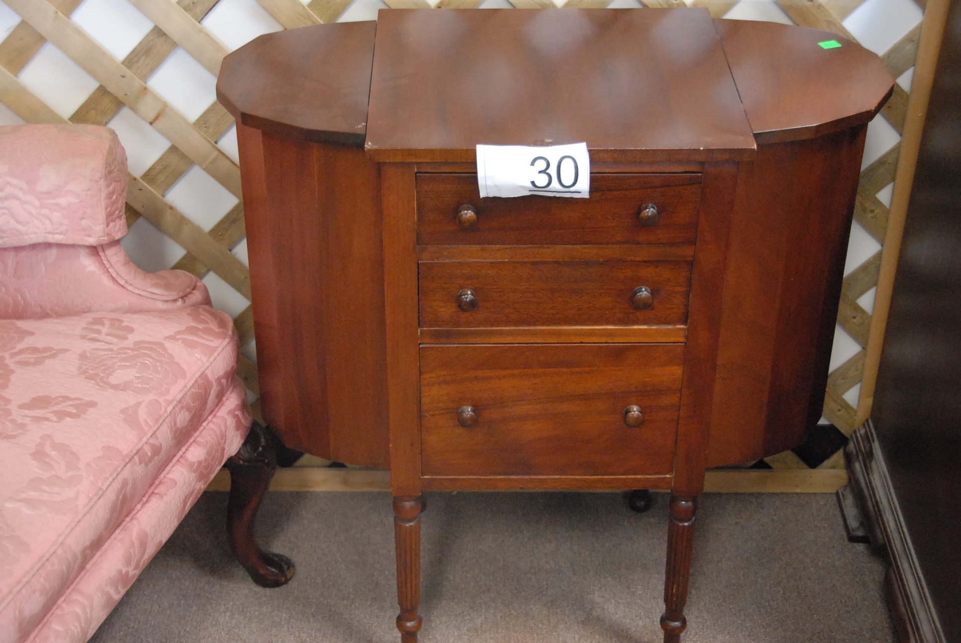 Queen Anne style upholstered armchair and mahogany sewing stand.