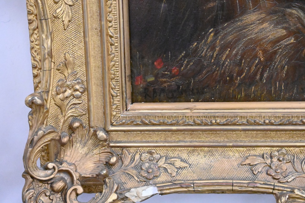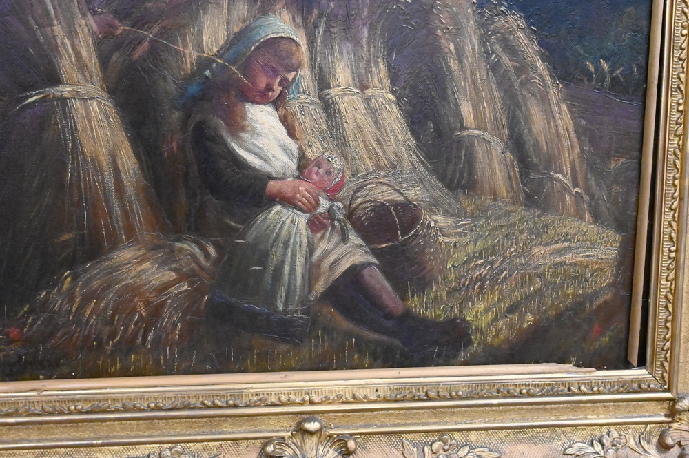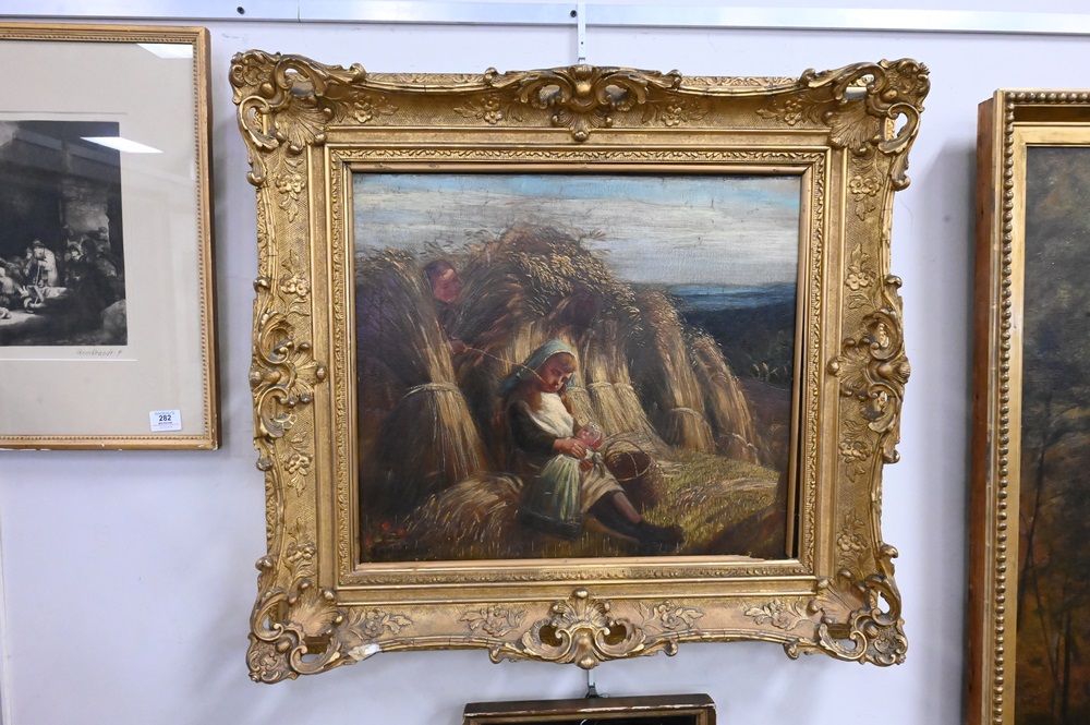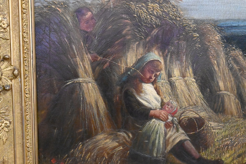 Robert Braithwaite Martineau (UK 1826 – 1869), oil on canvas, “In the Haystacks”, 20″ x 24 1/8″.