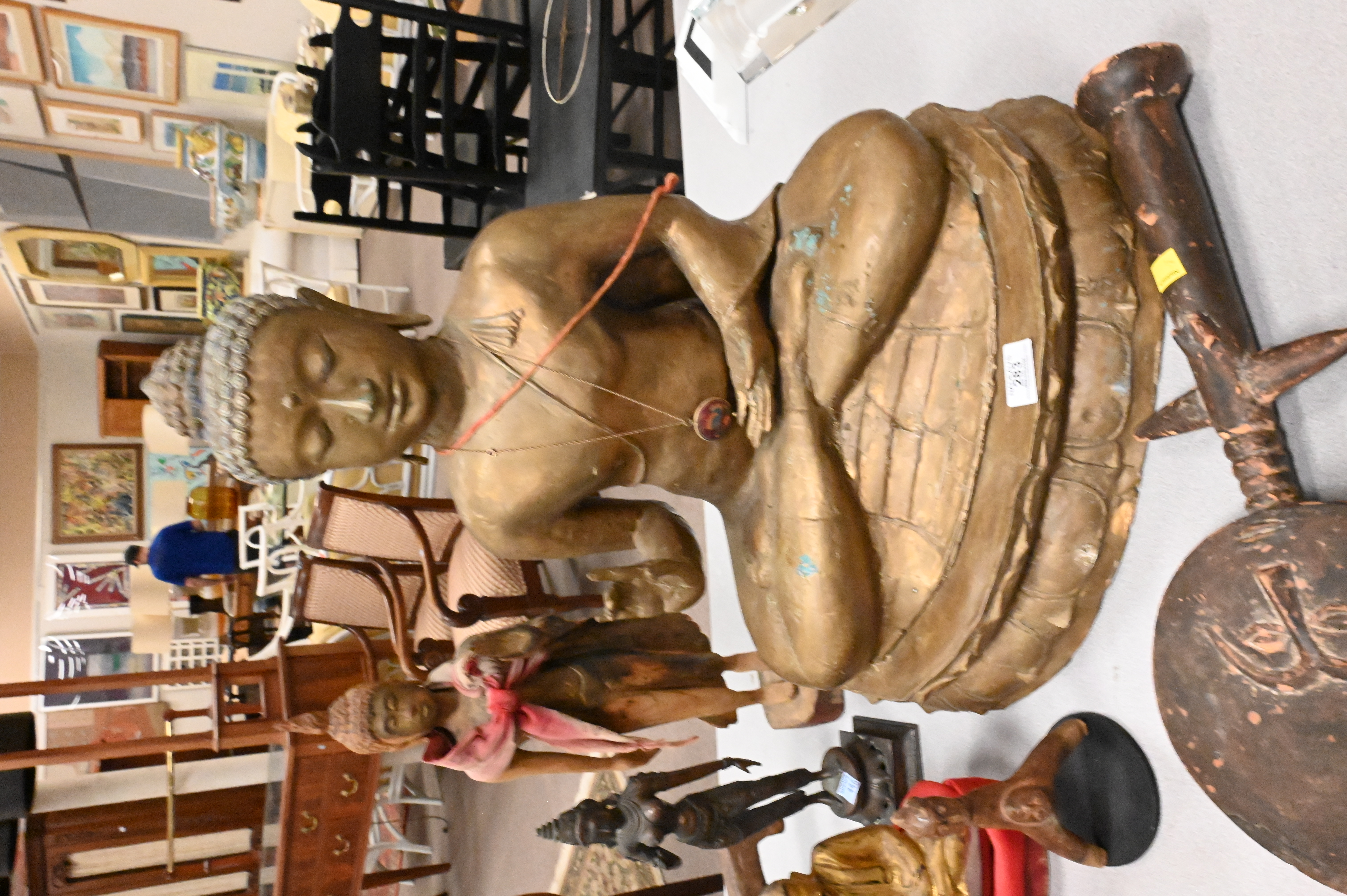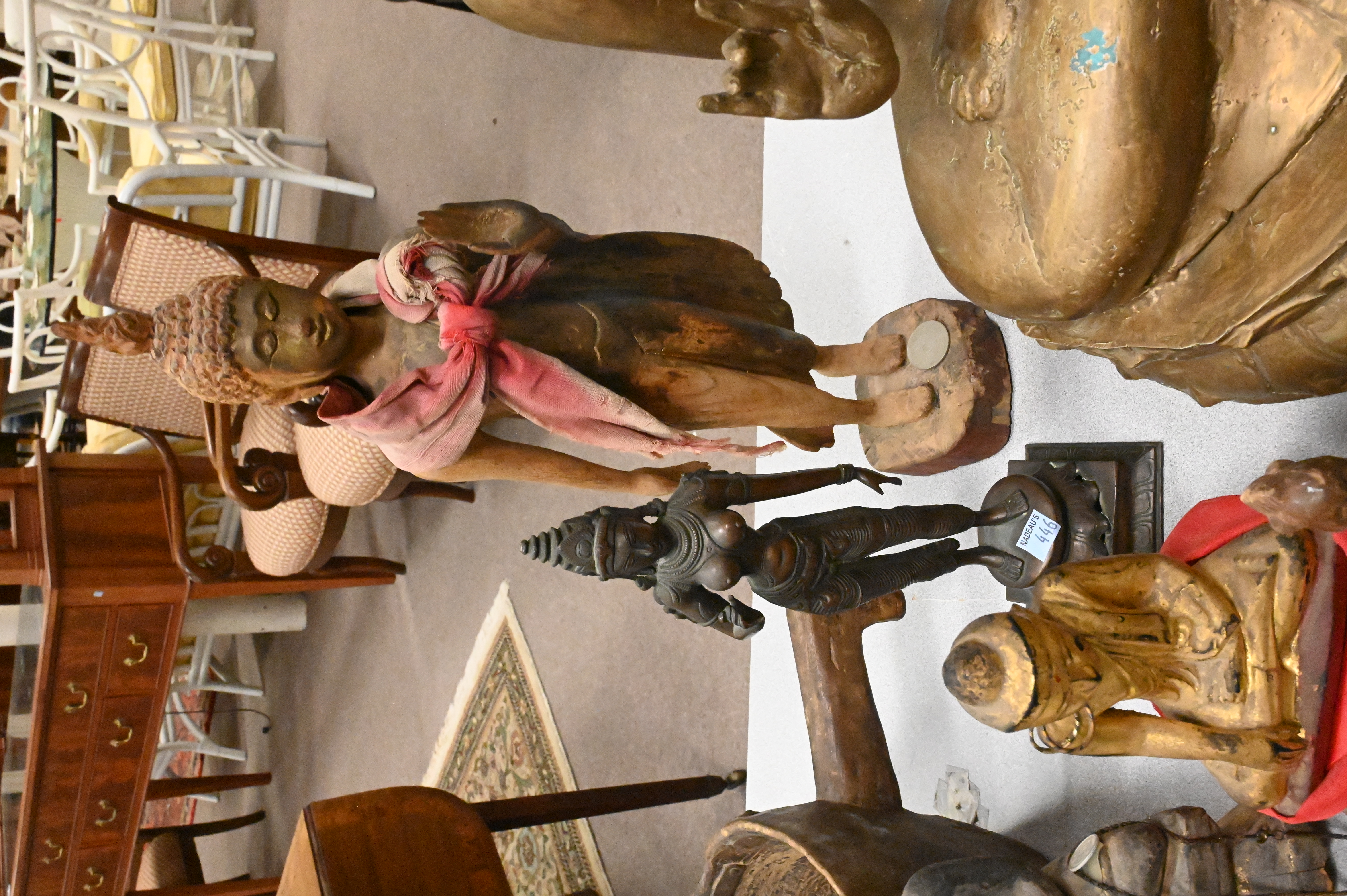 Large metal cross legged Buddha, two carved Buddhas one of which being painted, three carved seated Buddhas