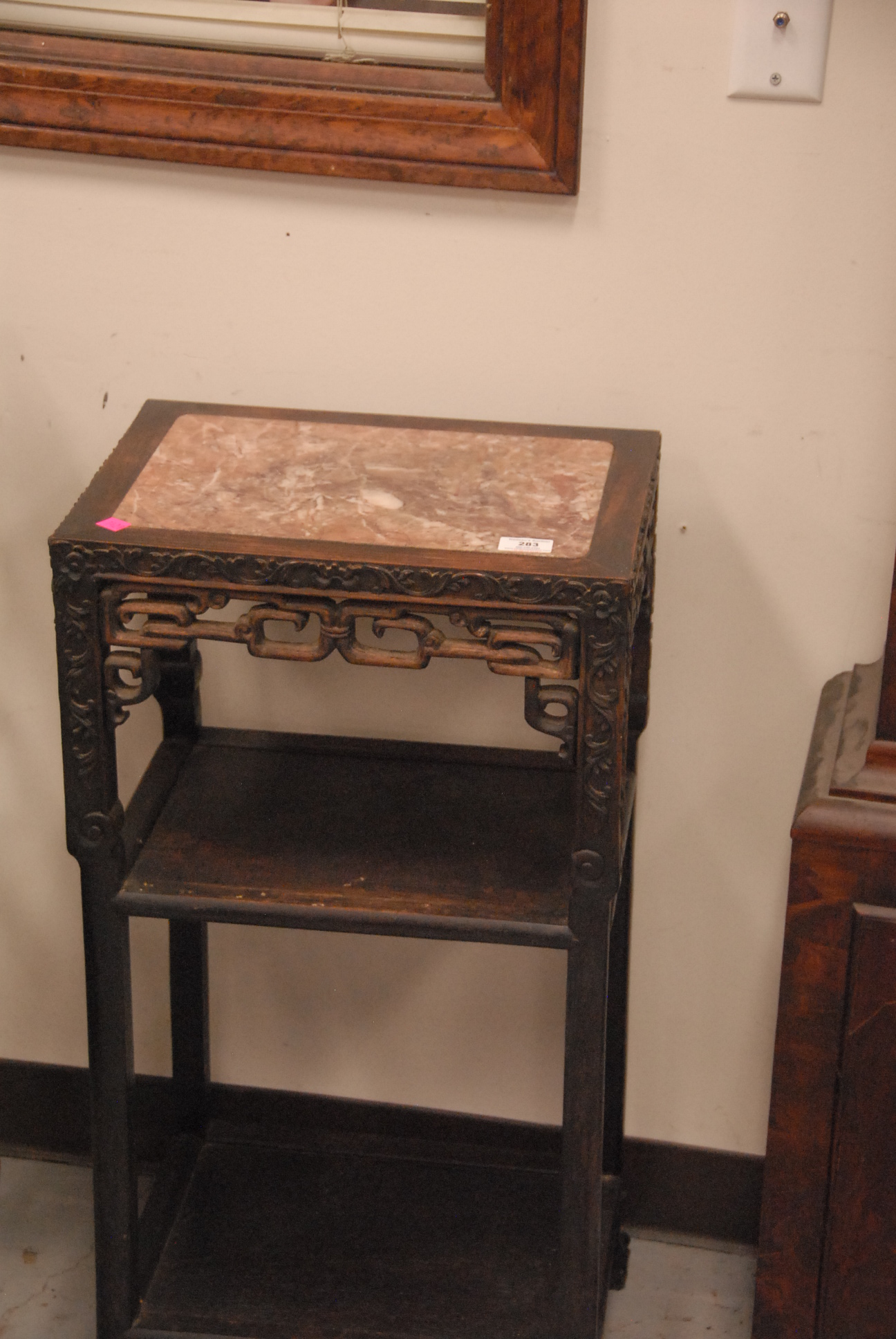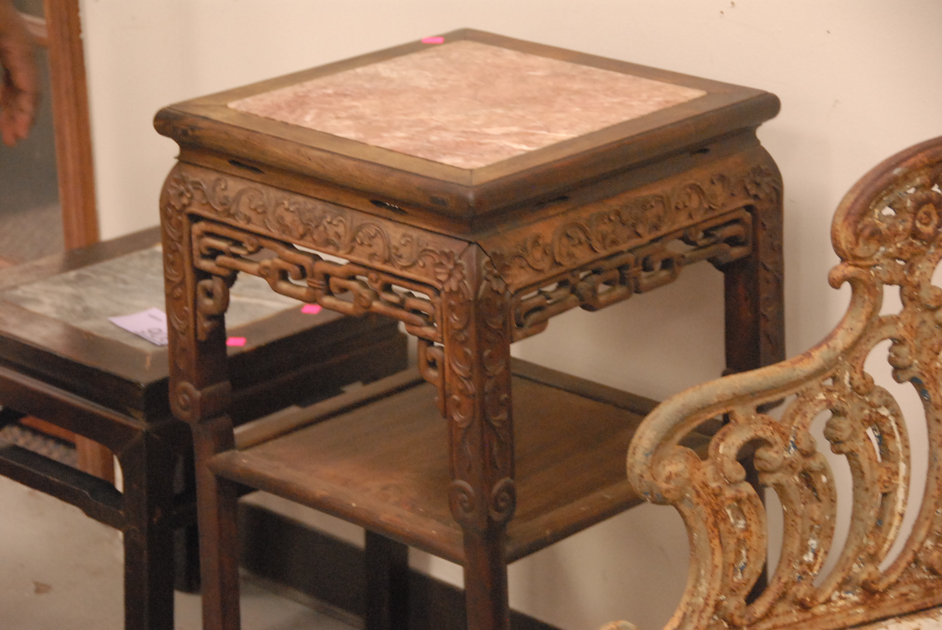 Two hardwood Oriental stands with marble inserts having carved sides and skirt. ht. 31 1/2 in.