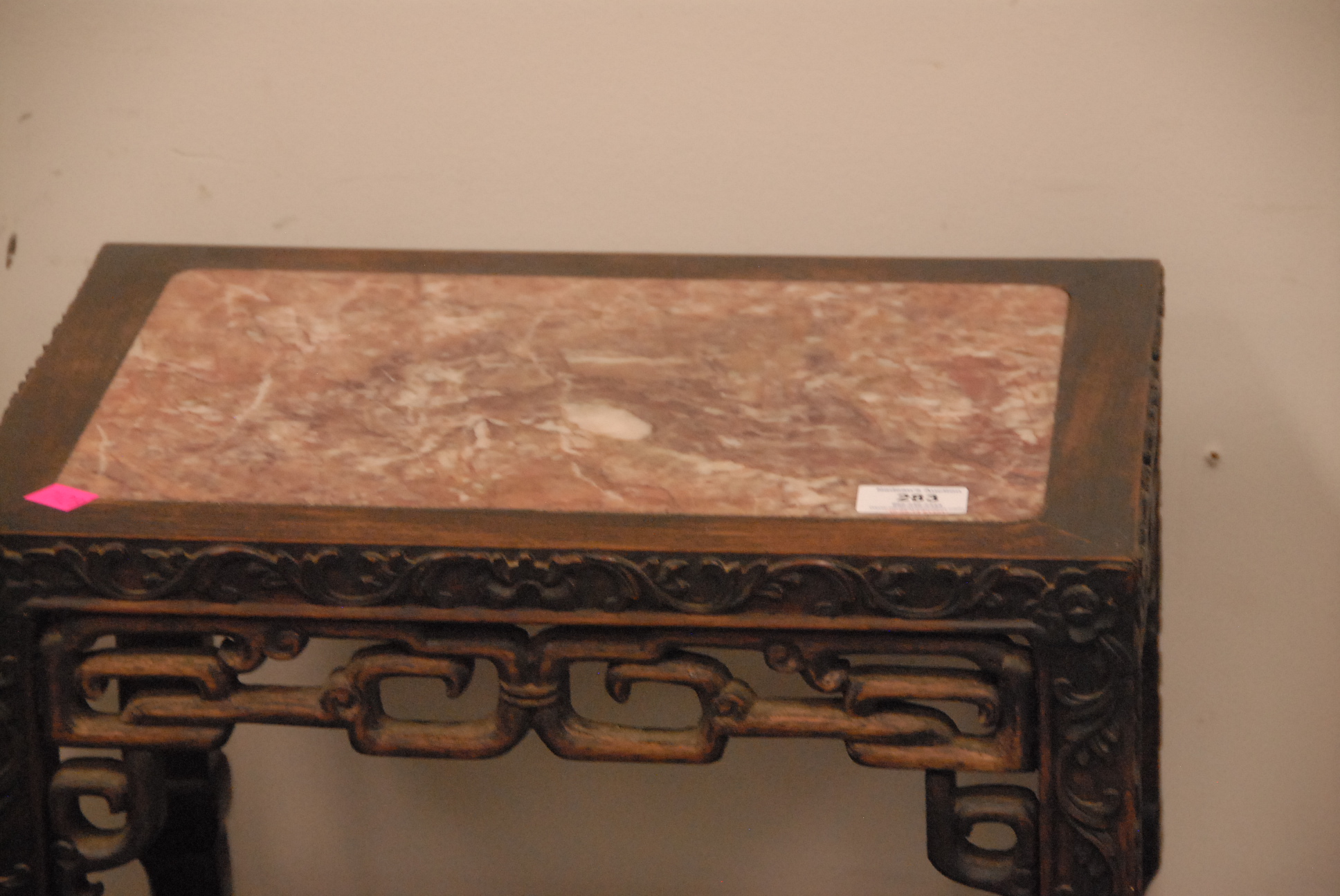 Lot 283: Two hardwood Oriental stands with marble inserts having carved sides and skirt. ht. 31 1/2 in.