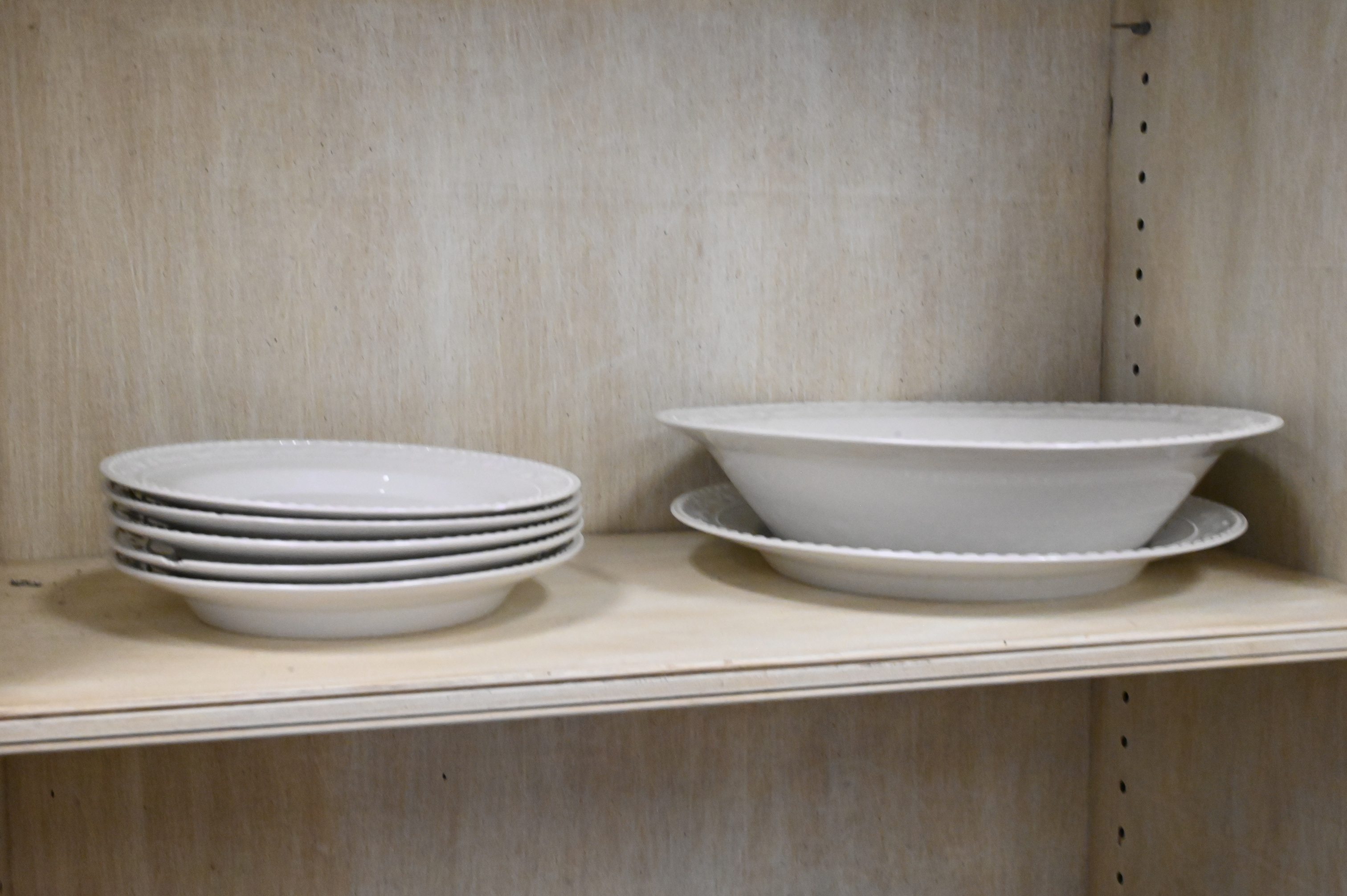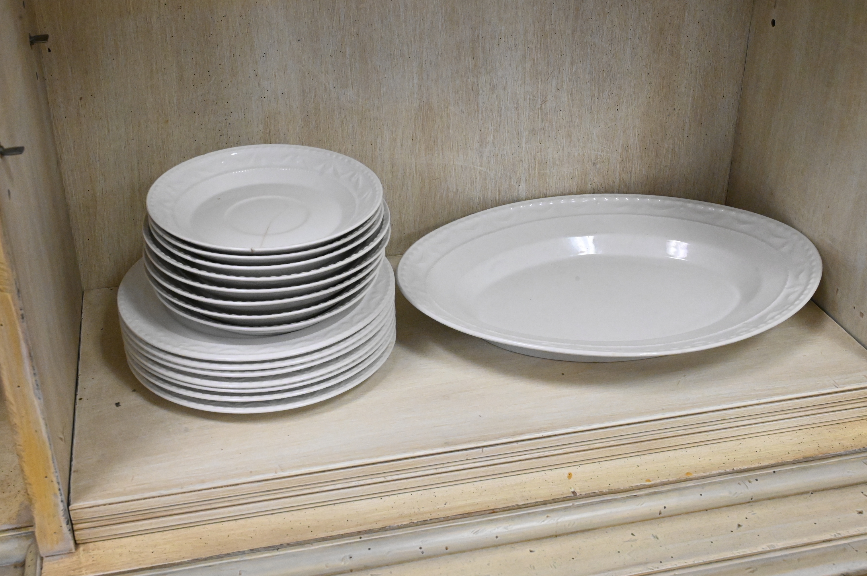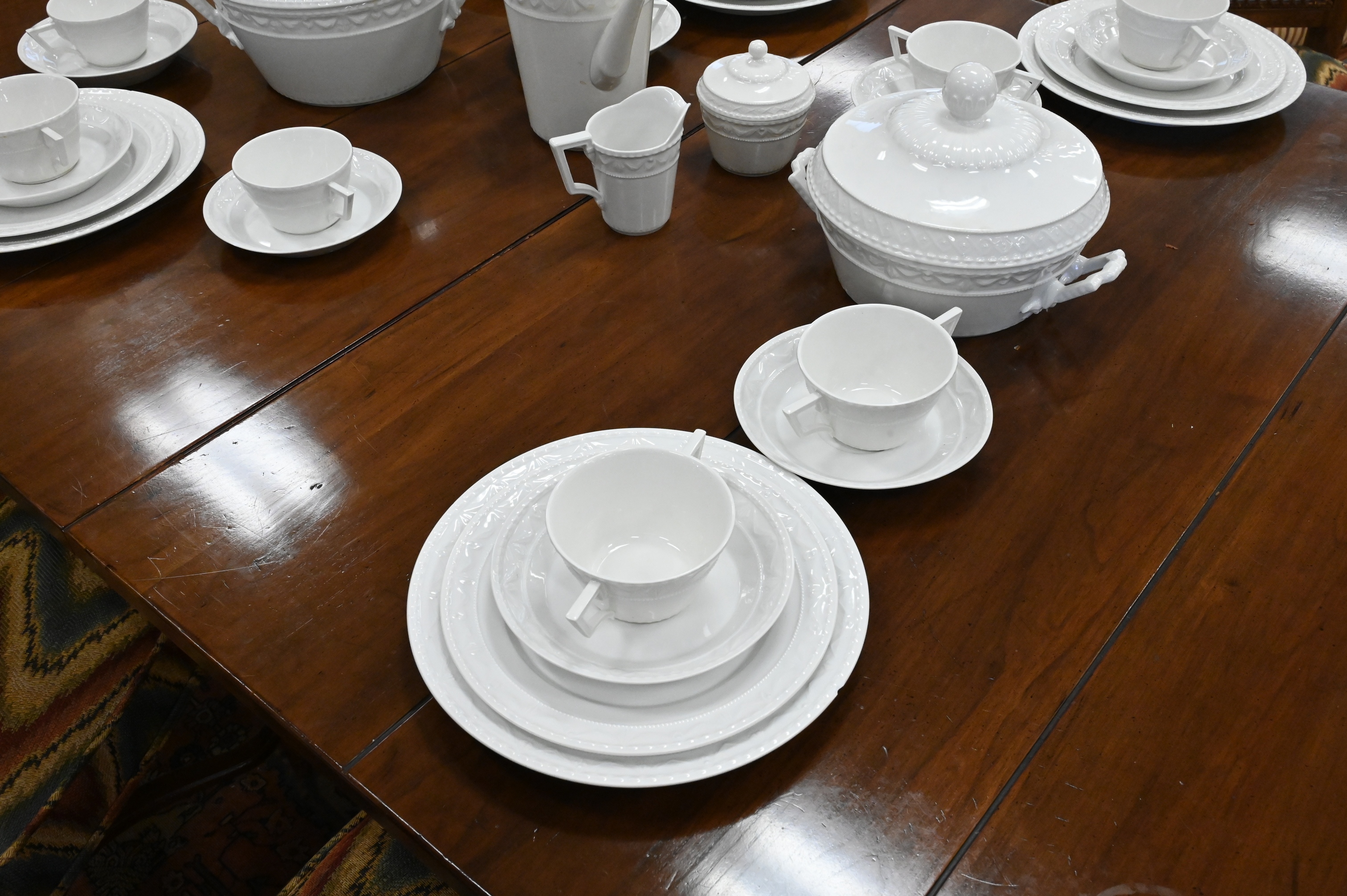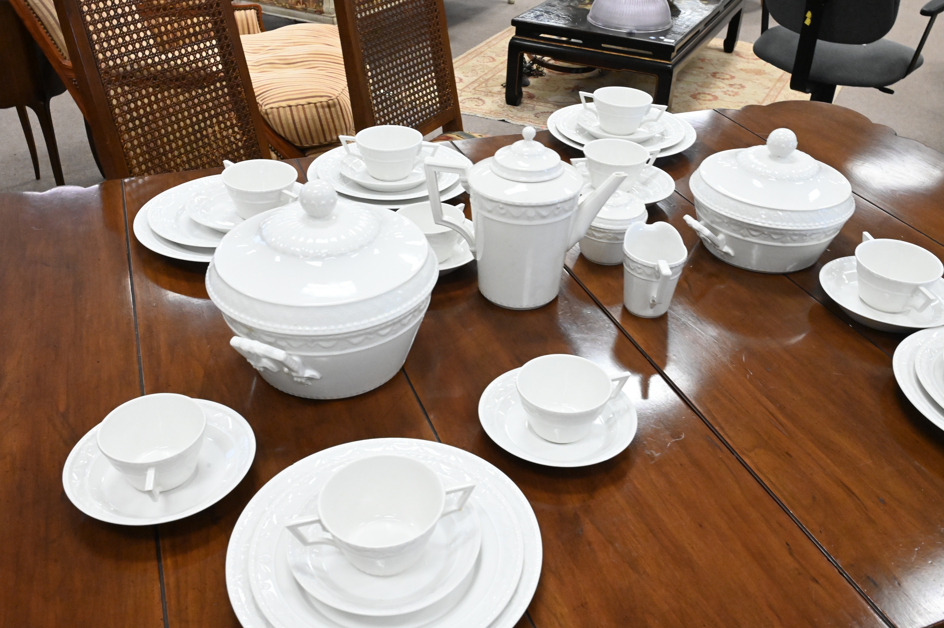 8 double handled soups, 4 teacups, 20 saucers, 7 dinner plates, 7 luncheon plates, 7 salad plates, 5 soup bowls, coffee pot, cream and sugar, along with 4 additional serving pieces, marked on underside