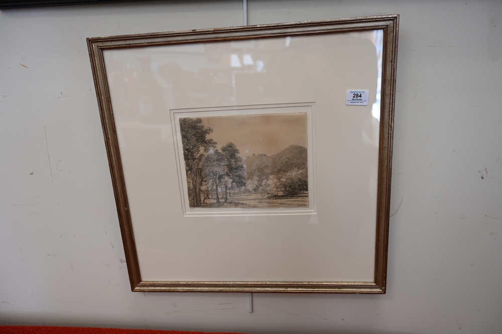 Lot 284: Attributed to Thomas Girtin (British, 1775 – 1802), Astroni, Italy, grey wash over pencil on paper, unsigned, sheet size 7″ x 9 1/4″.