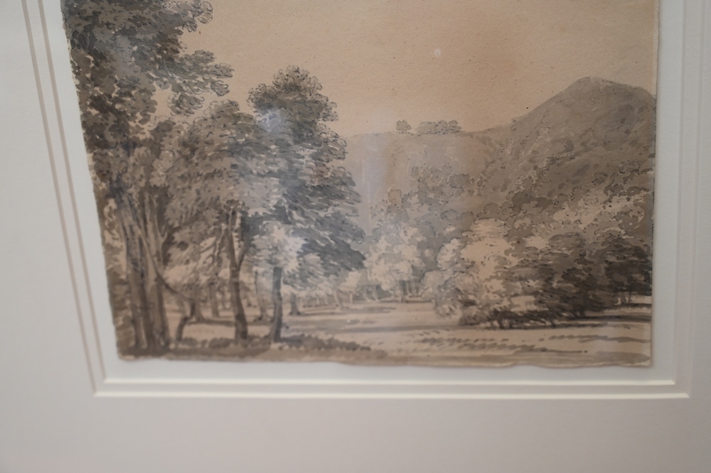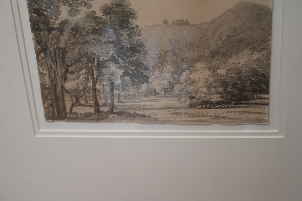 Attributed to Thomas Girtin (British, 1775 – 1802), Astroni, Italy, grey wash over pencil on paper, unsigned, sheet size 7″ x 9 1/4″.