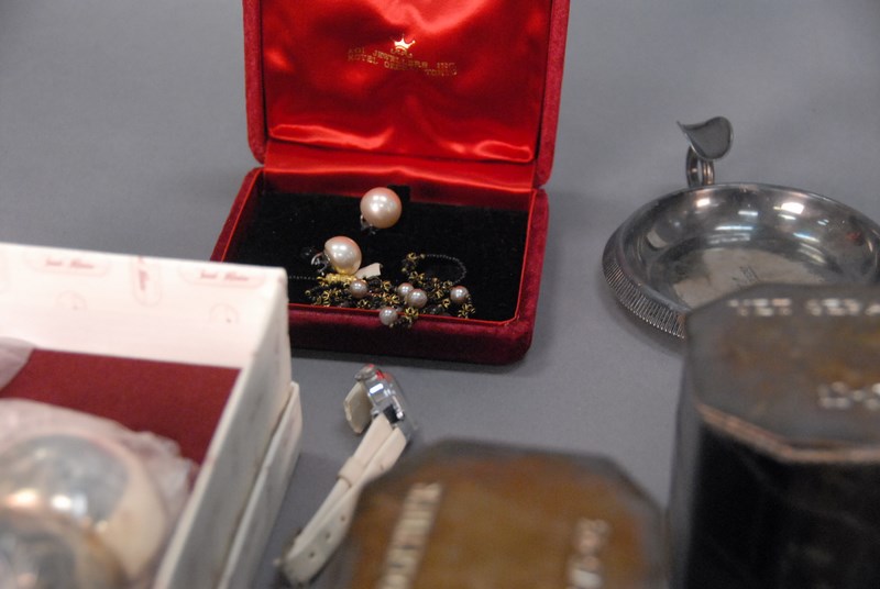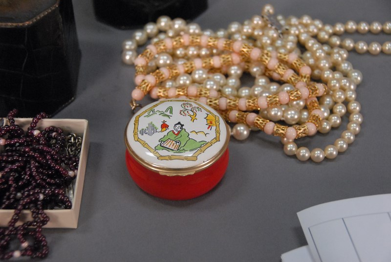 Lot 284: Box lot to include Battersea enamel box, Concorde Air France pieces, pair of alligator skin and silver boxes, etc.