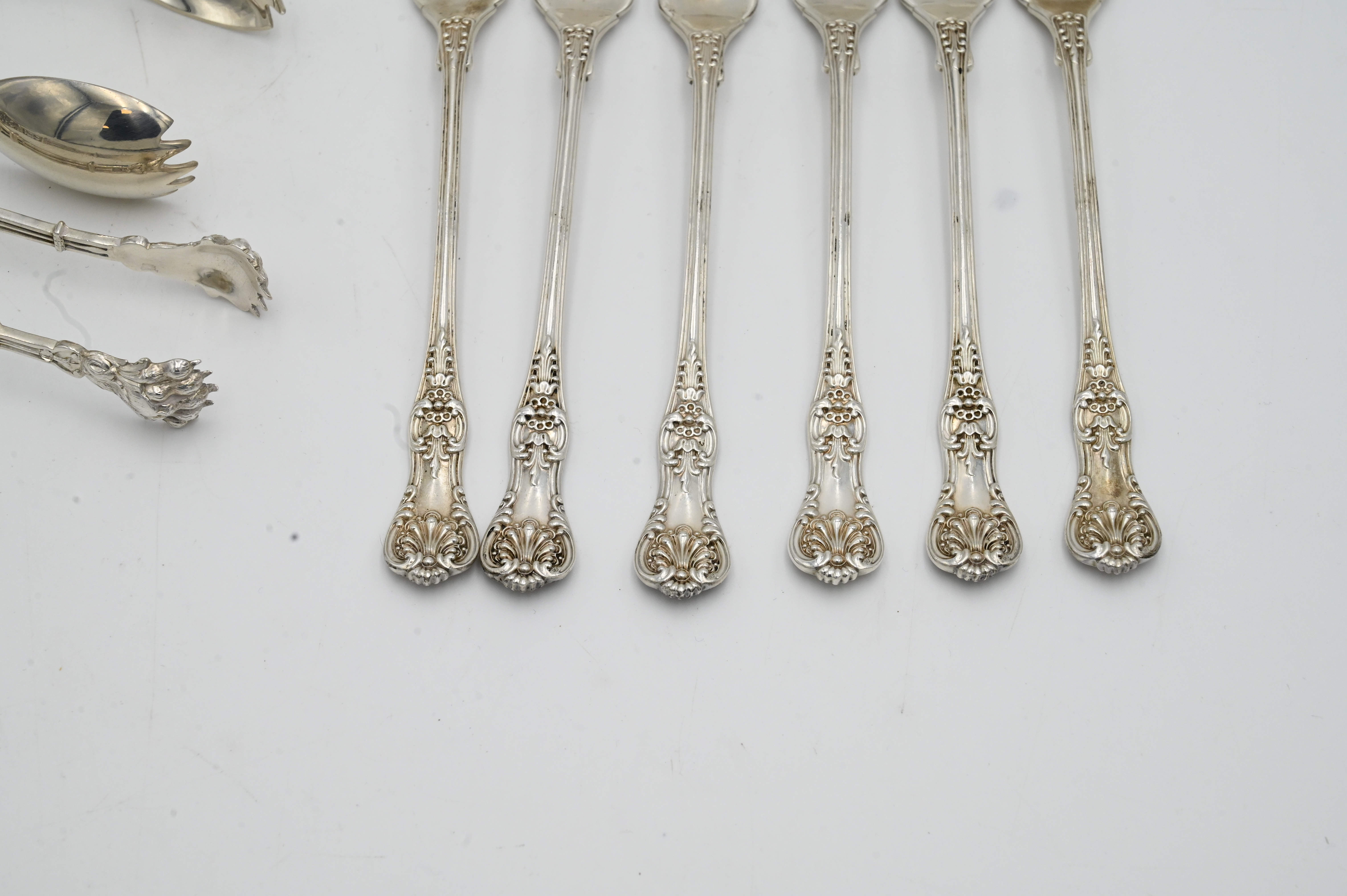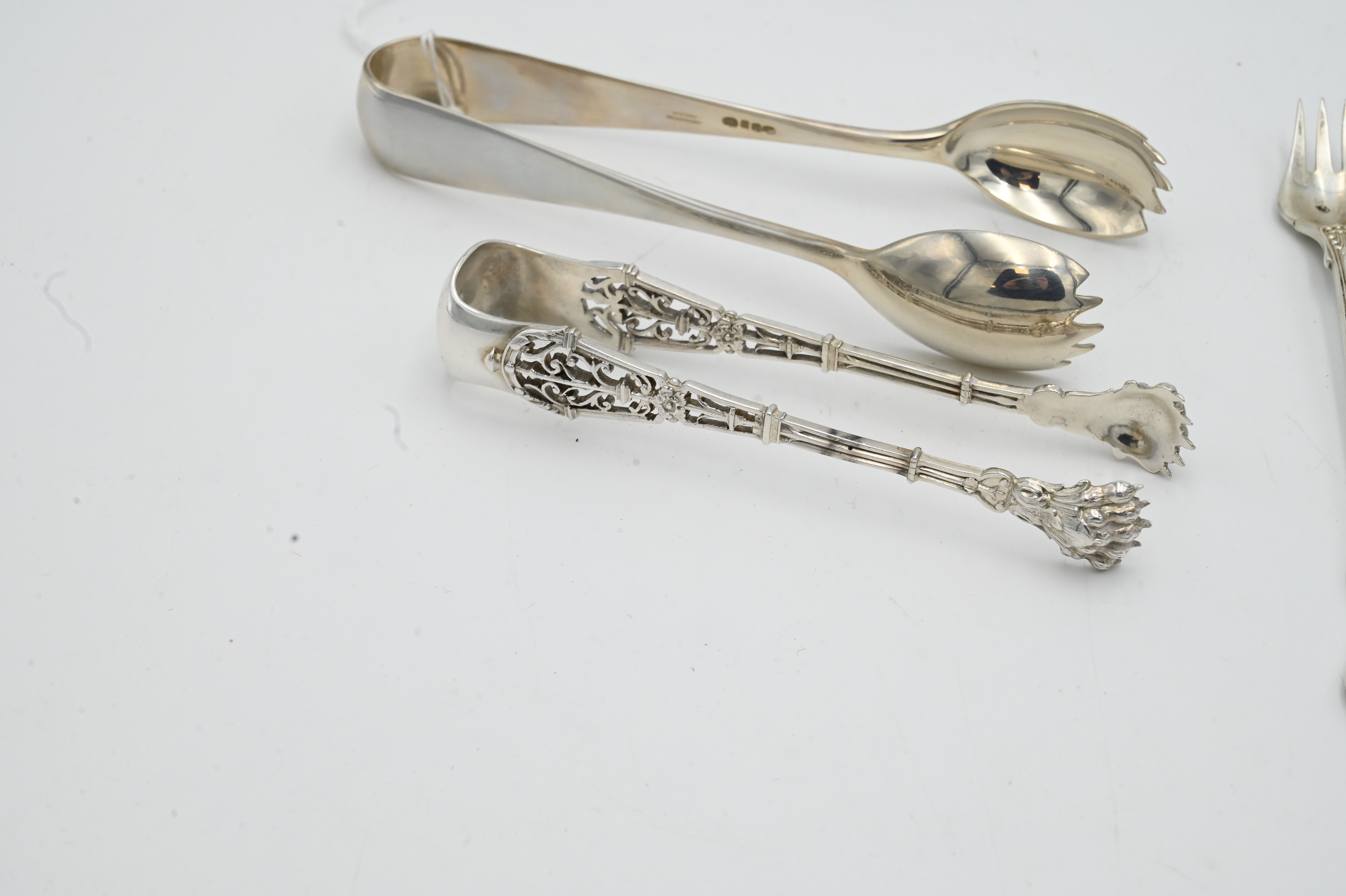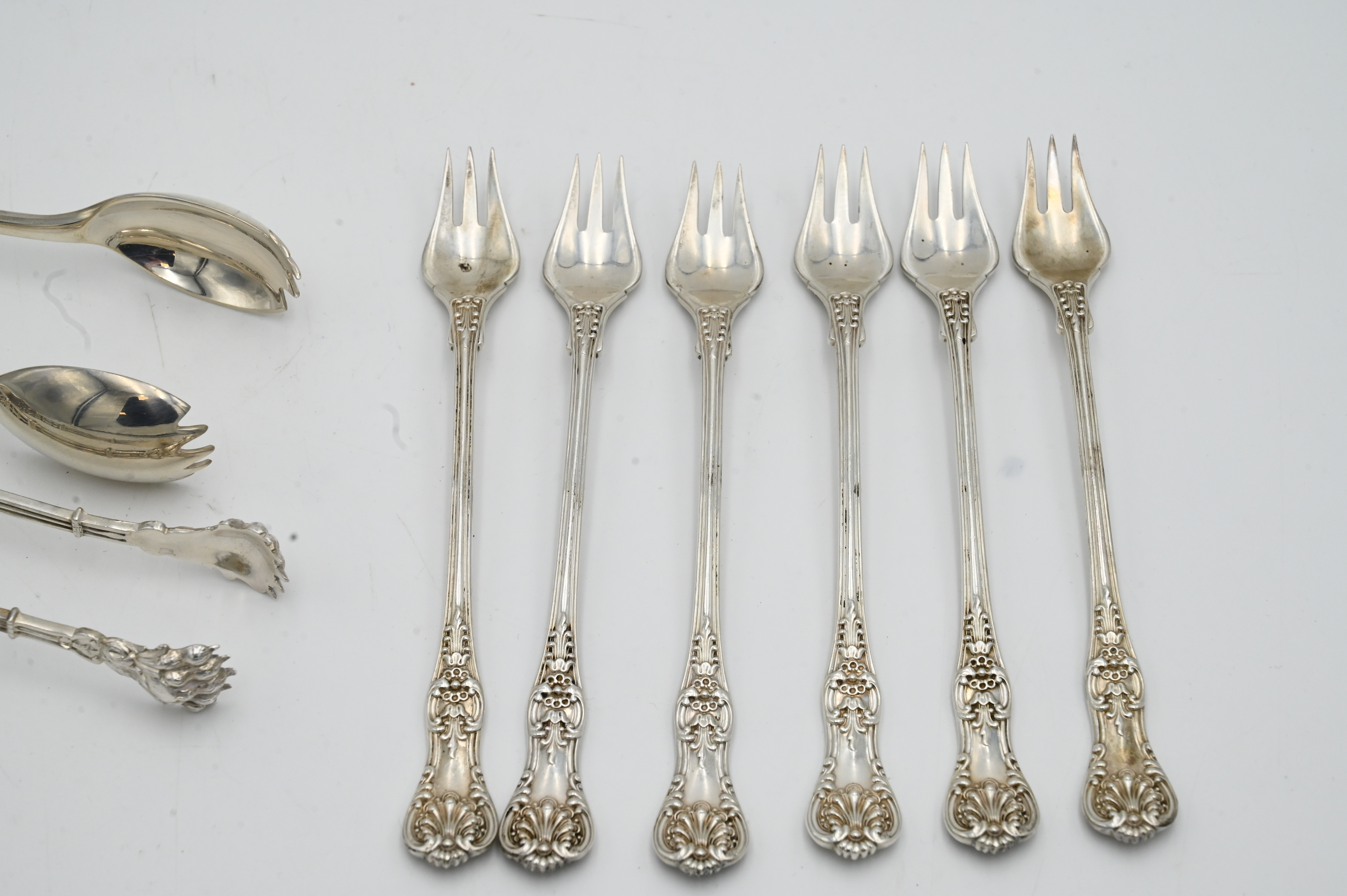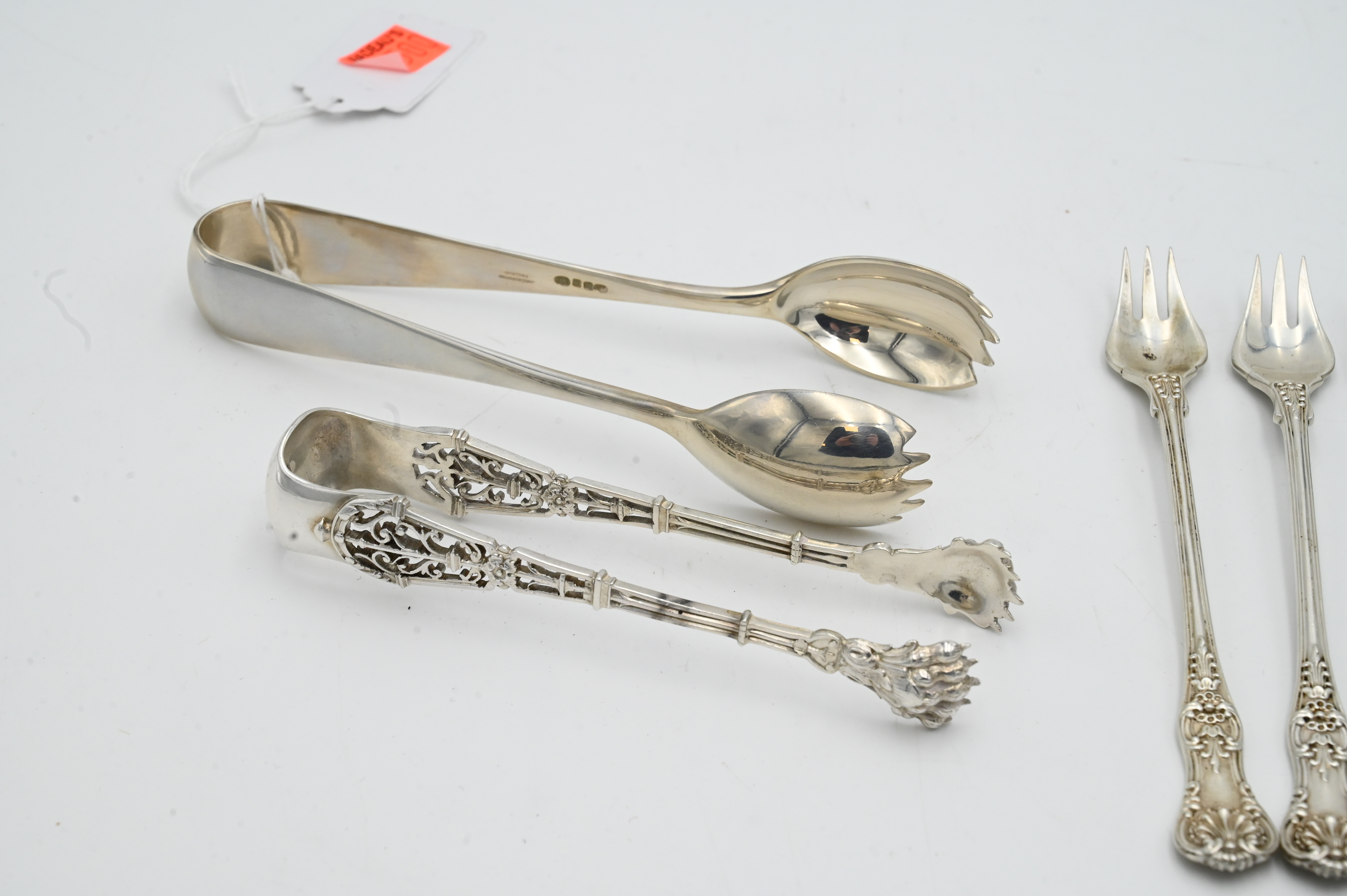 Eight Piece Sterling Silver Lot, to include six Tiffany ‘King’ cocktail forks, James Robinson tongs, along with sugar nippers with claws, 9.6 t.oz.