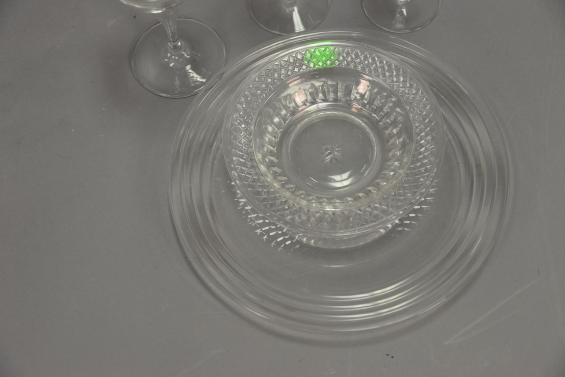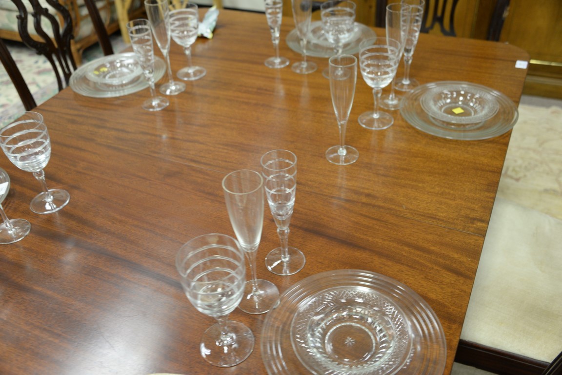 Fifty-two piece lot to include 23 piece set of red and white wine crystal stems 11 white and 12 red, and a set of ten Tiffany & Co. champagne flutes, eight plates, and eleven bowls, Diamond pattern. stems: ht. 7 1/4in., 8 1/2in., & 9 1/4in.