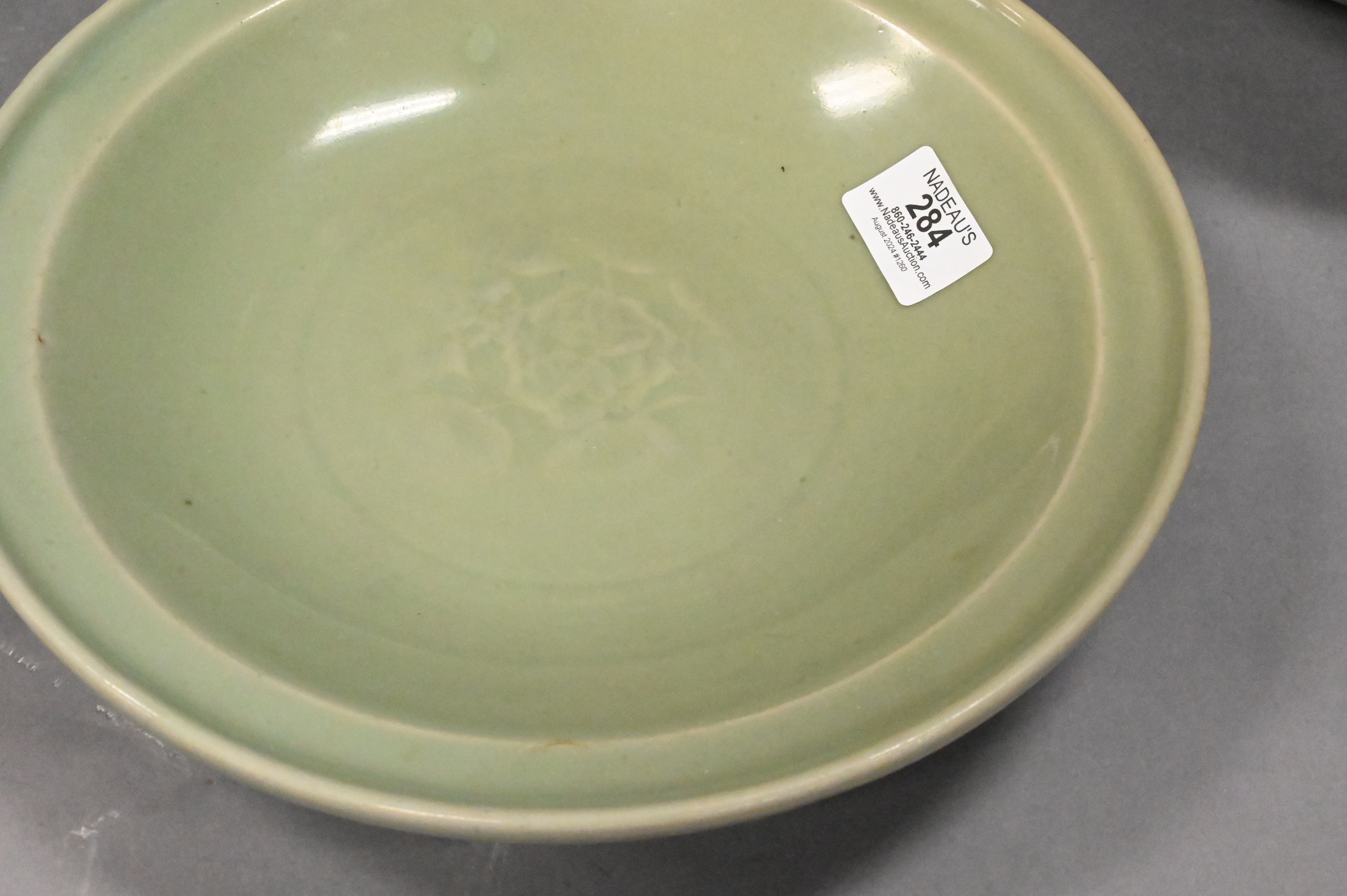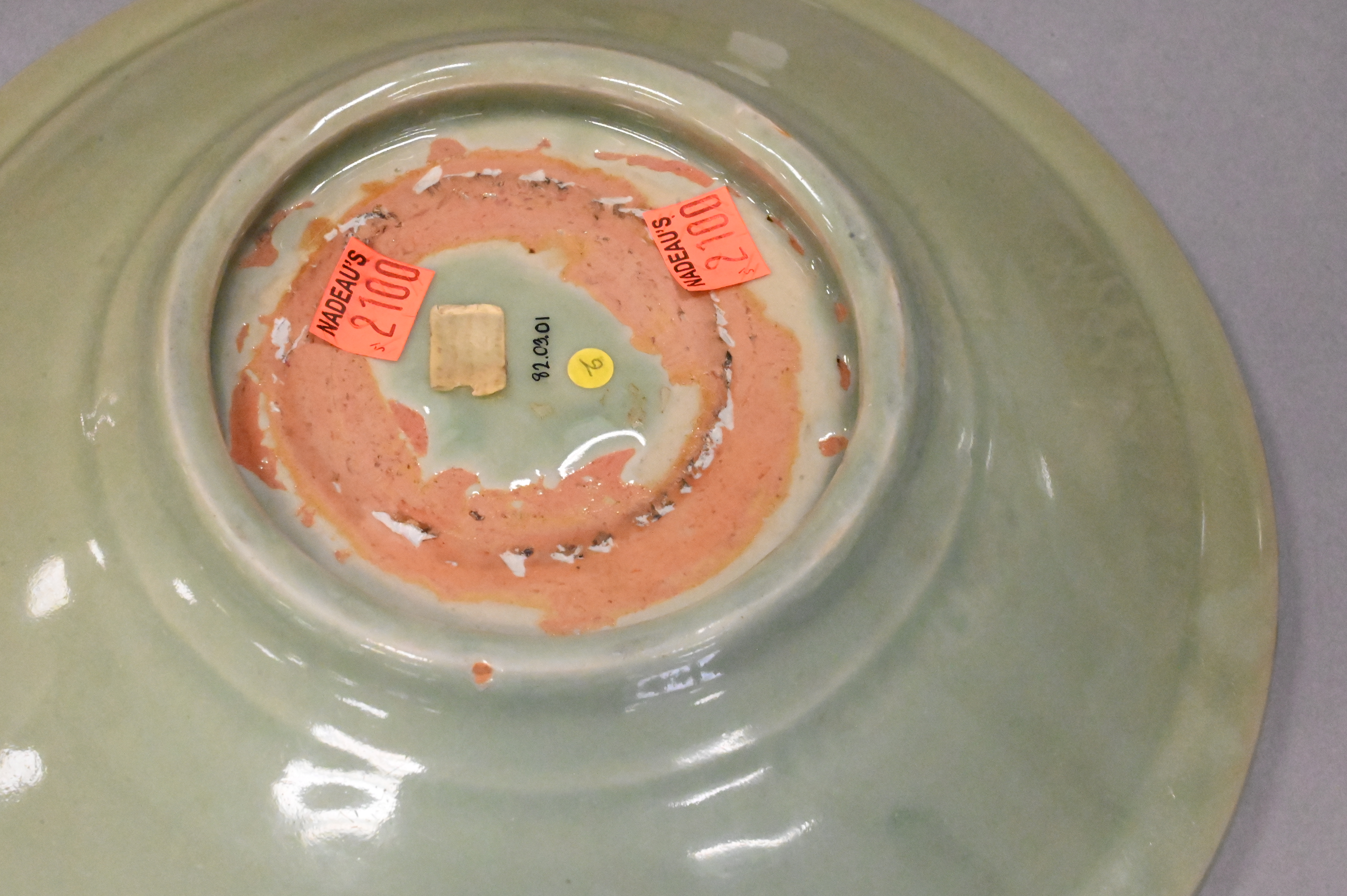 having square body set on pedestal base, hardstone finial along with carved hardstone inlaid center plaque surrounded by moth and chrysanthemum motif, Longquan celadon shallow bowl or charger having incised central floral decoration 19th century possibly ming, Japanese white Studio dragon vase