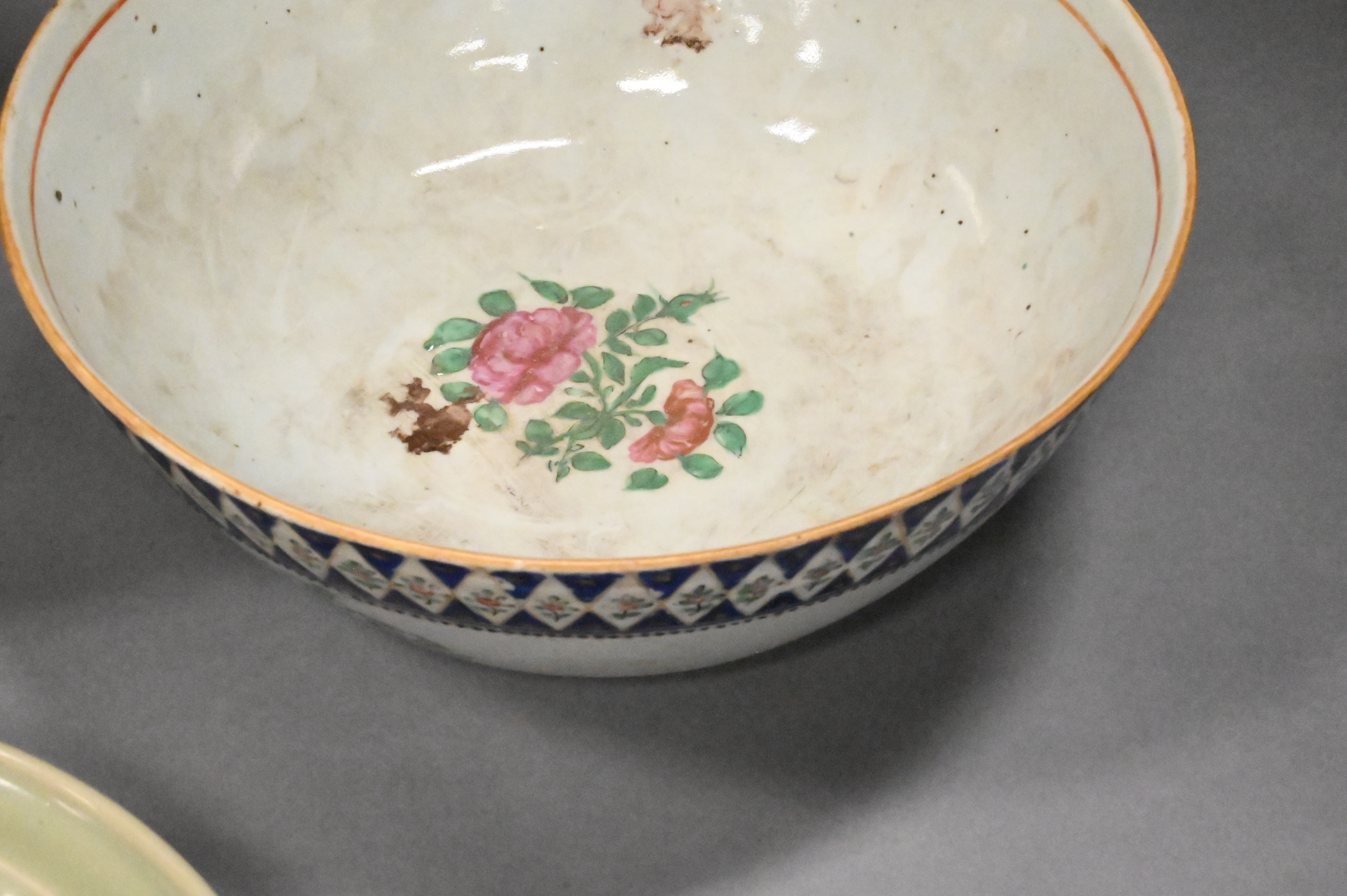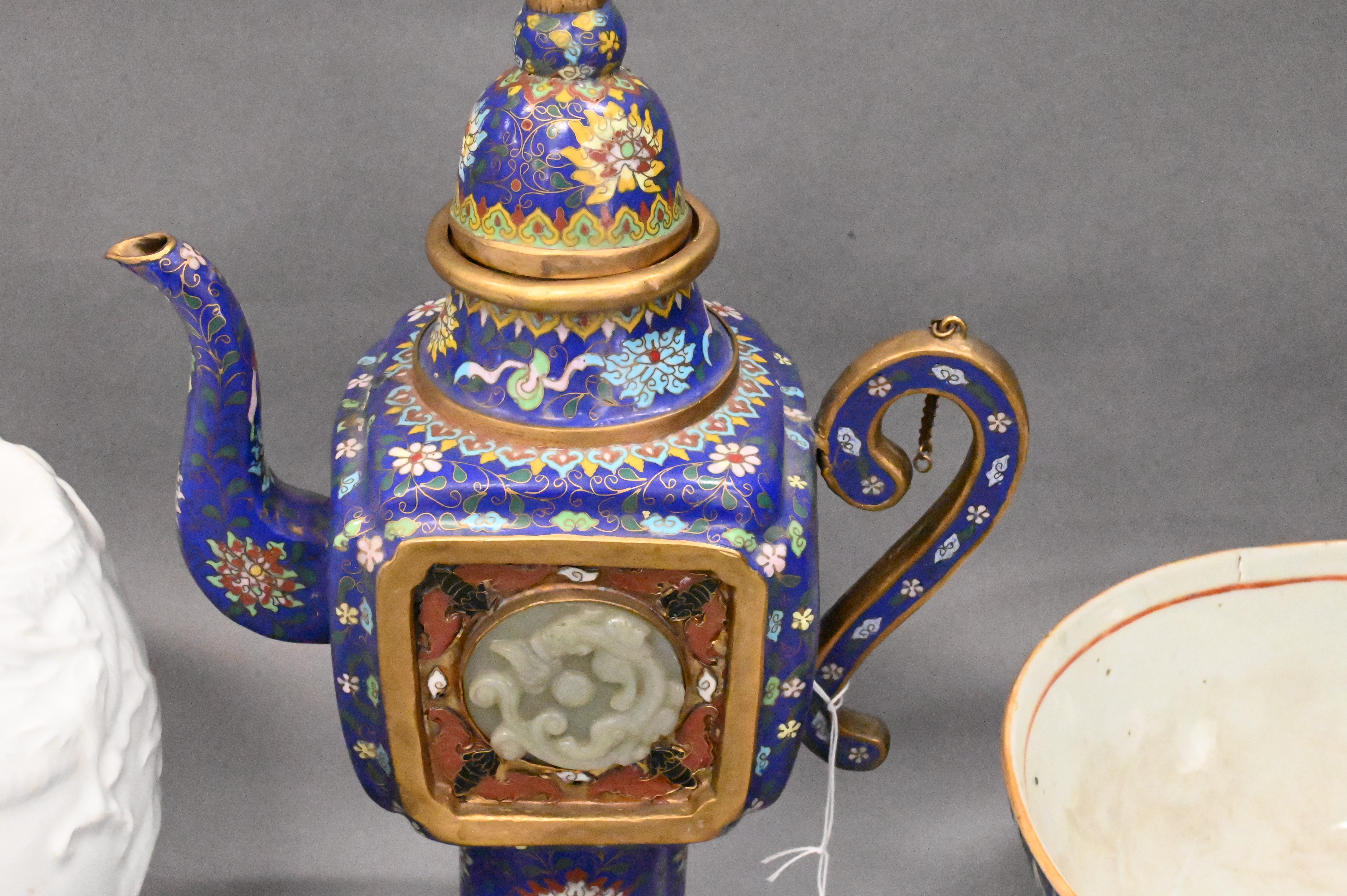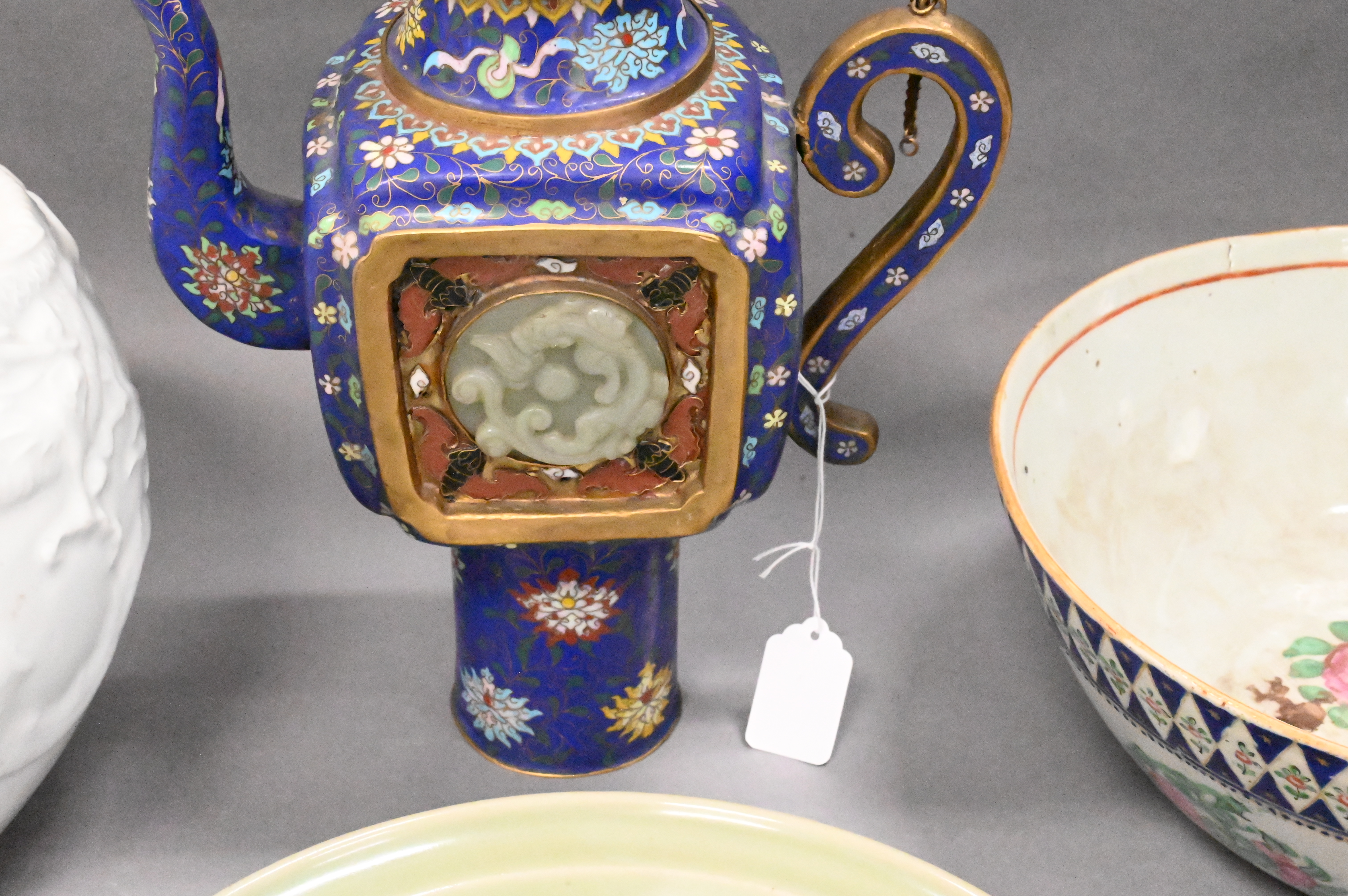 Chinese export porcelain Famille Rose bowl exterior painted with band of flowers in diamonds and flower center cartouche, Chinese Cloisonne enamel ewer