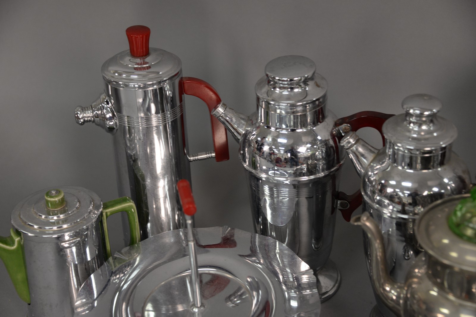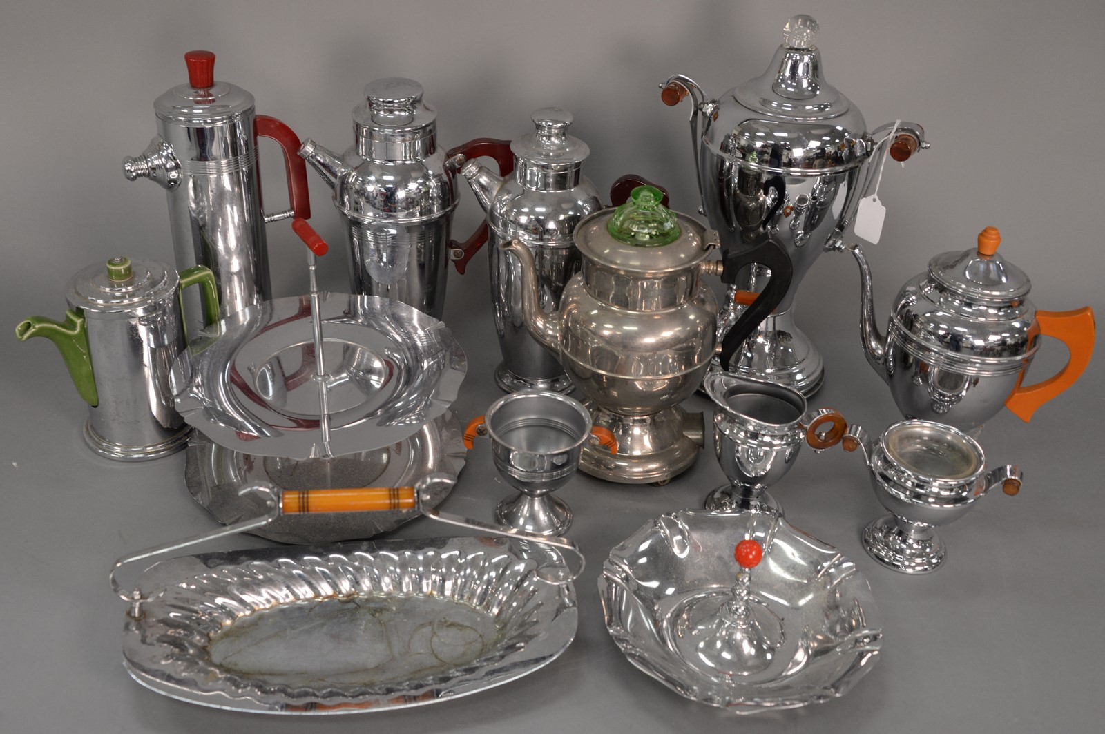 Group of vintage deco chrome pieces including coffee pots, three piece set, two trays, two cocktail shakers, etc. pots: ht. 11 1/2 in. & ht. 14 1/2 in.