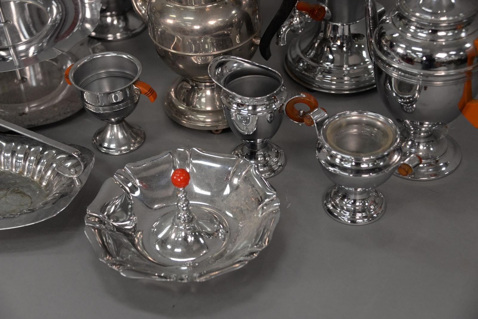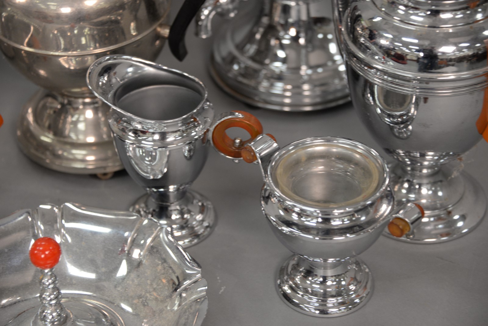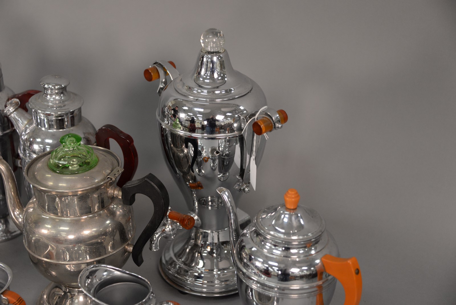 Lot 284: Group of vintage deco chrome pieces including coffee pots, three piece set, two trays, two cocktail shakers, etc.pots: ht. 11 1/2…