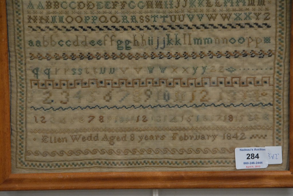 Needlework sampler, Ellen Wedd aged 8 yrs. February 1842. 13 x 12