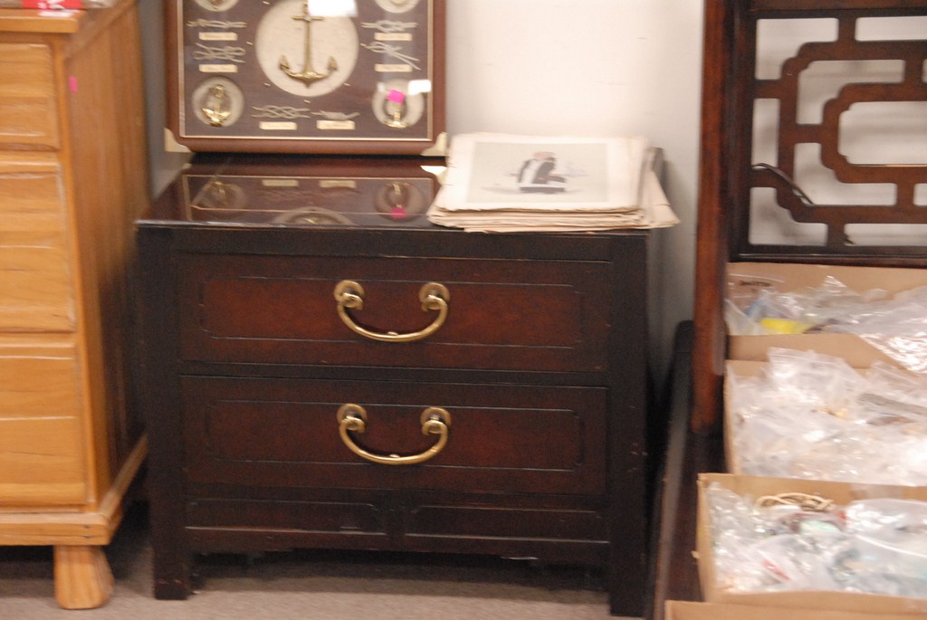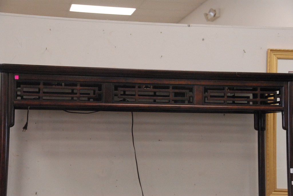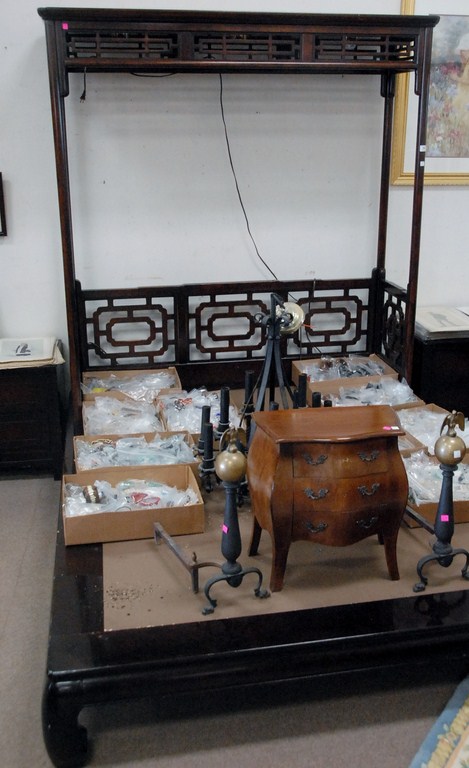Oriental style half canopy queen size bed and two night tables.