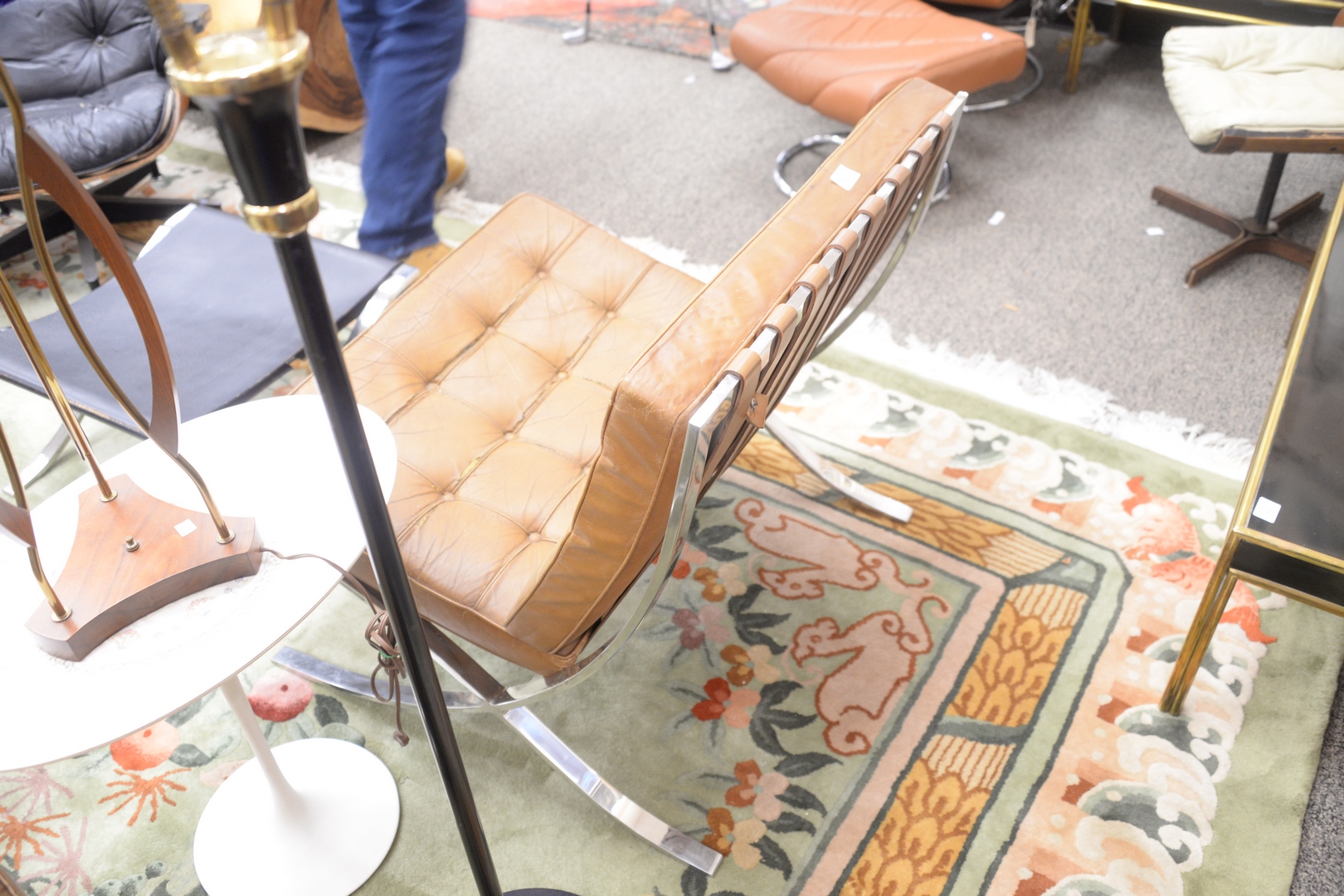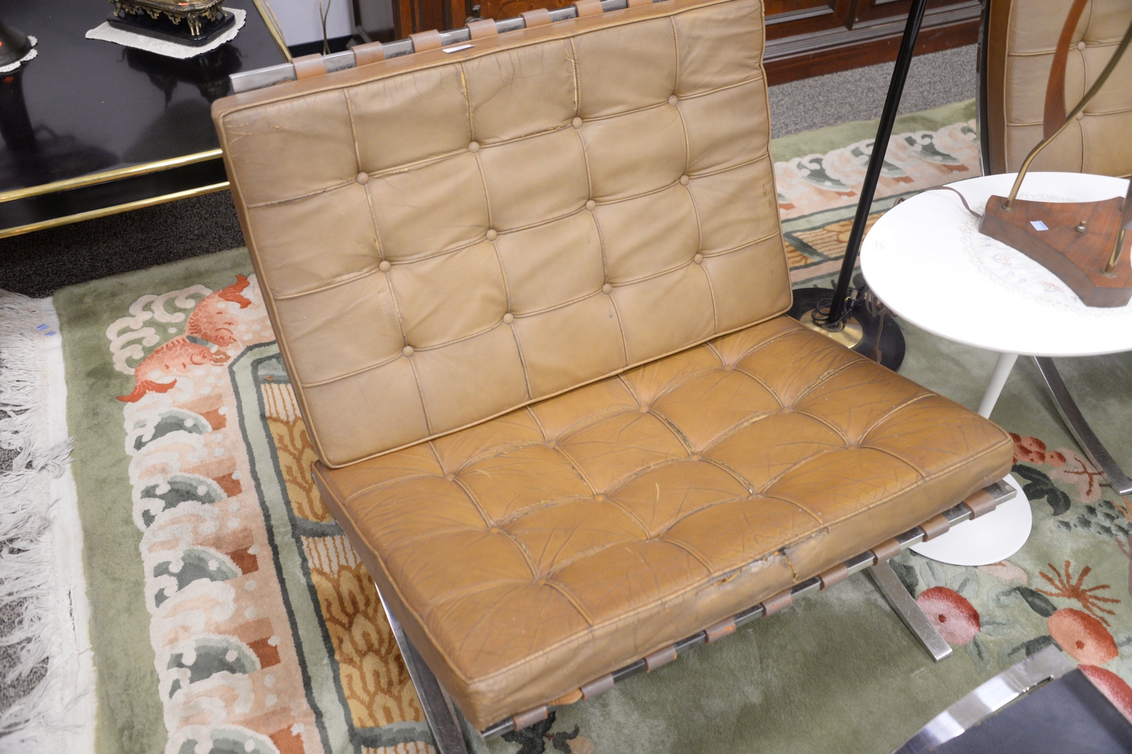 Lot 284: Pair of Barcelona Chairs, vintage, distressed leather, very heavy, height 29 inches. Provenance: The Estate of Alan Gans, Mulberry Point, Guilford.