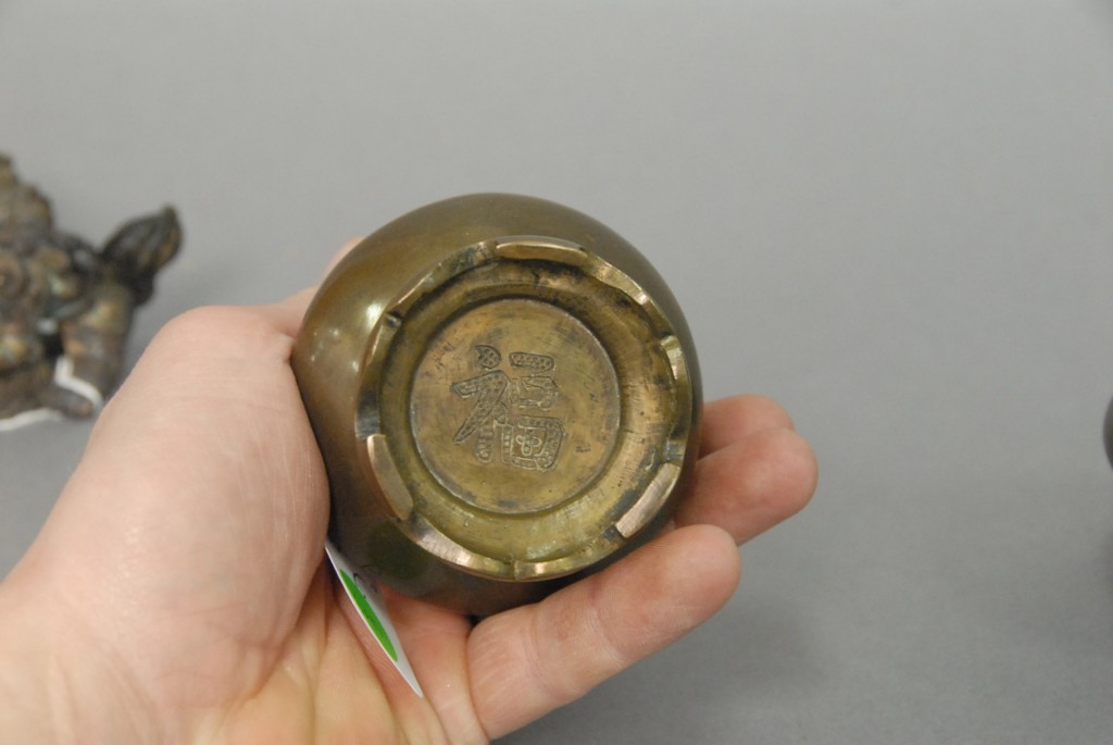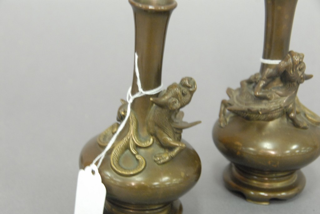 Pair of small brass dragon vases having molded dragon around the neck of the vase, ht. 6.