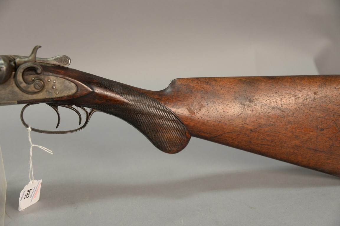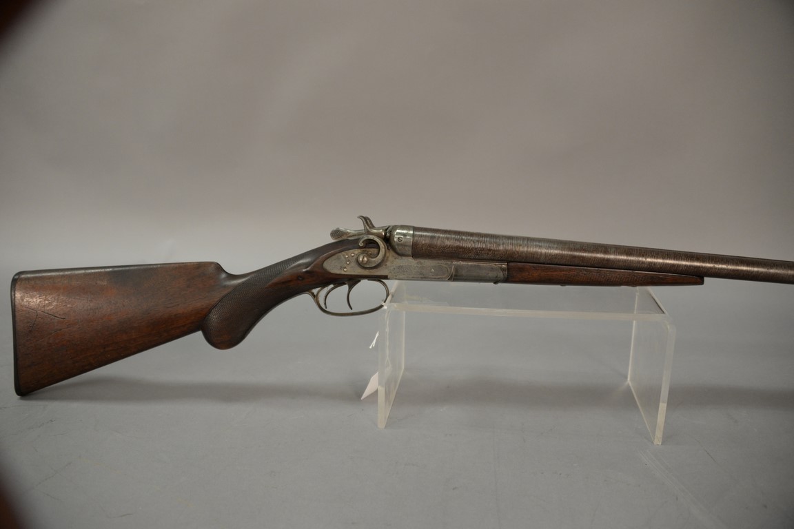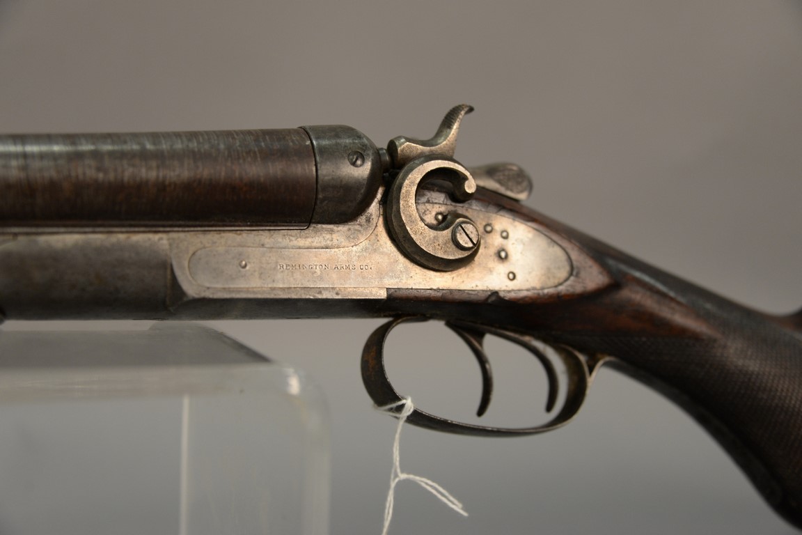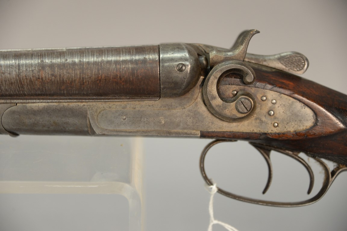 Lot 284: Remington Arms 1889 12 ga. double barrel percussion shotgun sxs, 28 Grade 2 damascus barrels, double hammers are strong heavily wor…