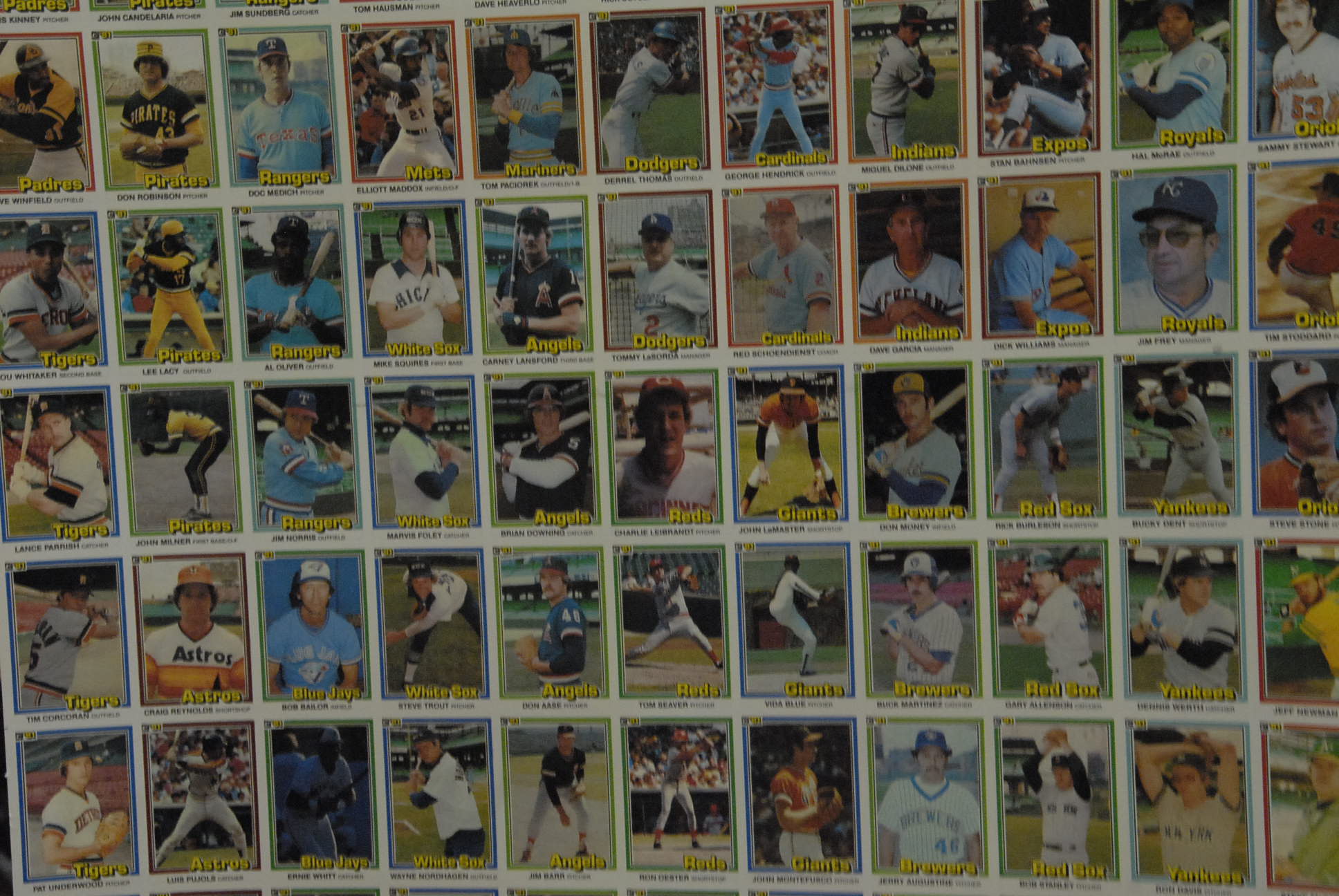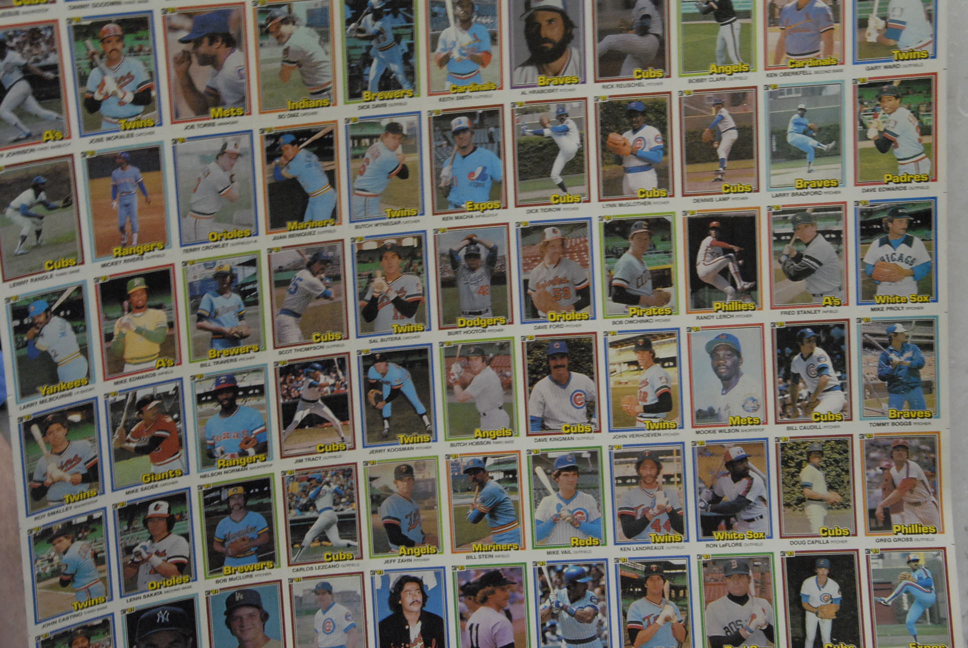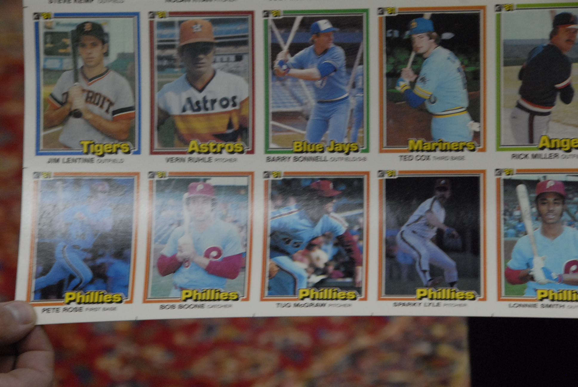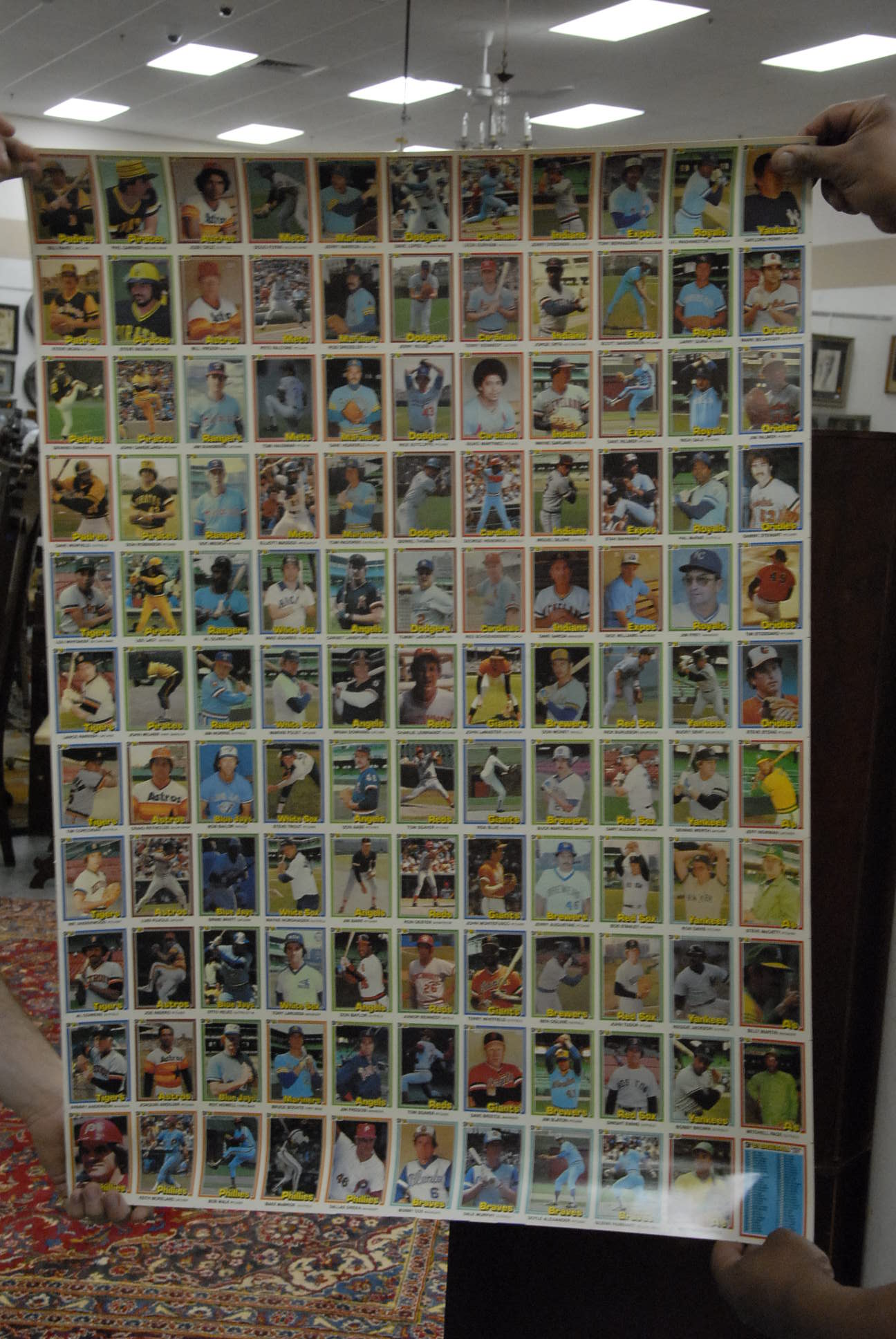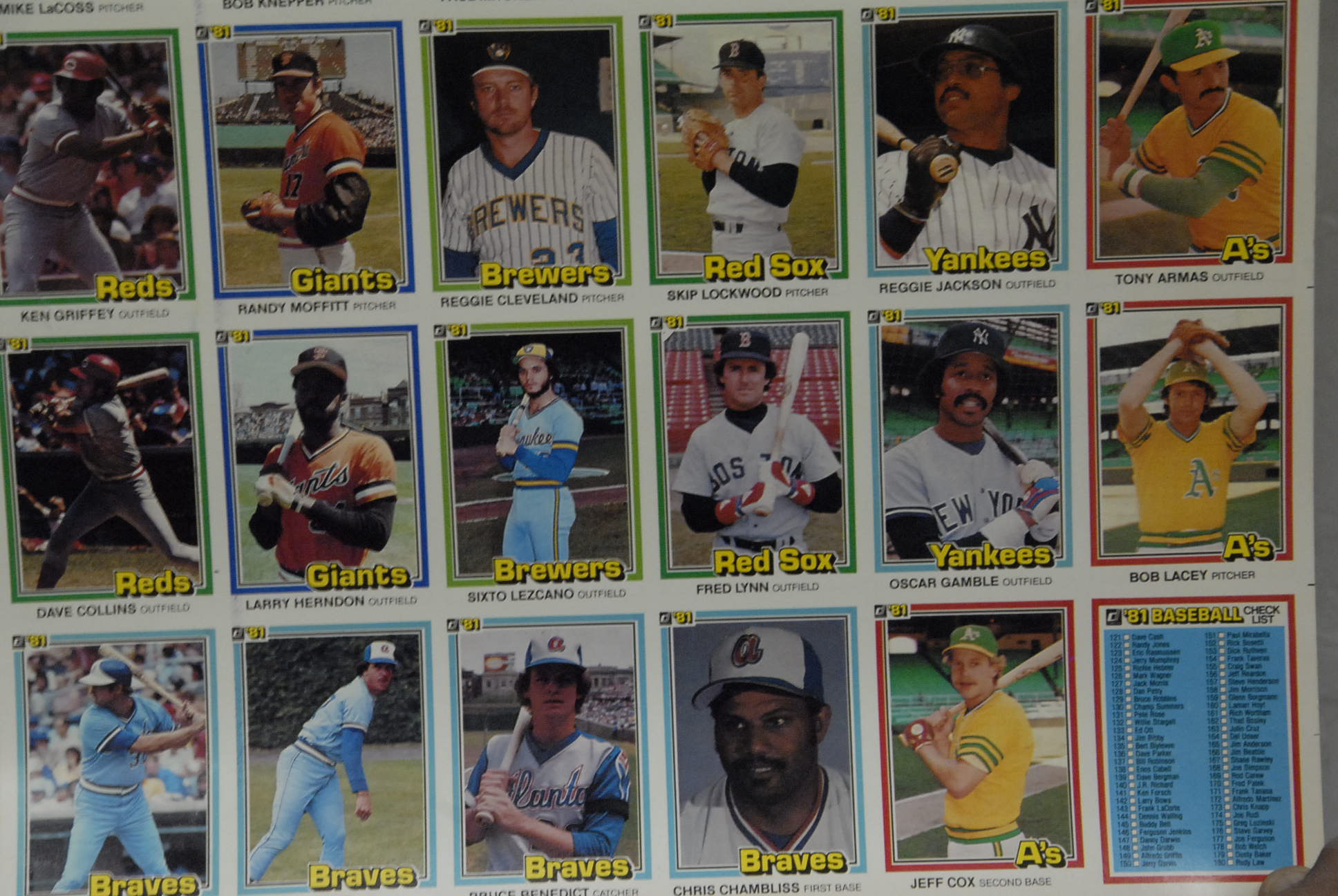 Set of five uncut sheets of 1981 baseball cards to include Pete Rose, Reggie Jackson, etc also with home run king Hank Aaron plaque