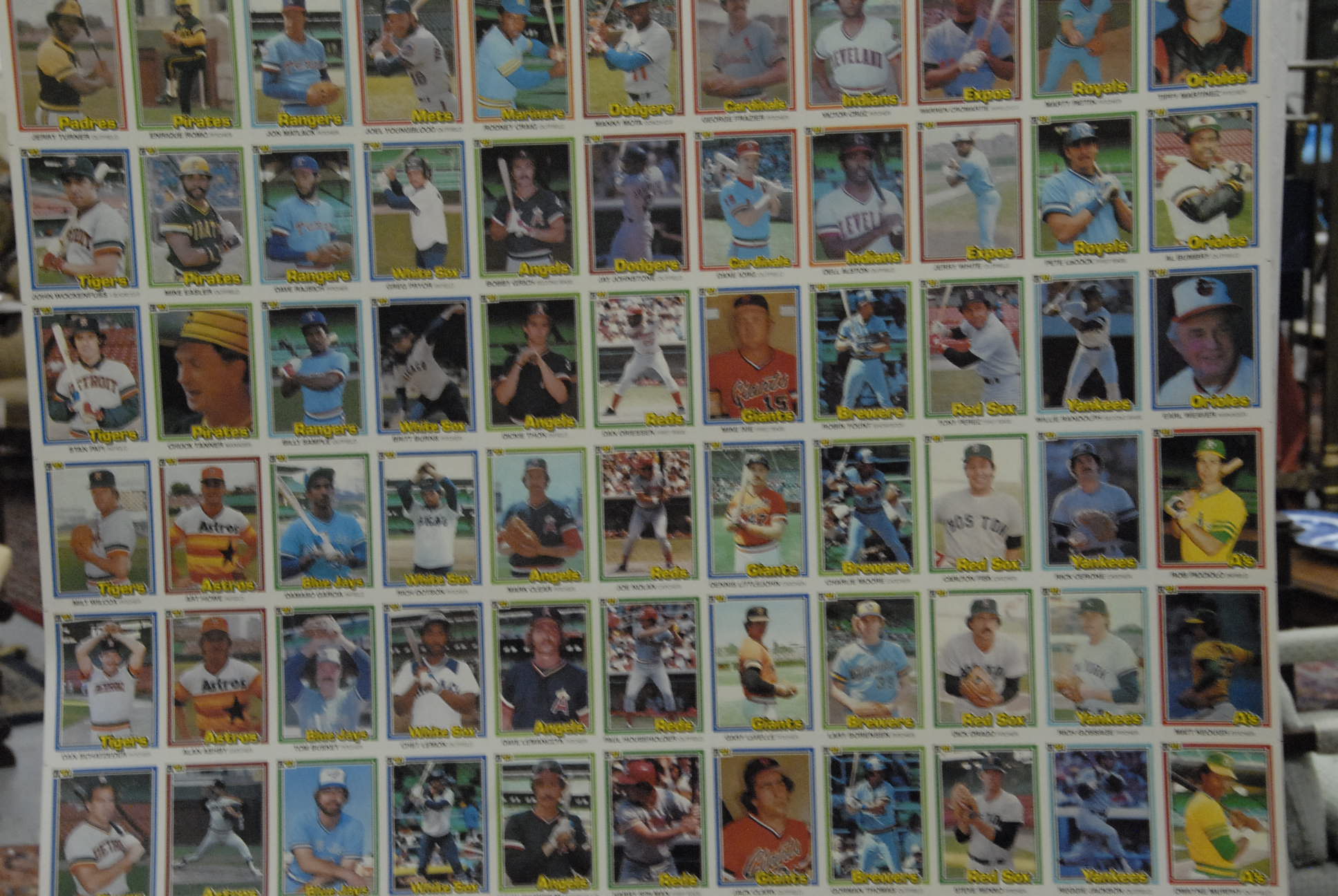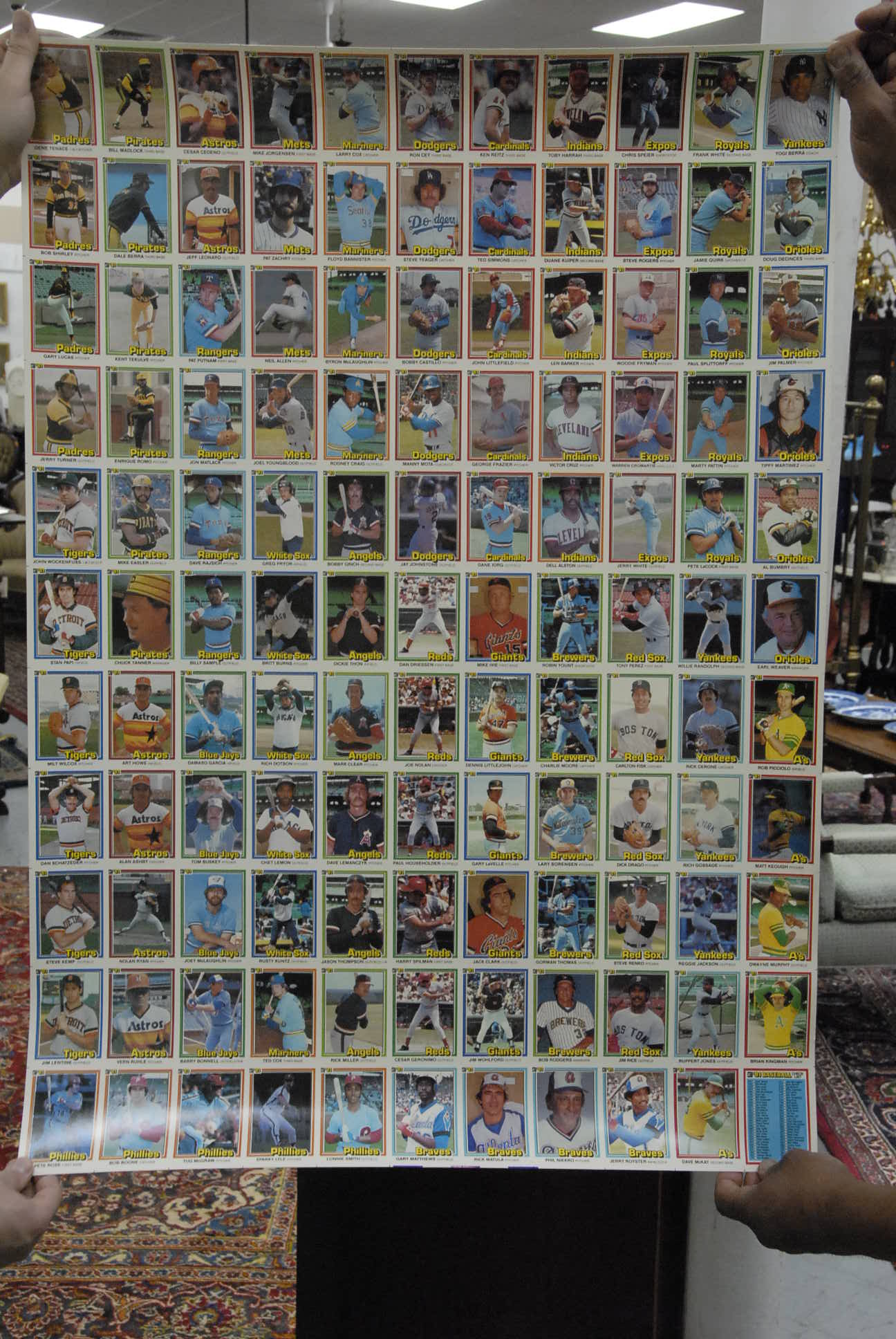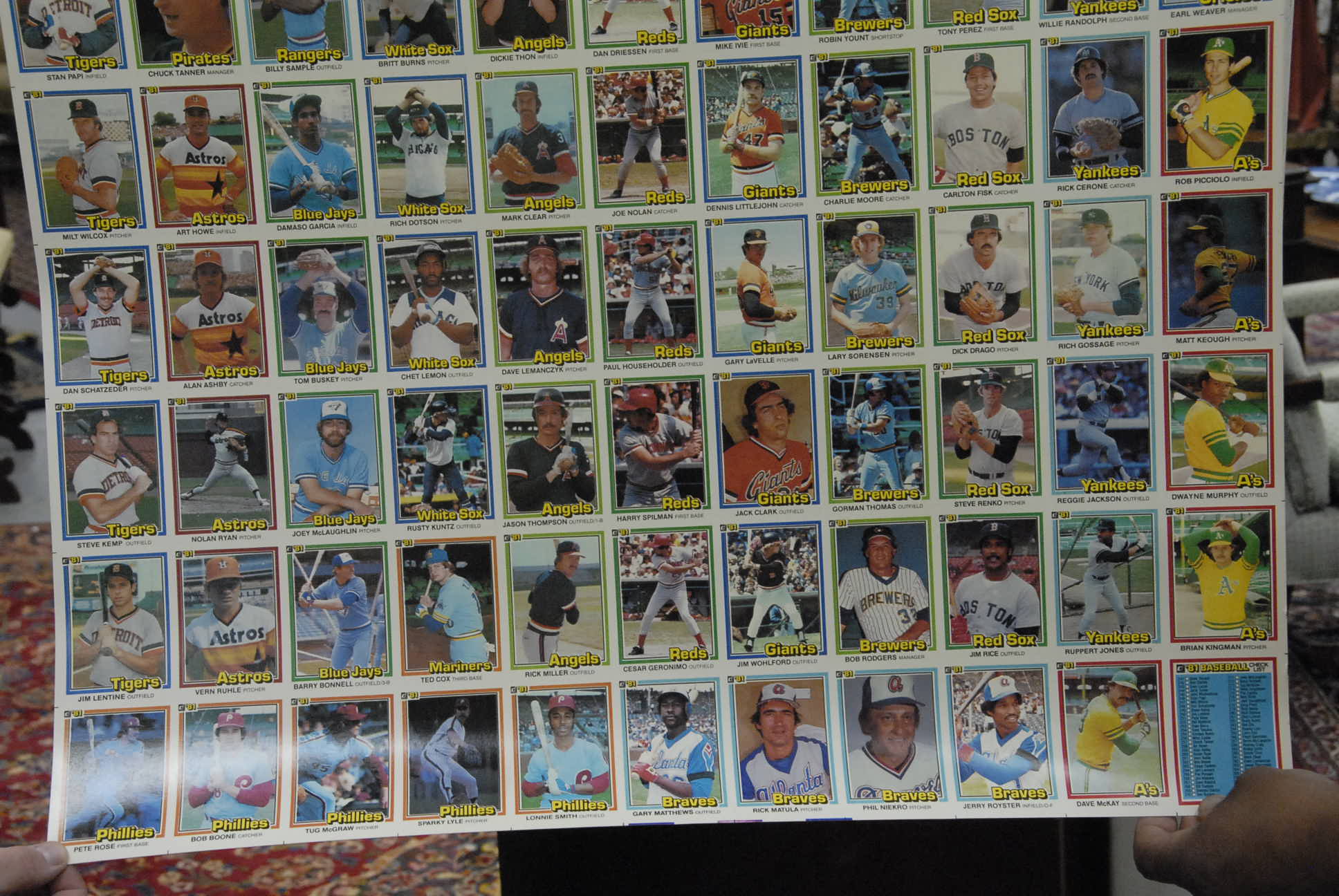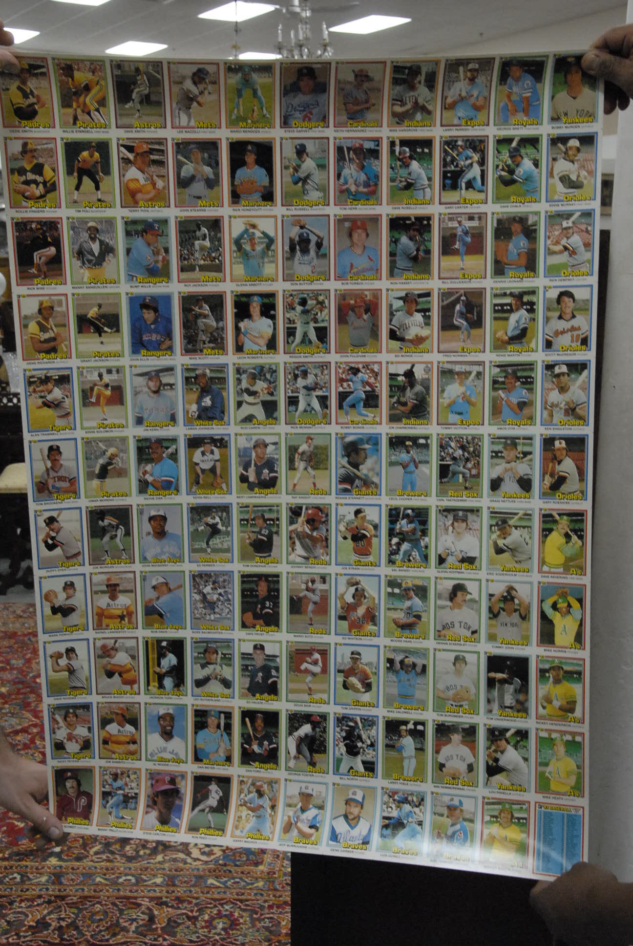 Set of five uncut sheets of 1981 baseball cards to include Pete Rose, Reggie Jackson, etc also with home run king Hank Aaron plaque