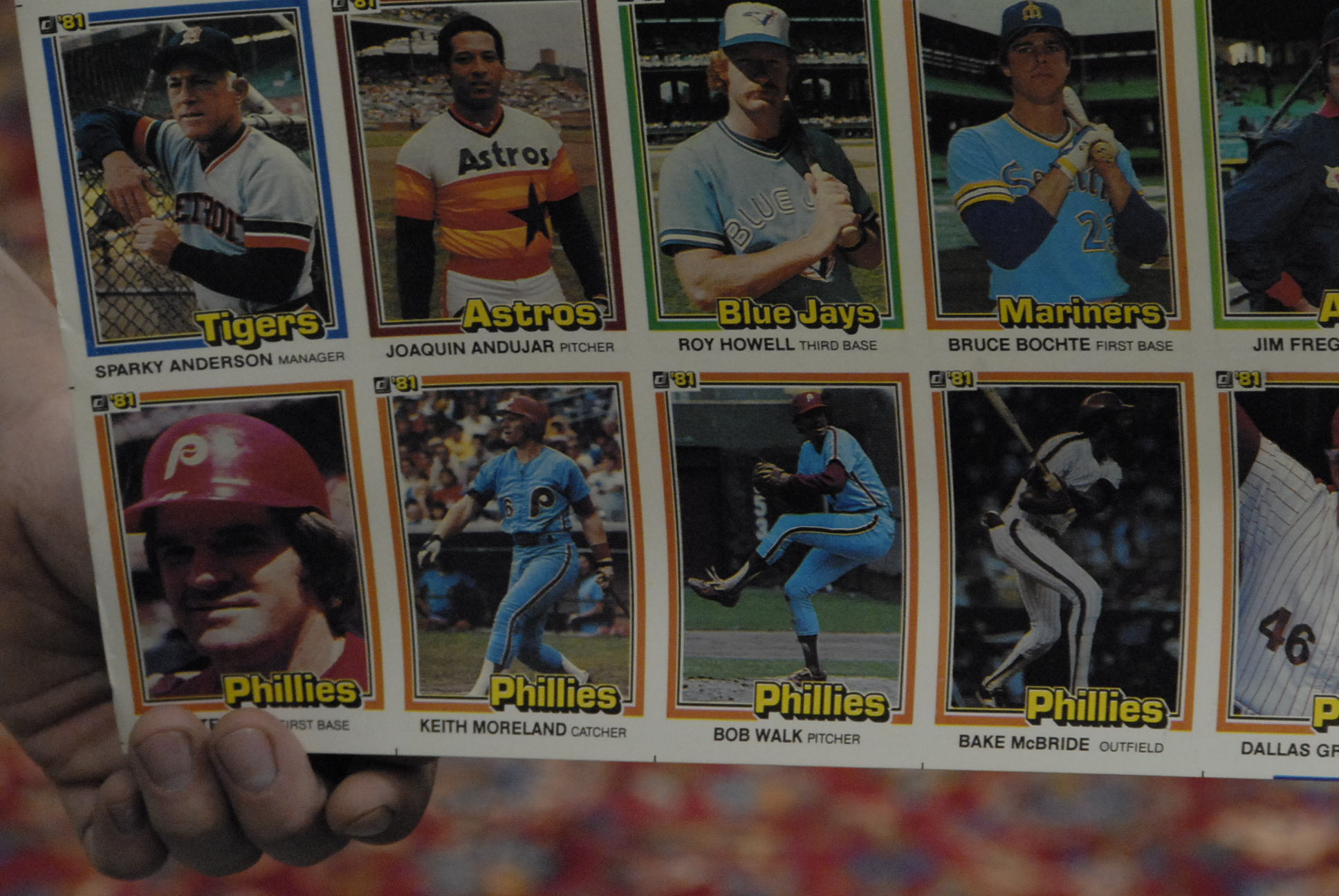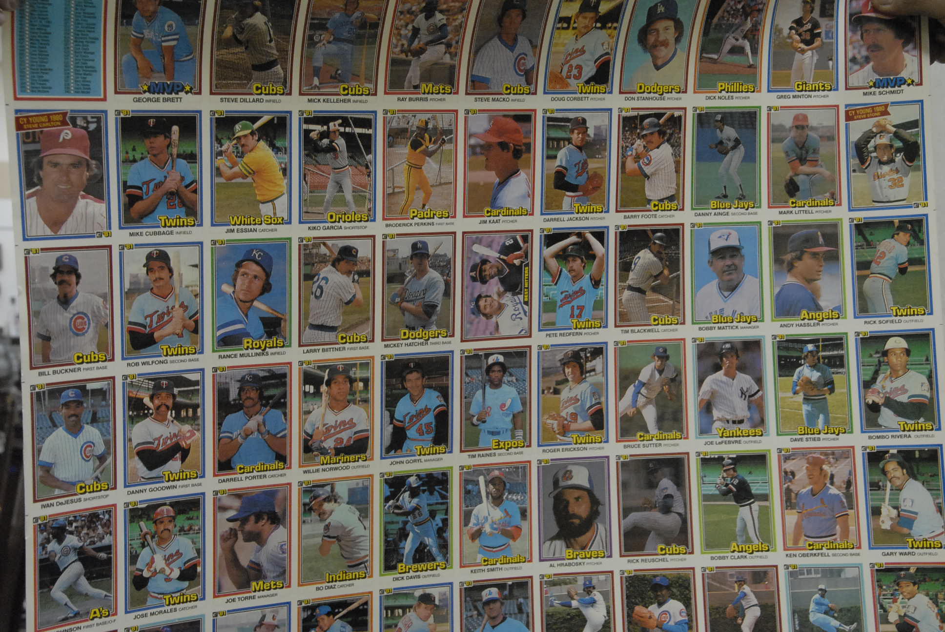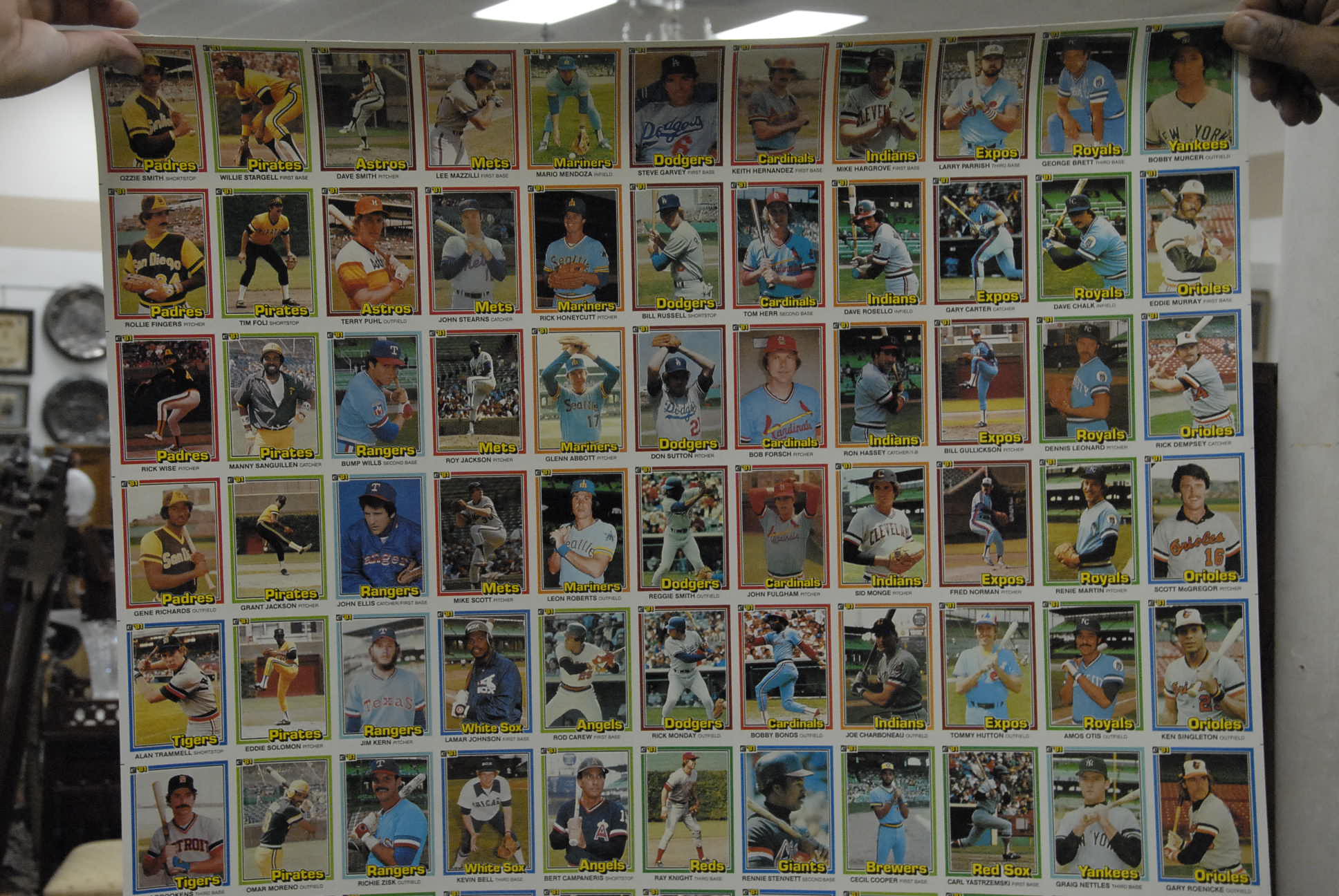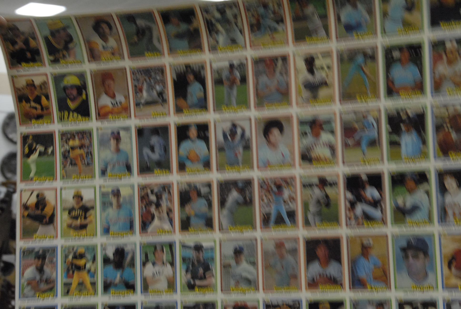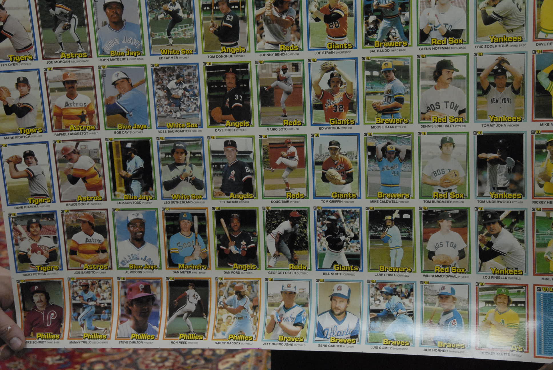 Set of five uncut sheets of 1981 baseball cards to include Pete Rose, Reggie Jackson, etc also with home run king Hank Aaron plaque