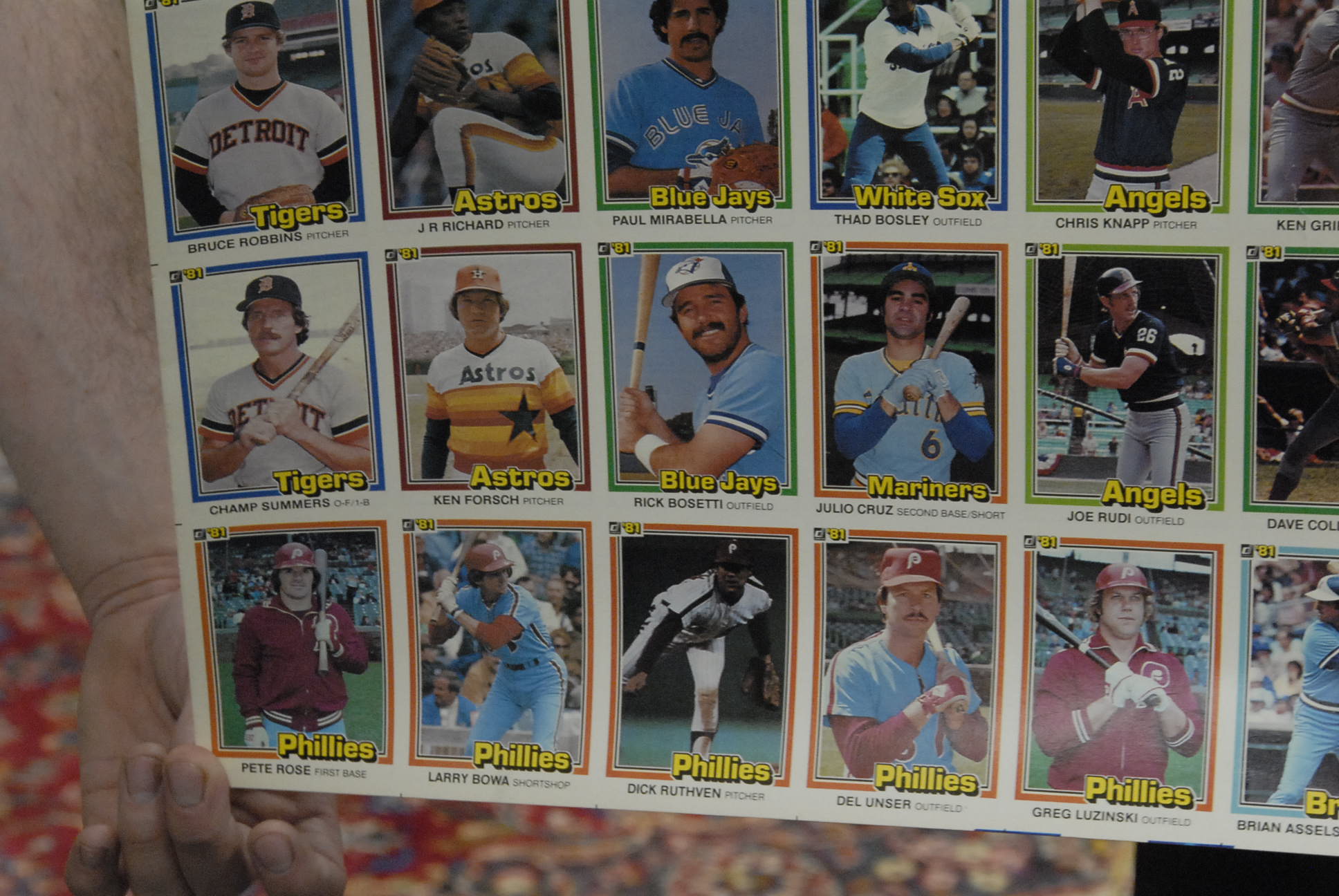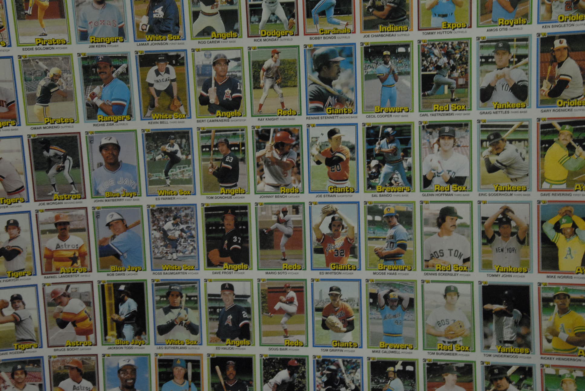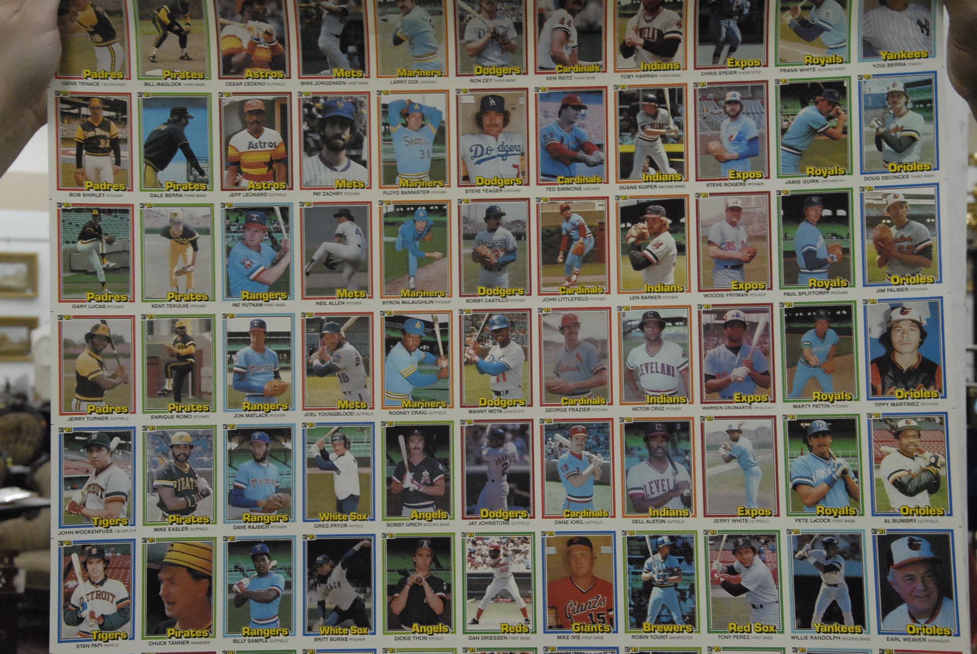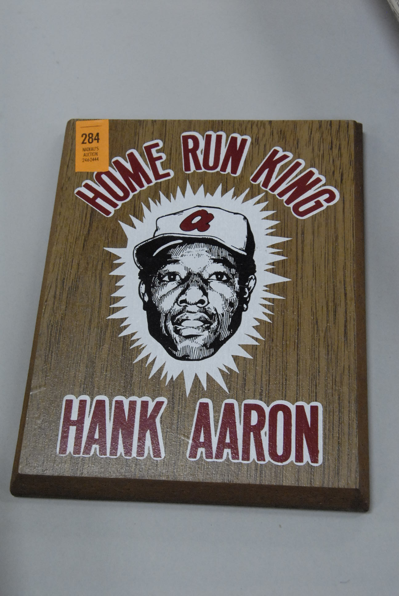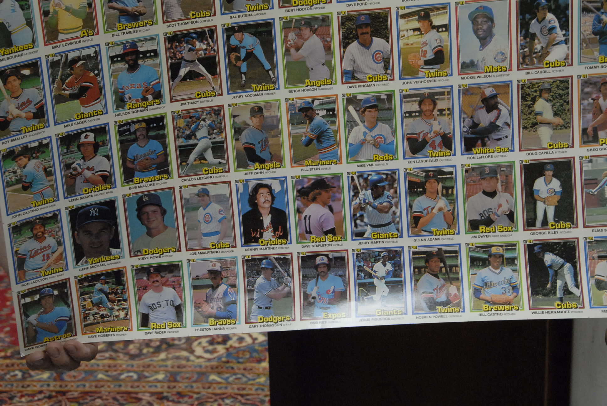 Set of five uncut sheets of 1981 baseball cards to include Pete Rose, Reggie Jackson, etc also with home run king Hank Aaron plaque