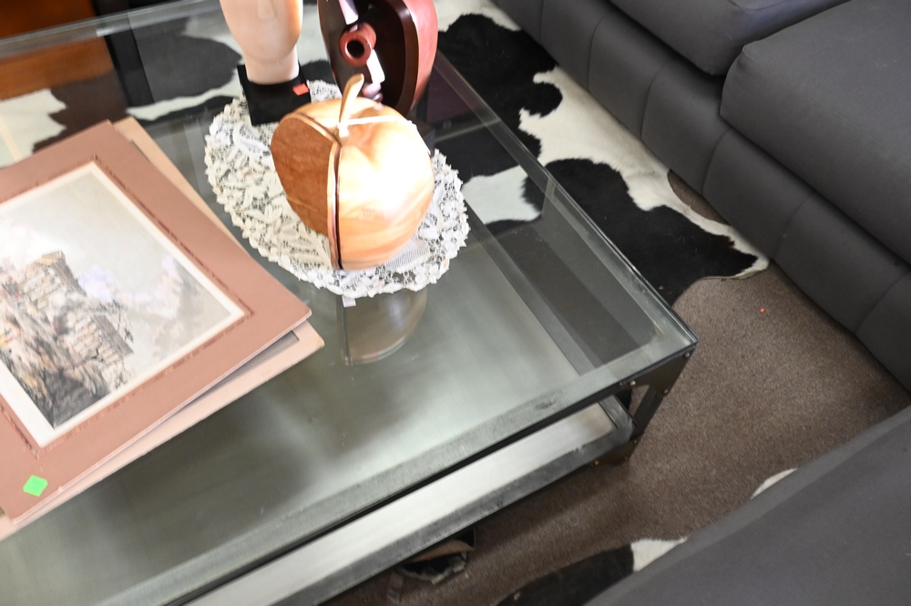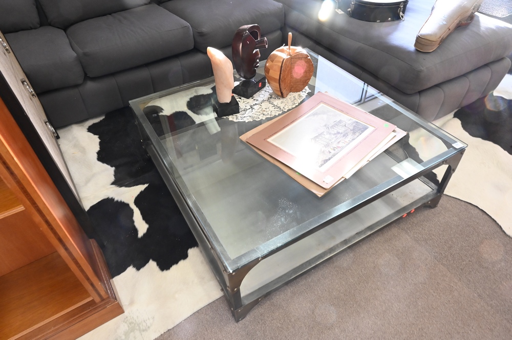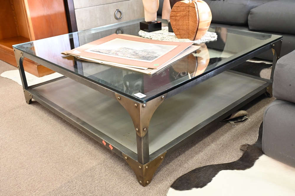 Lot 284: Square Industrial Metal Coffee Table, with glass top, height 14.5 inches, top 42″ x 42″.