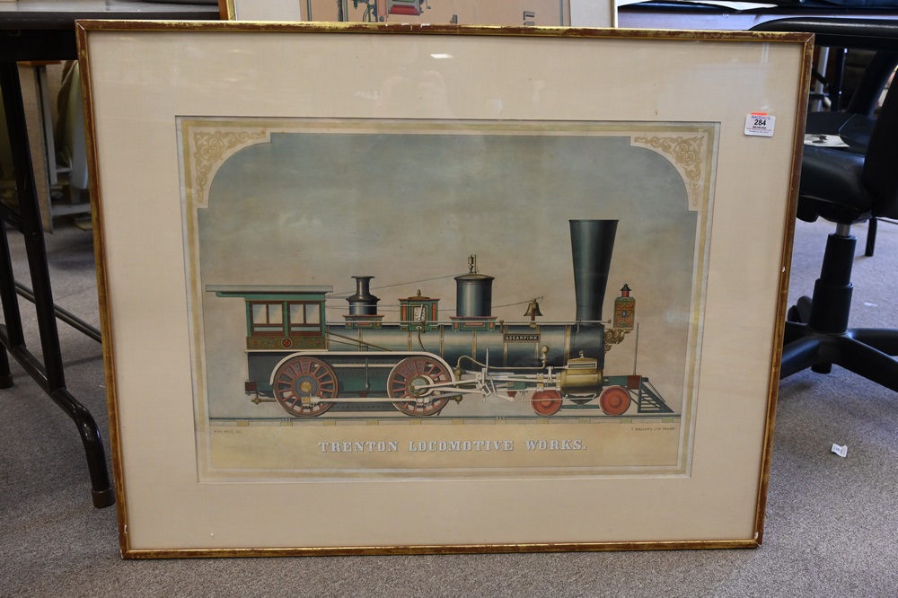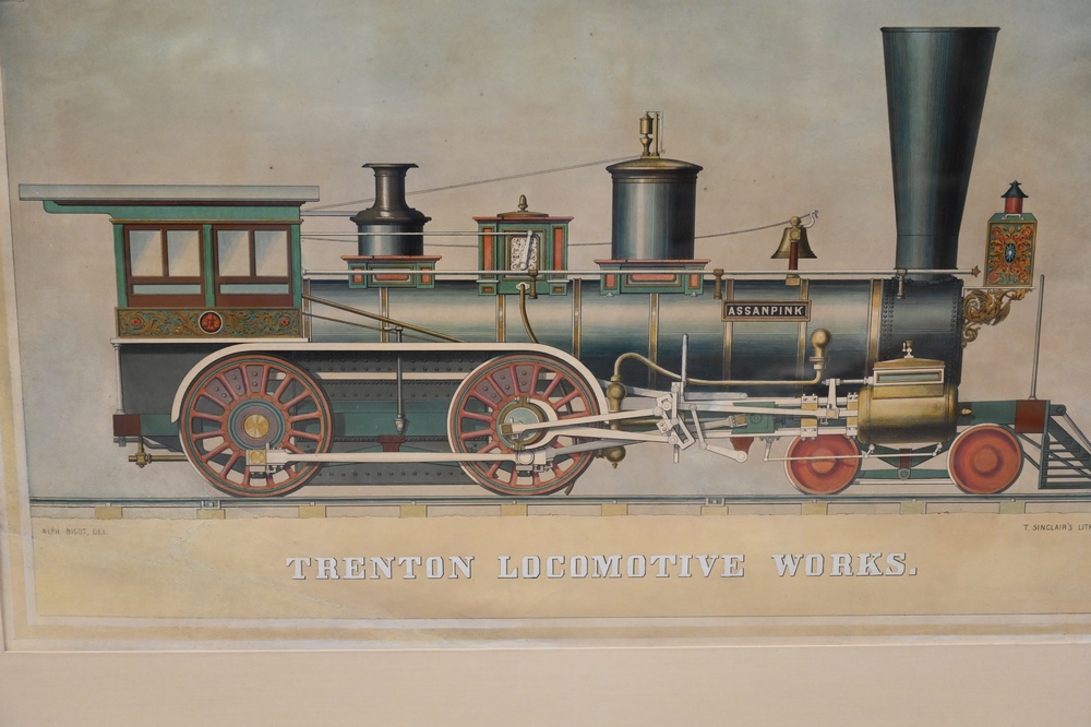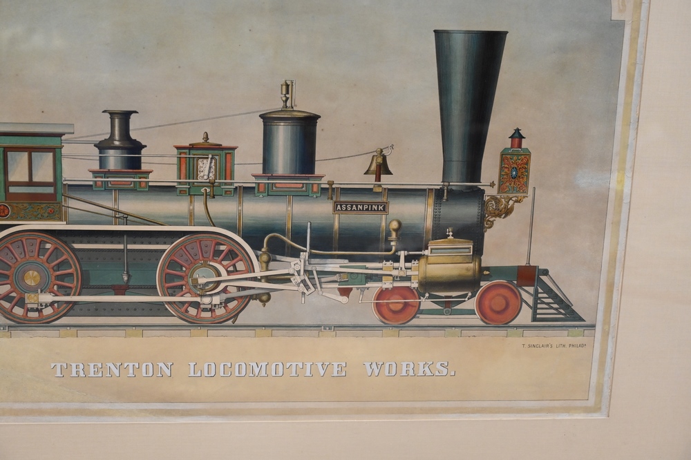 Lot 284: Trenton Locomotive Works Locomotive, “Assunpink”, colored lithograph by T. Sinclairs, sight size 19 1/2 x 27 inches.